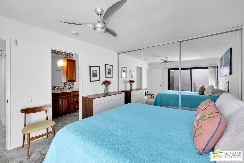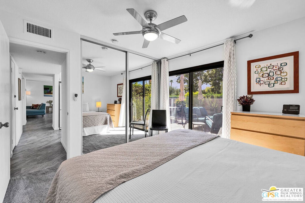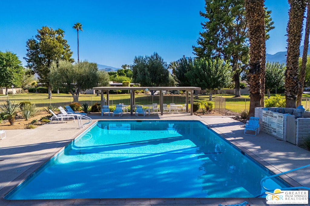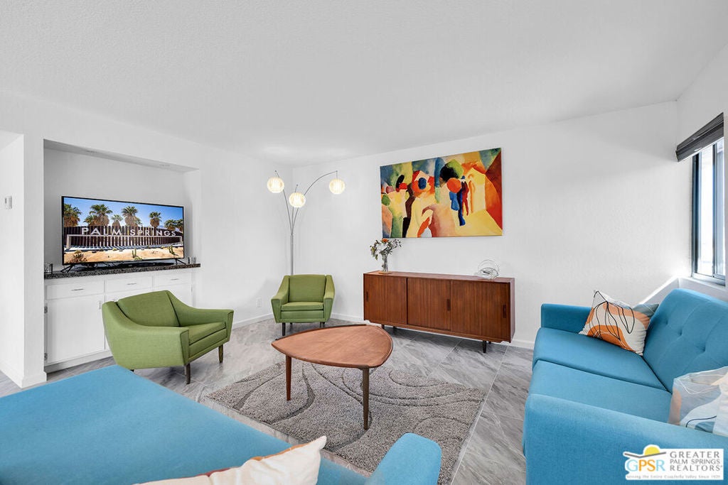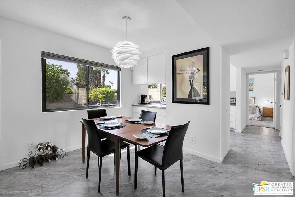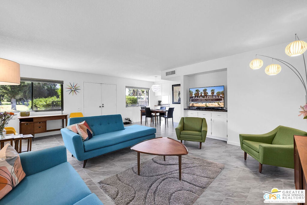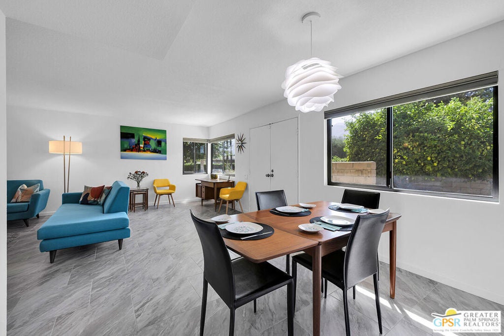 Step into classic Palm Springs style at this Donald Wexler designed mid-century condo in Sagewood, a beautifully spread-out community of just 108 homes across nearly 19 acres. This spacious end unit delivers extra privacy, wide open living space, and jaw-dropping, straight-on west-facing mountain views that never get old. Inside, you'll find three bedrooms (one currently used as a den), two baths, a large open living room / dining room and a well appointed kitchen for the chef in you. This property is offered turnkey furnished. Outside your door, Sagewood's lush greenbelts, desert landscaping, and colorful gardens feel more like a private resort than a condo complex. Spend your days floating in one of three pools, playing tennis or pickleball, and hosting sunset cocktails against the dramatic mountain backdrop. HVAC and water heater were replaced in 2023. HOA fees include water, sewer, cable and high-speed internet. Contact agent for private showing. Per seller, Sagewood is very close to achieving Historical Designation, which would allow new owners to apply for the Mills Act tax reduction.