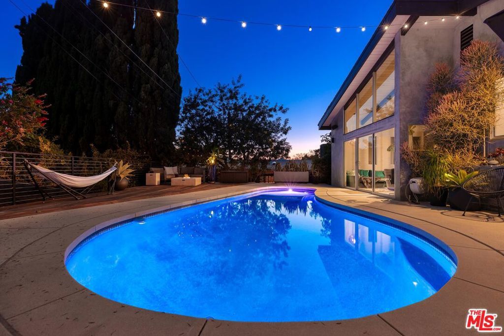 Introducing a mid-century modern residence nestled in the hills above Studio City, offering breathtaking vistas of the mountains and valley. This home is expertly crafted to provide the ultimate luxury living experience. Enter through the grand double door entry to find an open-concept floor plan with natural light pouring in from every angle.Custom poured terrazzo floors and 19-foot exposed beam ceilings add to the home's charm. The living room, with its floor-to-ceiling windows, perfectly frames the incredible views. The spacious dining room featuring a dual-sided fireplace, is ideal for gatherings of friends and family. The custom Pedini kitchen is a chef's dream, complete with high-end Jenn-Air appliances and a large quartz center island, seamlessly connecting to the family room, which also features floor-to-ceiling windows and a sliding door leading to the backyard patio perfect for al fresco dining. The primary suite is a true masterpiece, featuring an oversized picture window, a TV that disappears into the ceiling, blackout blinds, a custom closet, and a spa-like bath with a steam shower, stone soaking tub, and a Toto smart toilet. The two additional bedrooms also have true blackout blinds within-wall channels for complete darkness, custom closets, and share the second full bathroom. The entertainer's backyard is outfitted with a heated salt-water pool, jacuzzi, and fire pit, all while offering captivating views. Designed with integrated smart home technology, the residence includes a Lutron Caseta voice-controlled lighting system, Sonos sound system, Ring security system, whole-home Pelican water softening system, and a fully owned solar energy system for value enhancement and cost savings. Situated just moments from all the dining and shopping along Ventura Blvd and located in the esteemed Carpenter Elementary school district, this home offers a lifestyle you've always dreamed of. Don't miss the opportunity to make it yours.