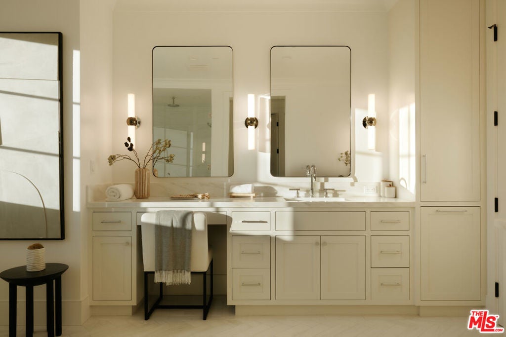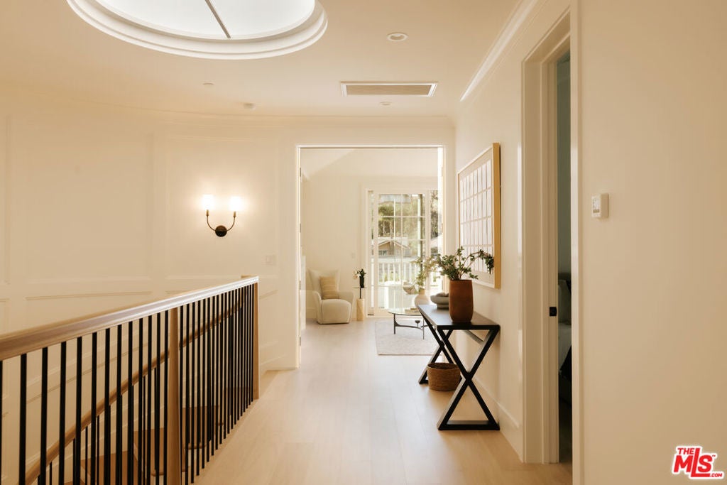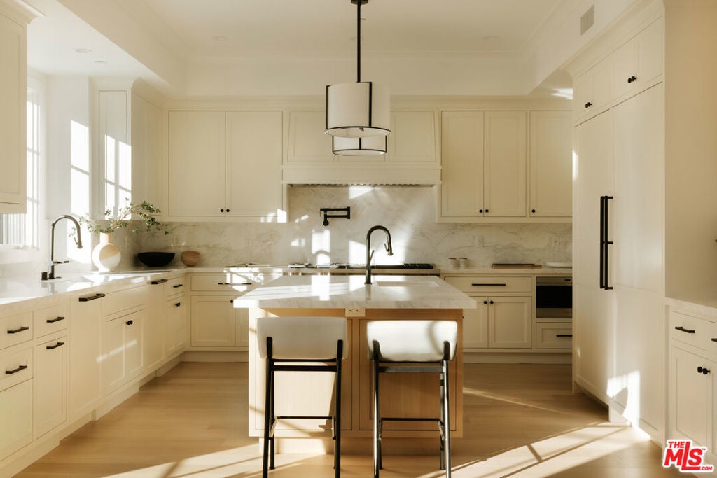 Stunning newly built in 2025, this Brentwood residence is set in a quiet, family-friendly enclave north of Sunset and blends timeless architecture with modern luxury and exceptional livability. Light-filled interiors feature soaring ceilings, wide-plank oak floors, custom cabinetry, and refined architectural detailing throughout. The chef's kitchen anchors the main level with top-tier Wolf and Sub-Zero appliances, an oversized marble island, walk-in pantry, and breakfast nook opening seamlessly to the backyard ideal for both everyday living and entertaining. The thoughtfully designed floor plan offers four en-suite bedrooms upstairs, highlighted by a serene primary suite with fireplace, private balcony, coffee bar, and spa-like bath, along with an additional en-suite bedroom on the main level. A statement staircase and private elevator connect all levels, while two laundry rooms on the upper and lower levels add everyday convenience. The lower level is a true extension of the home, featuring a home theater, gym with sauna, wet bar, game room, and guest suite. Outdoors, resort-style grounds include a heated pool and spa, patio, and manicured lawn. A fully permitted detached guest house with kitchenette provides exceptional flexibility for guests, office, or extended family. Private, secure, and impeccably executed, this is a turnkey opportunity in one of Brentwood's most desirable neighborhoods.