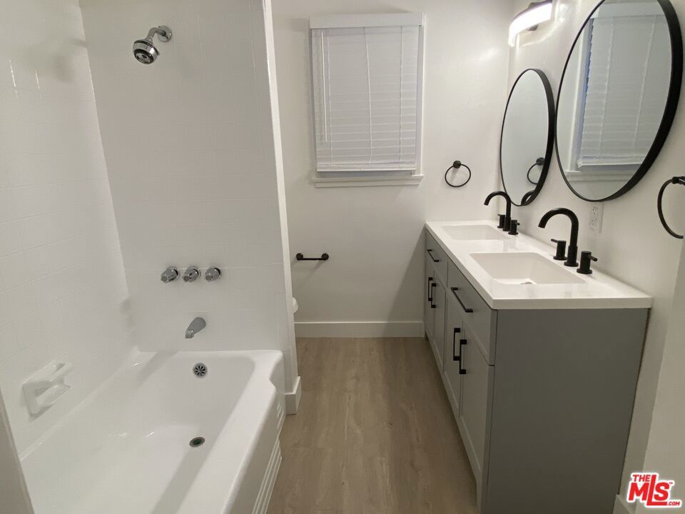Experience this spacious, updated and freshly painted 2-bedroom duplex apartment for lease in prime West LA. It features a private, direct-access garage with an automatic door and newly refinished, stunning hardwood floors throughout most of the home. Enjoy new heating units, ceiling fans, and window treatments in a home that is set way back from the street for added privacy. The bright living room includes a bay window and flows into the dining area. The kitchen offers generous cabinet and counter space, sparkling newly resurfaced countertops, double sinks, disposal, and a full set of gas appliances. It opens to a charming side patio ideal for outdoor dining and barbecues. The large primary bedroom provides ample space for a bed, office, and/or sitting area, with new ceiling fan, door hardware, and both wardrobe and walk-in closets. The second bedroom also features a wide bed wall, new ceiling fan, and spacious closet with updated hardware. The remodeled bathroom includes double sinks with new cabinets and hardware, new mirrors, a new commode, and a re-enameled tub and tile surround. 2616 Barrington Ave. offers a sunlit, spacious living environment that is super close to all that the Westside has to offer and easy access to the 405 and 10 freeways. All of this at a competitive price.