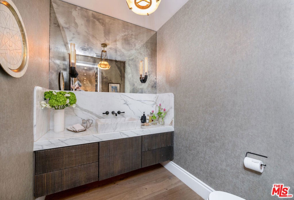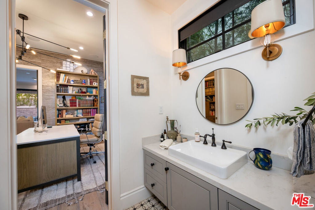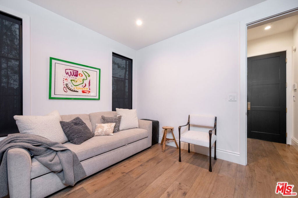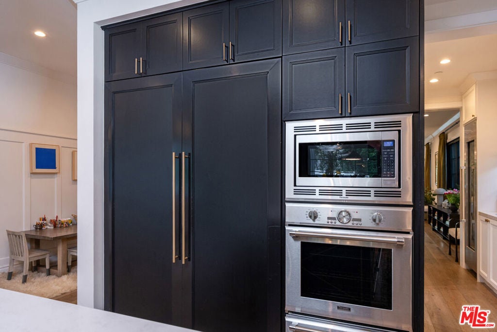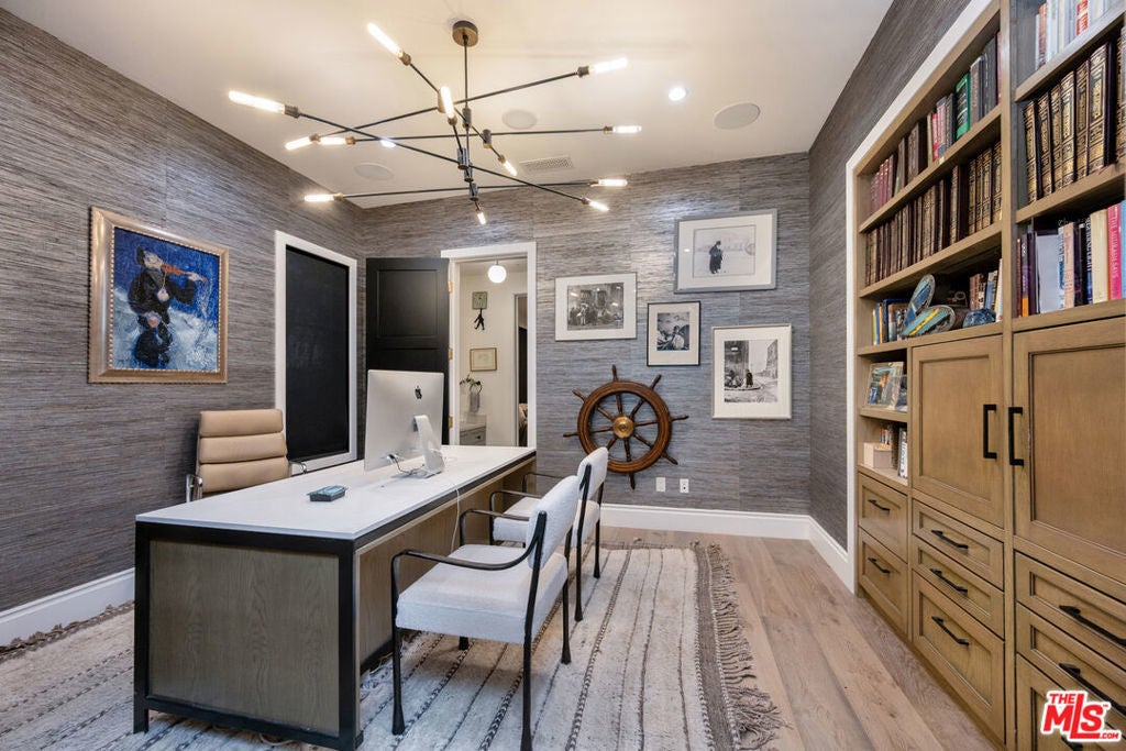 Beautifully designed and impeccably built in 2017, this mint-condition private 6-bedroom, 6-bath smart home is ideally located in the heart of Beverly Grove, offering the perfect blend of traditional charm and contemporary sophistication. From the moment you enter, the home exudes a warm and inviting ambiance, thoughtfully crafted for both comfortable everyday living and elegant entertaining.The first floor features expansive formal living and dining spaces creating an effortless sense of openness and comfort. At the heart of the home is an exceptional custom eat-in kitchen, complete with a large walk-in pantry and a 100-bottle wine refrigerator. The kitchen flows seamlessly into an inviting great room with 20-foot stackable bi-fold doors, opening to a spacious covered patio for true indoor-outdoor living.The main level also includes two generously sized bedrooms with en-suite baths and a stylish powder room. Upstairs, three additional en-suite bedrooms with ample closets provide comfort and privacy, while the stunning primary suite serves as a peaceful retreat, showcasing dramatic volume, 14-foot vaulted ceilings, a massive walk-in closet, a luxurious spa-like bath, and a private patio overlooking the backyard.The meticulously maintained grounds feel like a private resort, featuring a large grassy yard, trellised outdoor dining area, and a sparkling pool with waterfall, Baja shelf, and spa. This move-in ready home, maintained in pristine mint condition, offers the ultimate warm and welcoming lifestyle in one of Los Angeles' most sought-after neighborhoods.
