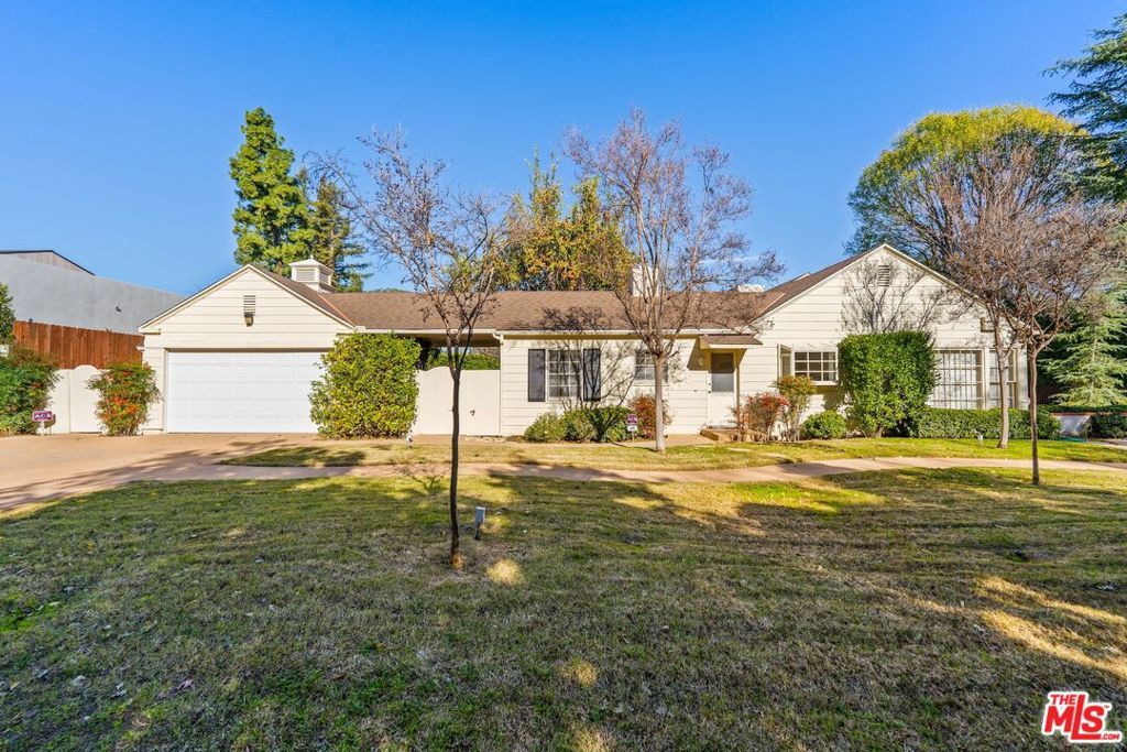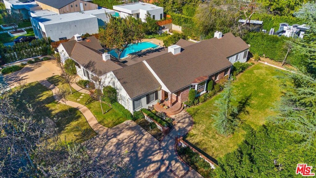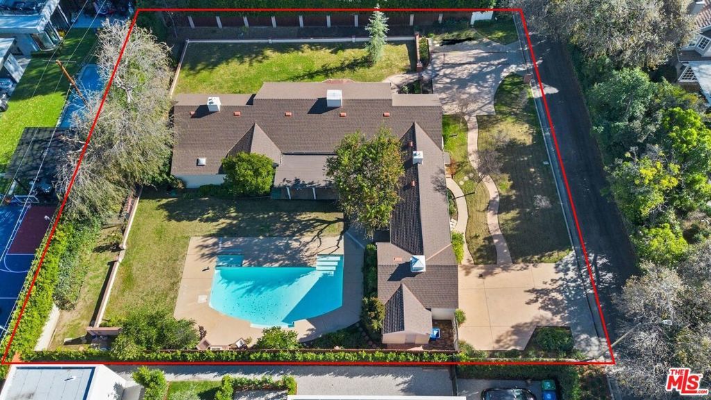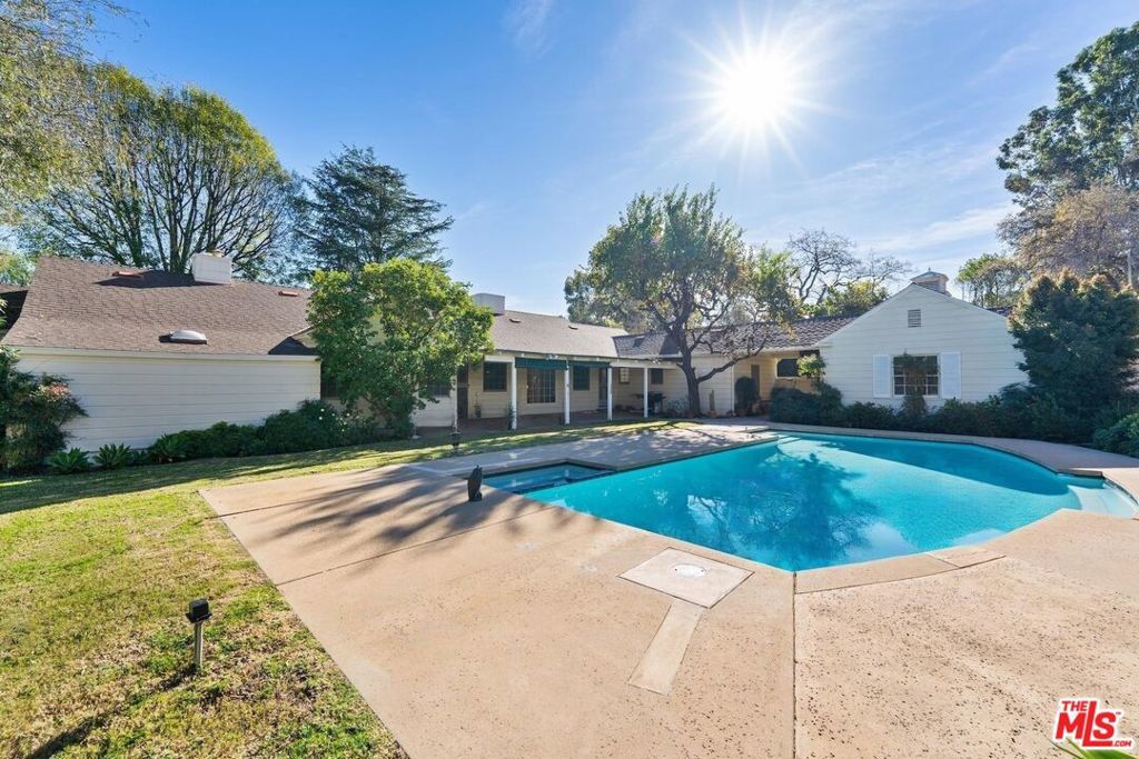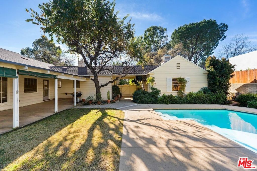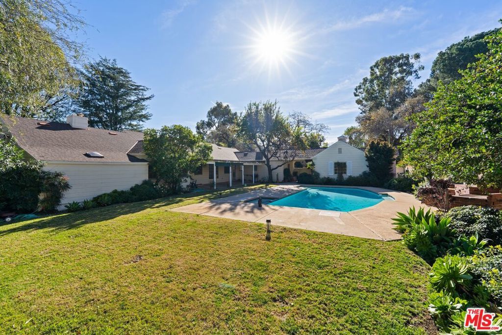 Rare opportunity in the highly sought-after Amestoy Estates of prime Encino. This exceptional single-story, 4-bedroom, 3-bath home is beautifully set on a large, lushly landscaped lot, offering privacy, space, and effortless indoor-outdoor living. The home is surrounded by expansive grassy yards one side featuring a generous lawn, and the other designed for entertaining with a sparkling pool and spa, covered patio, additional grass area, and even a dedicated dog run at the rear of the property. Nearly every room enjoys serene views of the surrounding greenery, creating a peaceful, light-filled atmosphere throughout. Hardwood floors grace most of the home, complementing a well-designed floor plan with an easy, natural flow ideal for both everyday living and entertaining. The primary suite is a true retreat, featuring a dressing/closet area, an impressive oversized walk-in closet, and a private en-suite bathroom. The additional bedrooms offer lovely outdoor views and ample closet space. The spacious living room welcomes you with high ceilings, custom built-ins, and a large bay window that anchors the home's warm, inviting feel. The family room overlooks the pool and covered patio and includes a floor-to-ceiling built-in desk and bookcase wall, plus space for a game table and additional cabinetry perfect for work and play. A private dining room with windows on two sides is filled with natural light, while the eat-in kitchen connects seamlessly to the in-house laundry room. This area also provides convenient access to the fourth bedroom and third bathroom, ideal for guests or a home office. The property features a private front-facing garage, along with abundant space for additional vehicles and guest parking. Located in a wonderful walking-friendly neighborhood, this home offers comfort, style, and an unbeatable Amestoy Estates lifestyle. Easy to show your clients will truly love calling this place home.