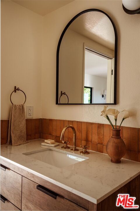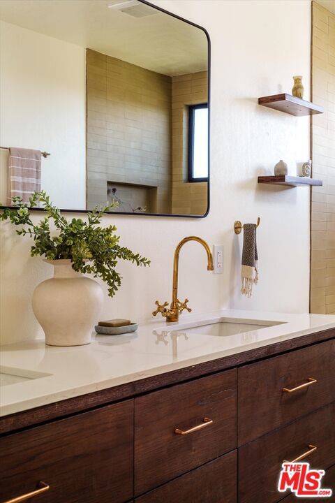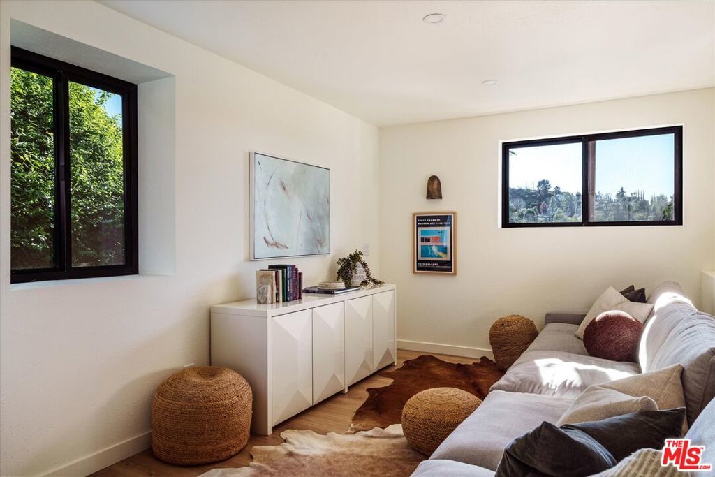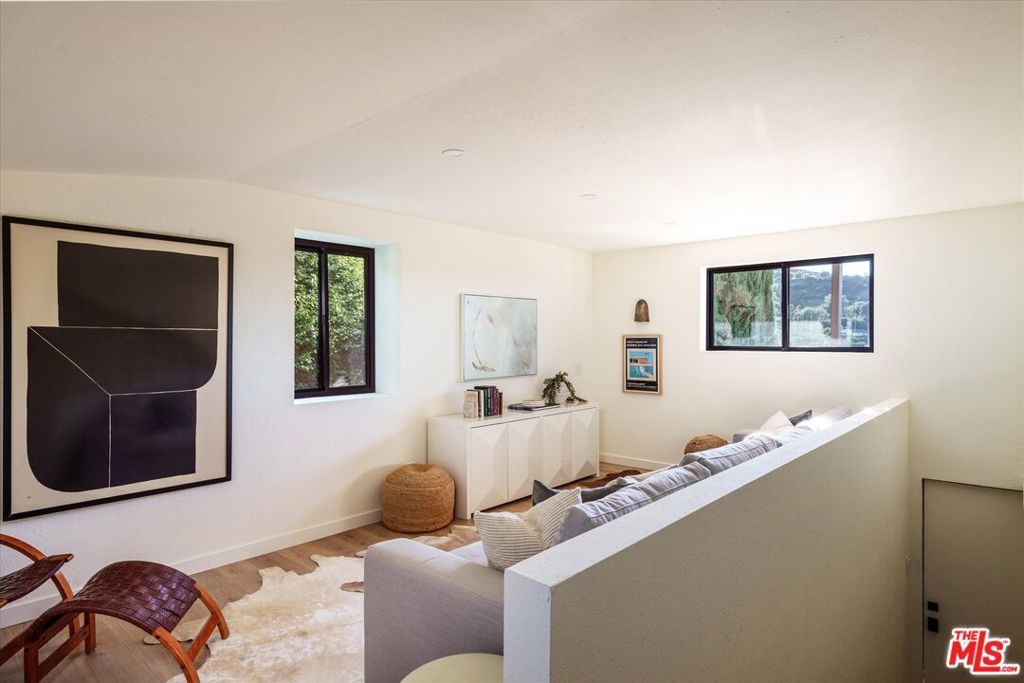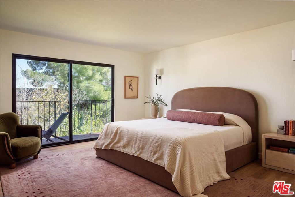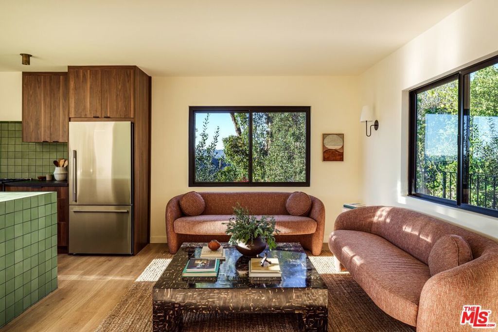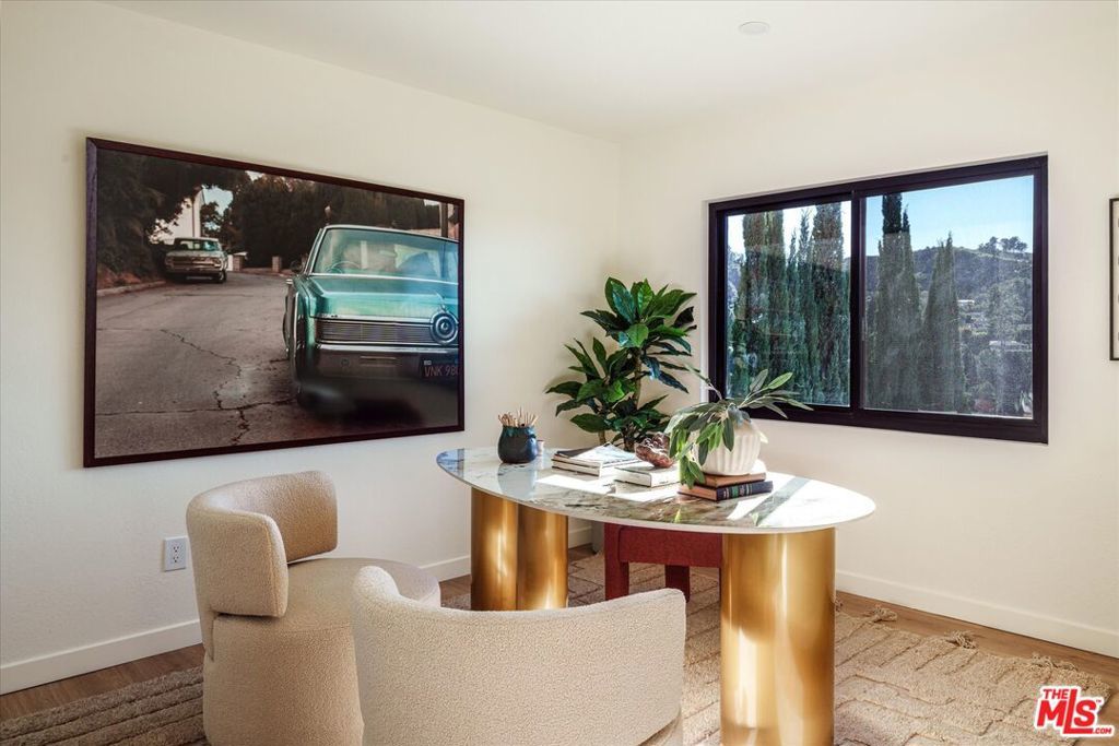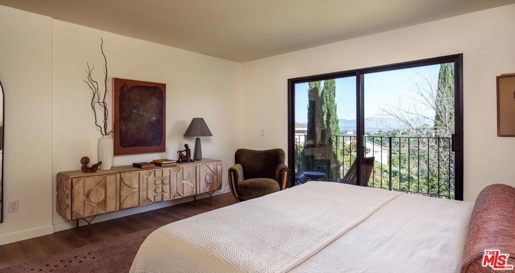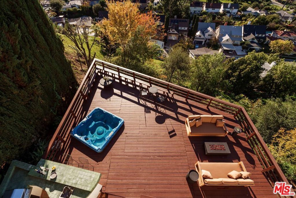 Designer Spanish home by Decente Designs perched at the top of the hill flush with natural light and panoramic views from every room. Flanked by greenery and gardens with exceptional privacy, the main level features a reclaimed antique entry door with iron hardware. Enter into the fully remodeled home to find all new flooring, bespoke light fixtures, new finishes, stunning deep views out of every new window and sliding glass door, with thoughtful and stylish touches throughout. The kitchen features granite countertops, walnut cabinetry, bronze hardware, tile backsplash and island, brass light fixtures, new appliances, accented by open shelving and natural light. Off of the kitchen opposite the sitting area is a built-in breakfast nook looking out to the large deck with al fresco dining and lounging overlooking the expansive hillside views in complete privacy. Through the arched doorways there is a formal dining room complete with fireplace clad in stunning cotto tile, adjacent to that a classic step down spanish living room featuring a custom fireplace and flanked by wall sconces and large windows. Upstairs the bedroom level features a built-in sitting nook under a view window at the top of the staircase and a generous primary bedroom with its own vbalcony, walk-in closet, and en suite bathroom. The primary bathroom is highlighted by limestone flooring, custom cement tile shower with brass hardware, and a double vanity with artisanal light fixtures. The three guest bedrooms and additional guest bathroom, all with stunning views, complete the bedroom floor. Downstairs there is a den off of the larger second deck which has a tiled built-in exterior kitchen area and built-in hot tub all in complete privacy with 180 degree deep views of the surrounding green hillsides. Direct entry two car garage, secluded yard areas on either side of the home, and just a short drive to markets, restaurants, coffee shops, hikes, and more at the bottom of the hill. A special home in the Los Angeles hills awash in natural light and greenery.