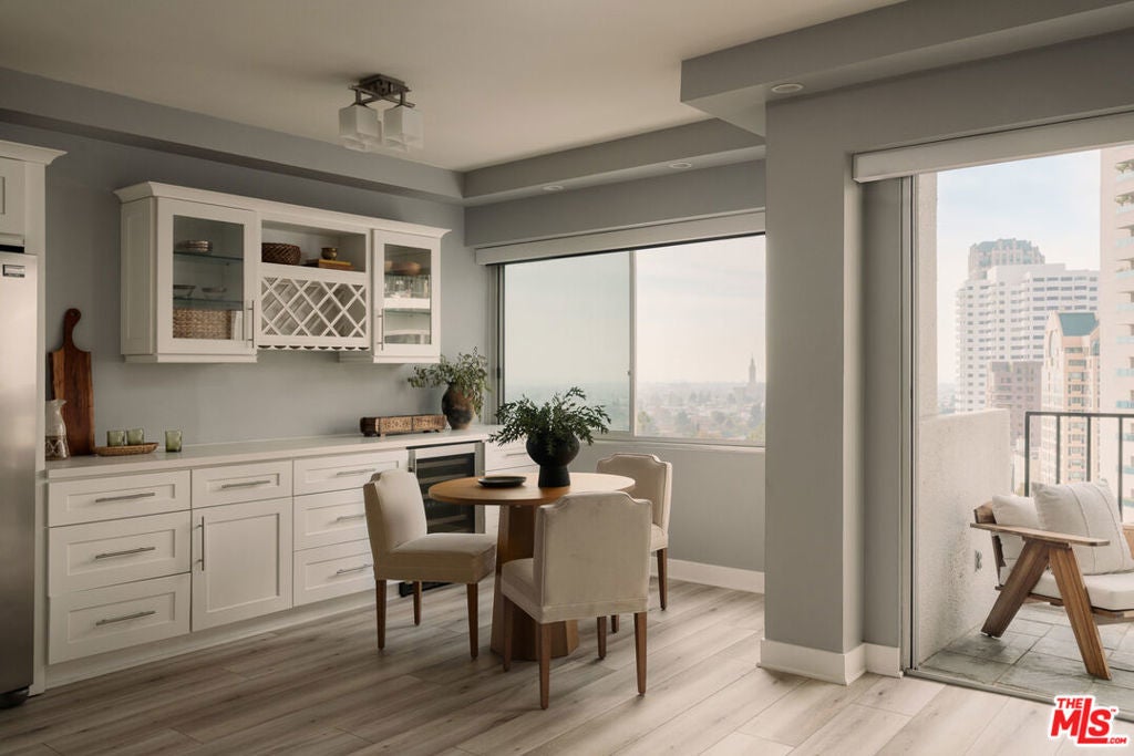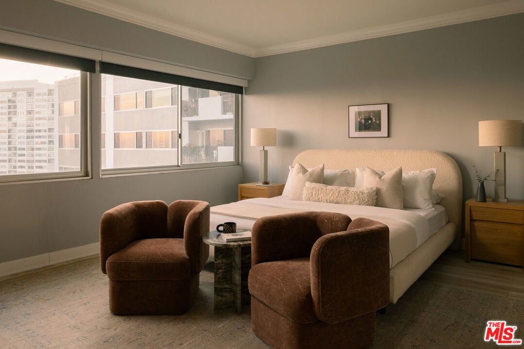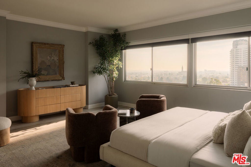 Welcome to The Churchill, a full-service Mid-Century building on the Wilshire Corridor, where this expansive 12th-floor residence enjoys sweeping southwest views and a tranquil rear location. Wake up to remarkable vistas stretching toward the ocean or enjoy dinner on your balcony as the sun sets over the Corridor. This completely remodeled home features one bedroom, one bathroom, and an open-plan living and dining area. The updated and expanded cook's kitchen includes Caesarstone counters, stainless-steel appliances, in-unit laundry, and additional cabinetry with a wine refrigerator, all opening to a sitting area, dining space, and the main living room. The oversized bedroom offers abundant space for both a desk and a sitting area. The Churchill is a pet-friendly building, welcoming cats and small dogs. Amenities include 24-hour security, valet parking, a fitness center, sauna, recreation room, extra storage, and one of the best pools on the Corridor. HOA dues are $1,281 per month and include all utilities, cable, and building amenities. Centrally located near UCLA and Westwood Village.