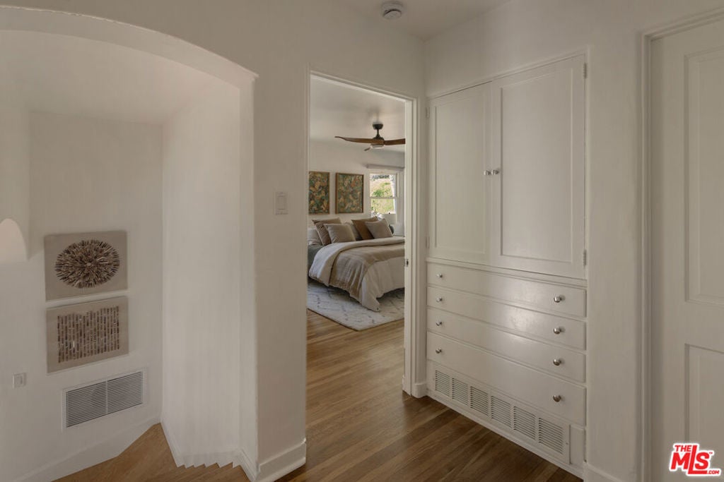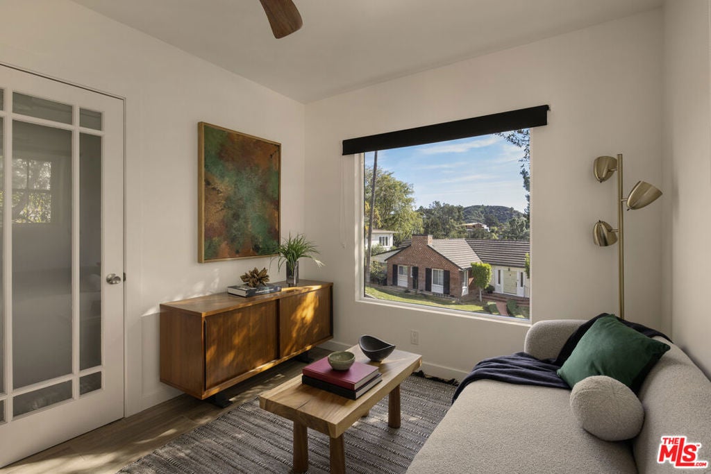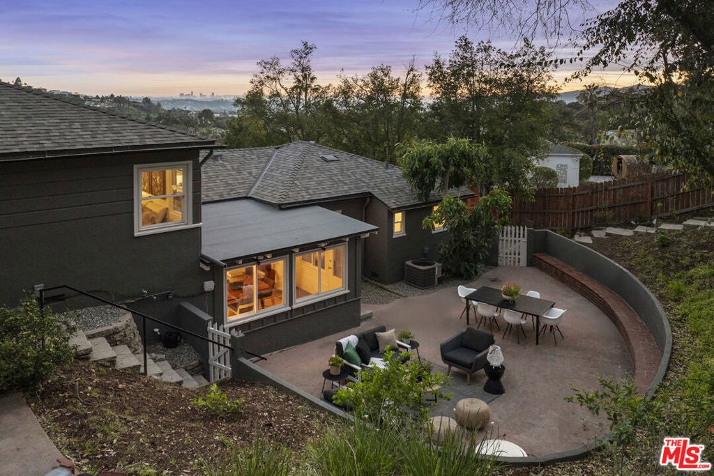 Breathtaking panoramic views and unlimited potential: A rare, remodeled view home in Glendale's Royal Canyon/Greenbriar enclave, built in the Art Deco era with a feel of early mid-century hillside architecture. This magical, light-filled residence features a spacious living room with fireplace, oversized windows with expansive canyon and city views, preserved original wood flooring and a modern chef's kitchen that integrates seamlessly with the home's vintage character. Large kitchen windows frame picturesque slopes and Downtown Los Angeles views on one side and open up to serene backyard views on the other, creating a warm and functional gathering space. Primary bedroom offers two walk-in closets, while the hallway provides exceptional built-in storage. Set on a secluded, street-to-street 1/4+ acre lot, the terraced backyard is private, peaceful and lush, with mature trees, newly planted fruit trees, a vegetable garden, observation/view deck and a Hot Spring spa. The main house includes 2 bedrooms and 2 bathrooms and is complemented by a well laid out, fully functional and soundproofed Jr. ADU with 1 bedroom, 1 bathroom, living room with views and a private entrance and patio. Current configuration supports multi-generational living, extended family or friends visits, private and peaceful home office, artist studio or music studio, supplemental income potential or re-open the original doorway to reconfigure into a 3-bedroom, 3-bathroom home with a bonus den. Additional flexibility is offered by a unique walk-in basement with potential to build out storage or entertainment space. Verify with the City of Glendale possibility to build an ADU at the top of the lot, where the elevated setting offers spectacular views and direct street access.