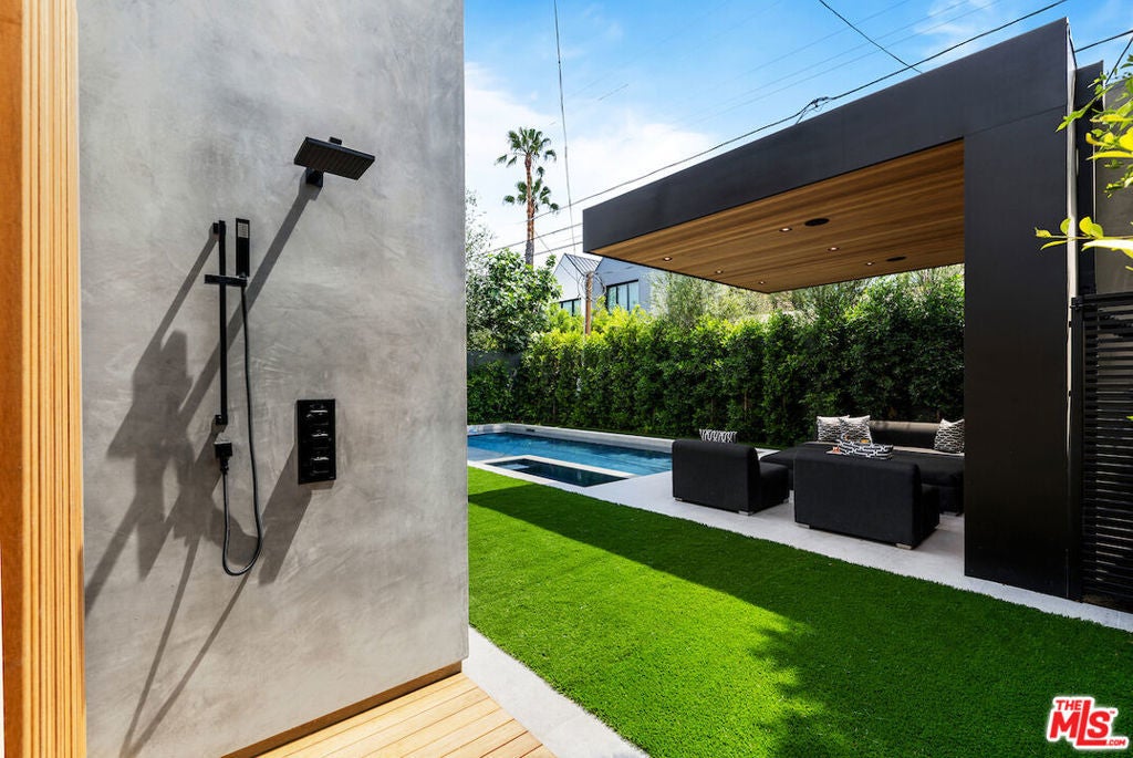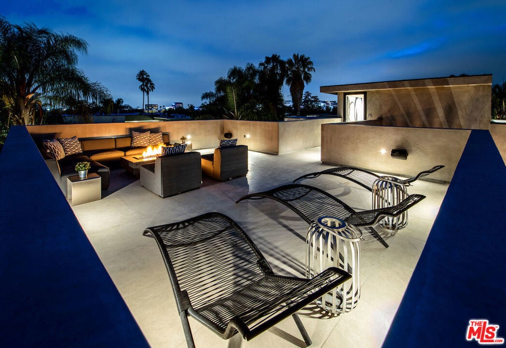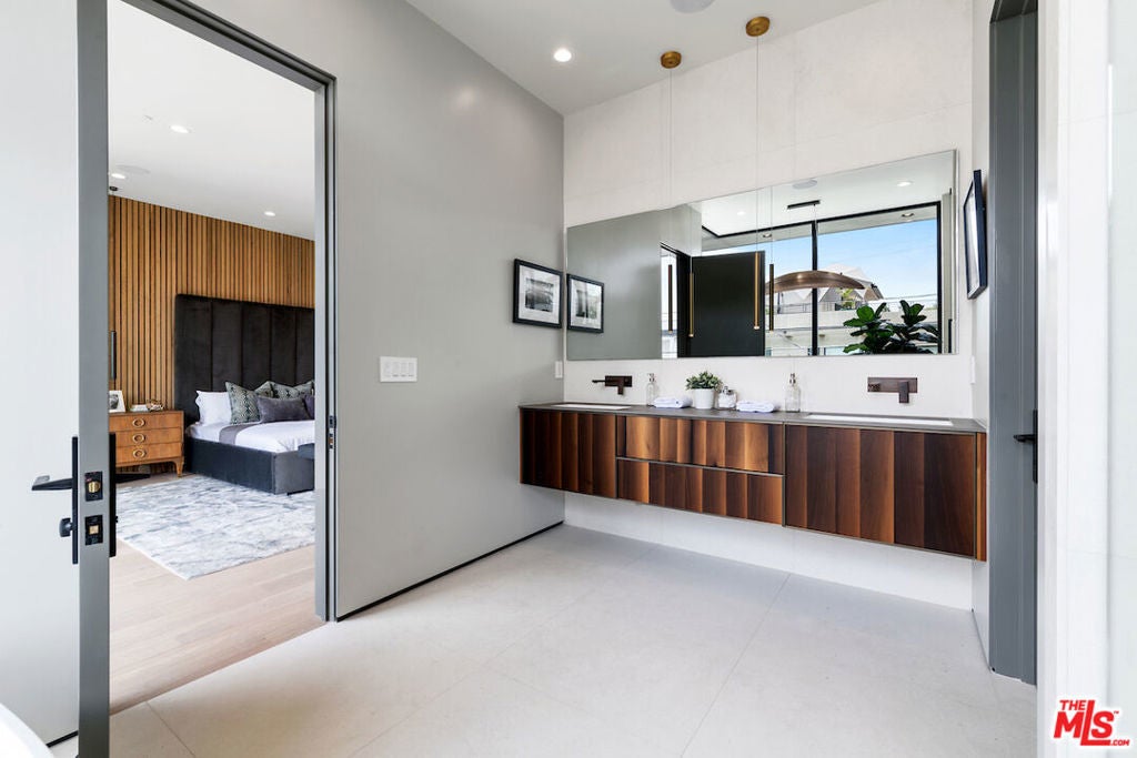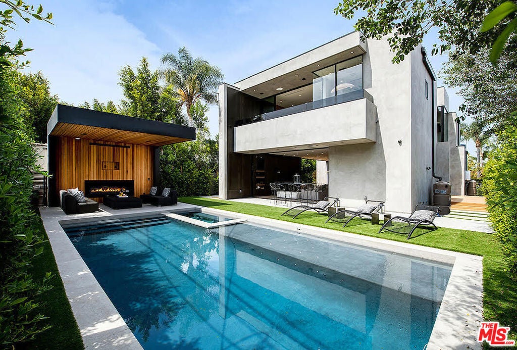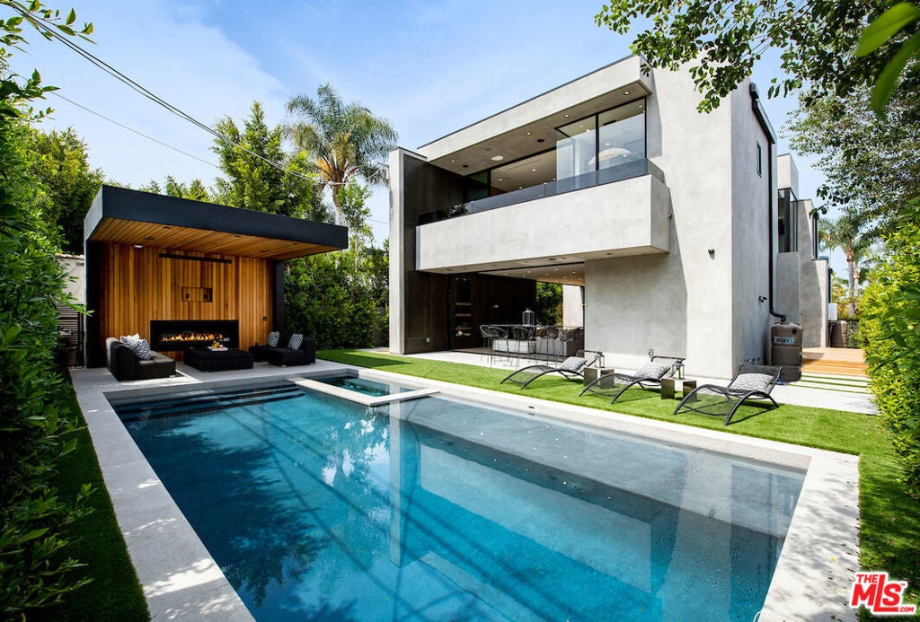 Gated architectural residence designed for the discerning buyer. Enter through a grand pivot door into an inviting home thoughtfully finished with rich wood elements and expansive second-floor and rooftop decks totaling approximately 1,500 additional square feet, offering sweeping views of the Los Angeles skyline and Hollywood Hills. The interior features white oak floors, Spanish tile accents, custom imported Italian vanities, and a chef's kitchen with an oversized island and counter seating that opens seamlessly to the family room and out to the pool, spa, cabana, and deck. The dining room opens to a private lounge deck, while a full suite on the main levelideal as an office or guest suitealso enjoys deck access.The primary suite showcases a striking white oak accent wall and a spa-like bath with a freestanding soaking tub and a tiled shower with dual shower heads. Two additional en-suite bedrooms feature private balconies. Additional features include crestron home automation, alarm and security camera systems, and mature. Centrally located in Beverly Grove, just minutes from Beverly Hills and some of the city's best restaurants and shopping!