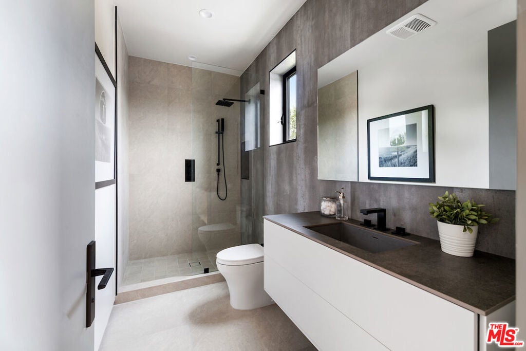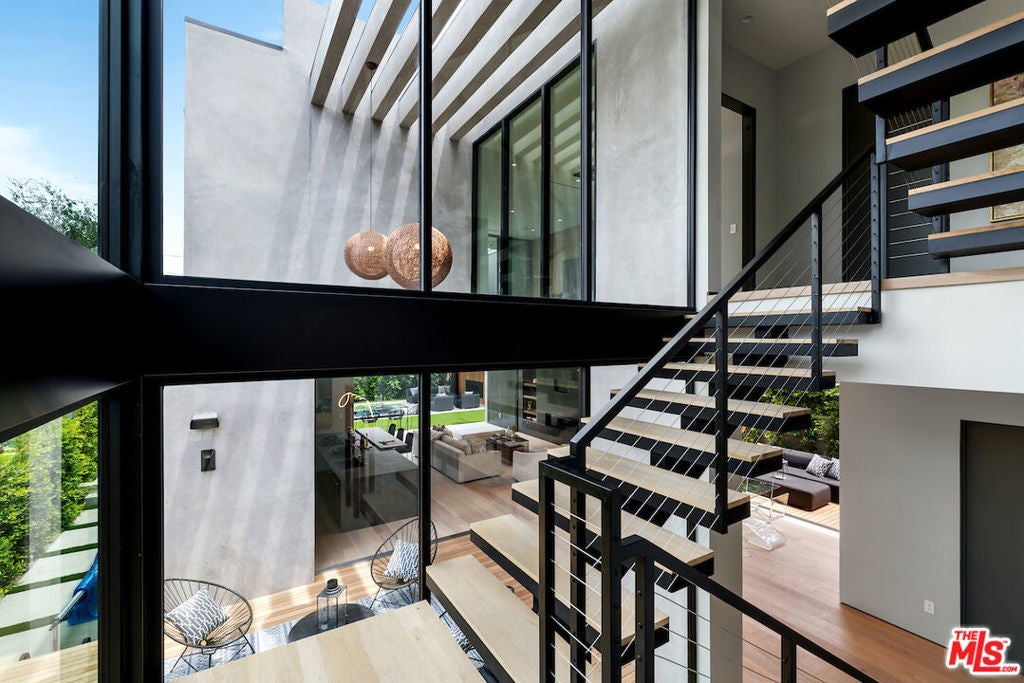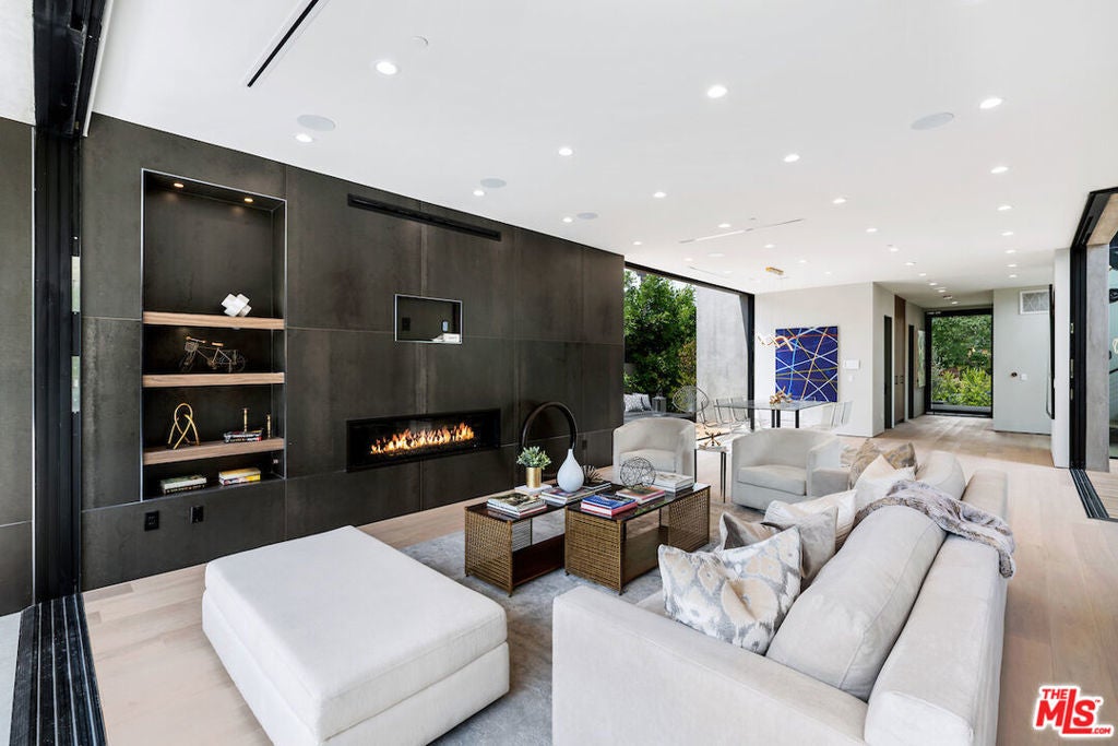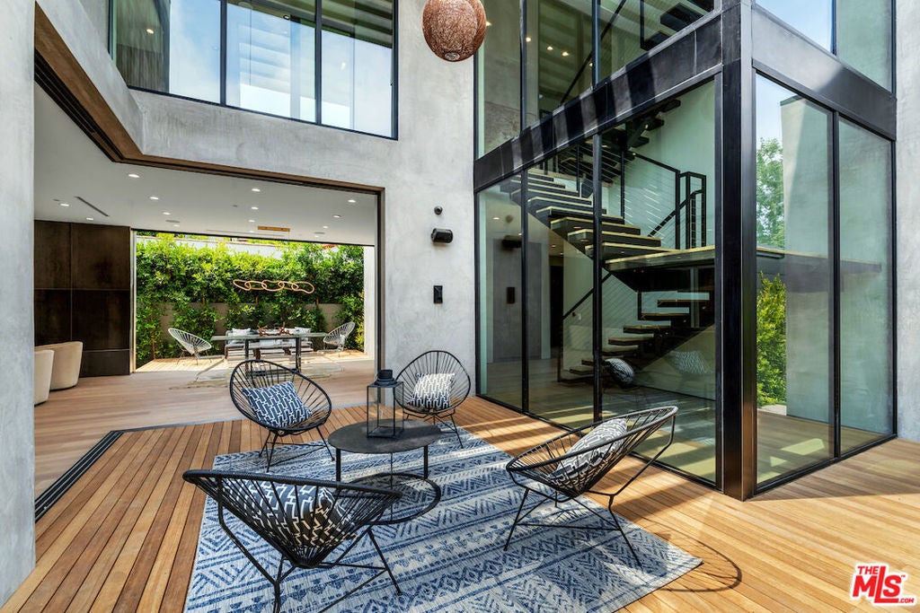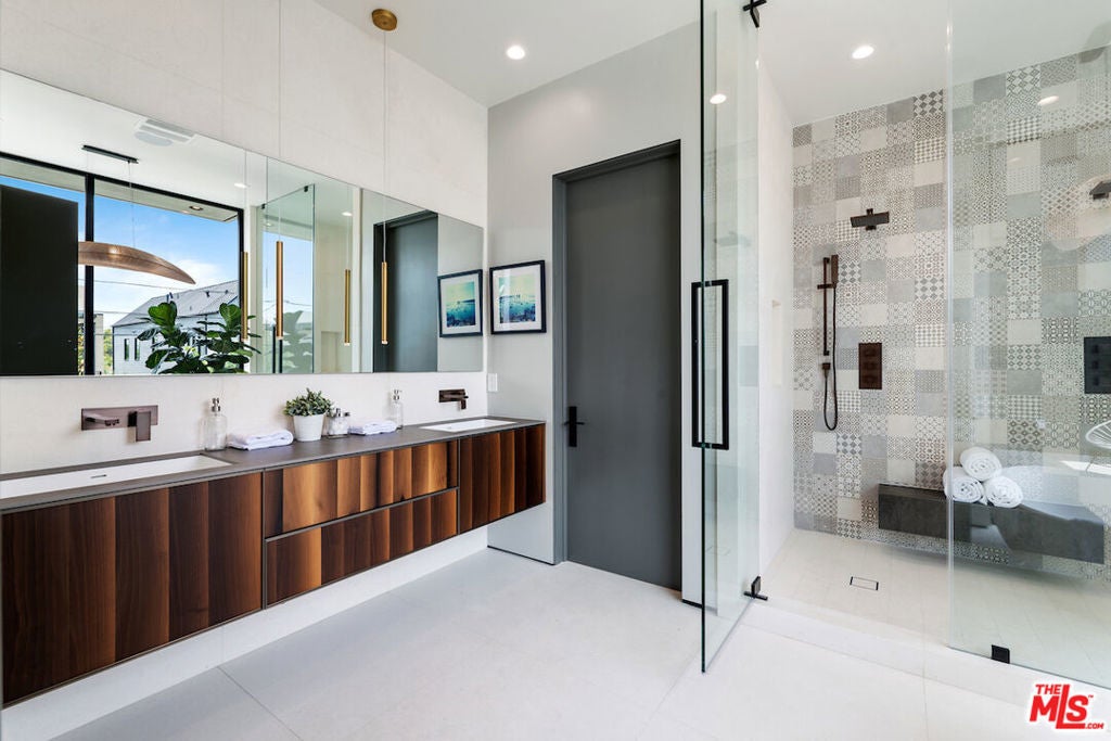 Gated architectural residence designed for the discerning buyer. Enter through a grand pivot door into an inviting home thoughtfully finished with rich wood elements and expansive second-floor and rooftop decks totaling approximately 1,500 additional square feet, offering sweeping views of the Los Angeles skyline and Hollywood Hills. The interior features white oak floors, Spanish tile accents, custom imported Italian vanities, and a chef's kitchen with an oversized island and counter seating that opens seamlessly to the family room and out to the pool, spa, cabana, and deck. The dining room opens to a private lounge deck, while a full suite on the main levelideal as an office or guest suitealso enjoys deck access.The primary suite showcases a striking white oak accent wall and a spa-like bath with a freestanding soaking tub and a tiled shower with dual shower heads. Two additional en-suite bedrooms feature private balconies. Additional features include crestron home automation, alarm and security camera systems, and mature. Centrally located in Beverly Grove, just minutes from Beverly Hills and some of the city's best restaurants and shopping!