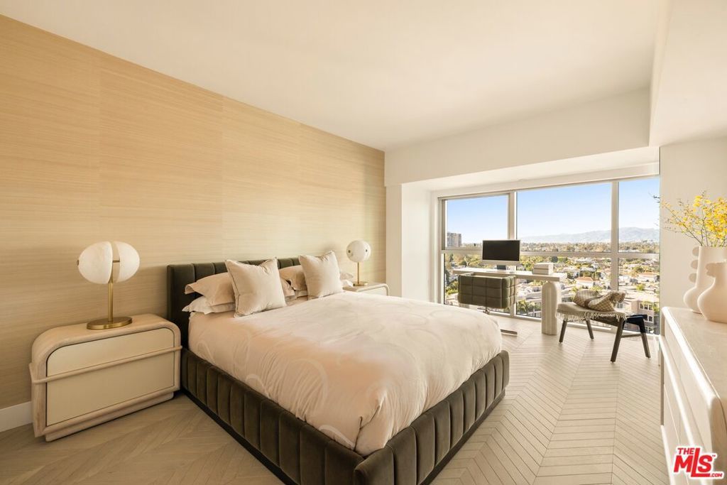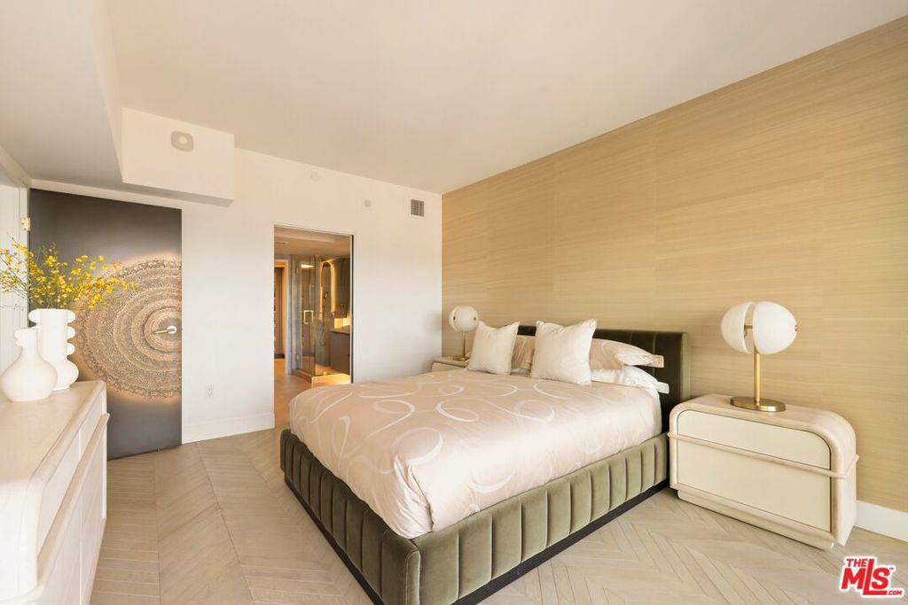 Impeccably designed and perched on the tenth floor of the exclusive Azzurra, this 2-bedroom, 2.5-bath residence showcases breathtaking views of the Marina and Santa Monica Mountains from every room. The interiors are defined by chevron Zanzibar European oak flooring, custom Liquid Metal doors with bespoke pulls, and curated finishes throughout. Luxe Phillip Jeffries wallcoverings in silk, linen, and vinyl snakeskin add depth and texture, while Lutron electronic shades and outlets provide effortless modern convenience. The sleek kitchen is outfitted with Dacor luxury appliances and a custom microwave drawer oven, flowing seamlessly into a spacious dining area highlighted by a custom alabaster and leather chandelier, a built-in bar, and an integrated Miele wine cooler - perfect for entertaining. The sun-filled living room features custom built-ins, an electric fireplace, and statement lighting, with glass doors opening to a private balcony for a seamless indoor-outdoor experience. A refined powder room completes the main living spaces. The serene primary suite offers space for a dedicated office nook overlooking the views and a hotel-style en-suite bath with a dual-sink vanity, glass-enclosed shower, soaking tub, and boutique-like closet. An equally sophisticated guest suite, in-unit laundry, and meticulous attention to detail throughout complete the home. Residents of Azzurra enjoy full-service, hotel-style living with 24/7 concierge, a resort-style pool and spa, a state-of-the-art indoor/outdoor fitness center, and an exceptional collection of amenities - all set in a premier Westside location.