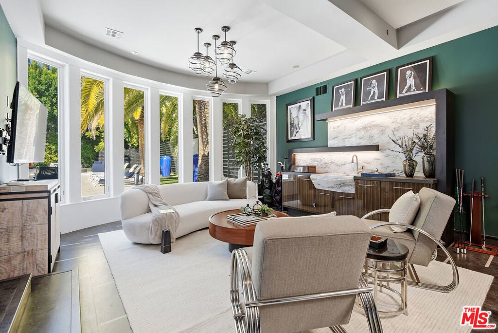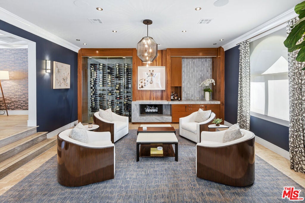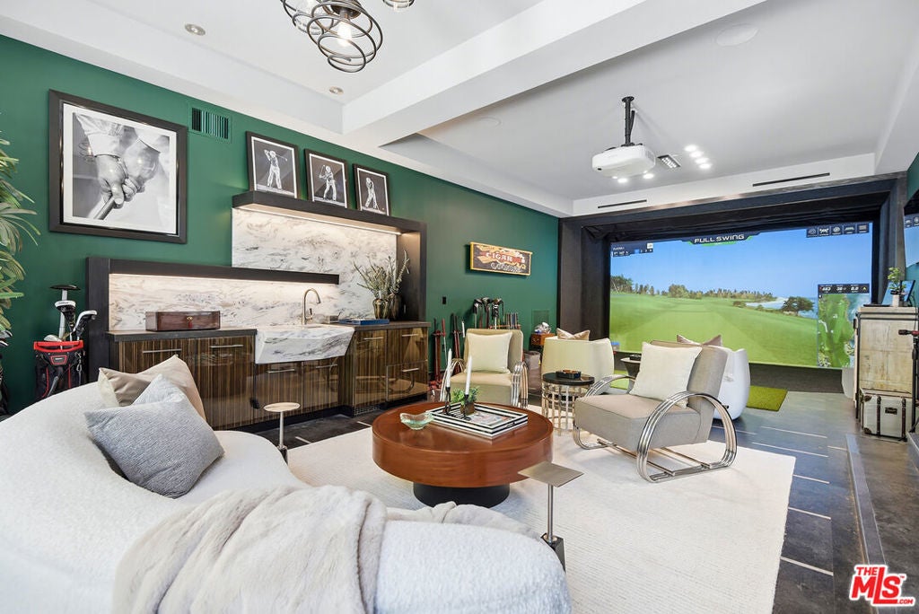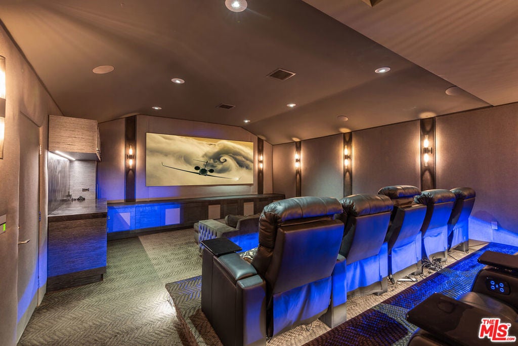 Supremely private Stately gates with imposing 25' high hedges hide a true miracle of a home that serves as the ideal host for fantastic entertainment. State of the art Movie theater. State of the art Golf Simulator with cigar lounge that has humidifier filtration for fresh clean air. Bold designer choices abound - gorgeous on-trend fixtures and dynamic wallpaper coverings. Two downstairs en suite bedrooms, two other upstairs en suite large bedrooms. Another bedroom converted into a complete spa with wet and dry sauna and massage table. The other bedroom adjacent to the Primary suite has been opened to serve as a huge killer office. Upstairs laundry has been added to complement the downstairs laundry off the secondary staircase. This is truly a luxurious floorplan. La Cantina folding doors open to reveal an immaculate backyard that blows you away. Placid infinity pool reflects the subtle exterior lighting with various daybeds and conversation lounges surrounding cozy fire pits. The outdoor kitchen offers a veritable restaurant experience with the pizza oven, fireplace, TV and bar.