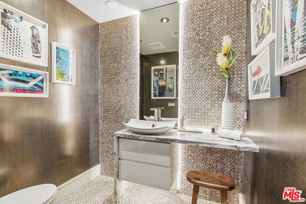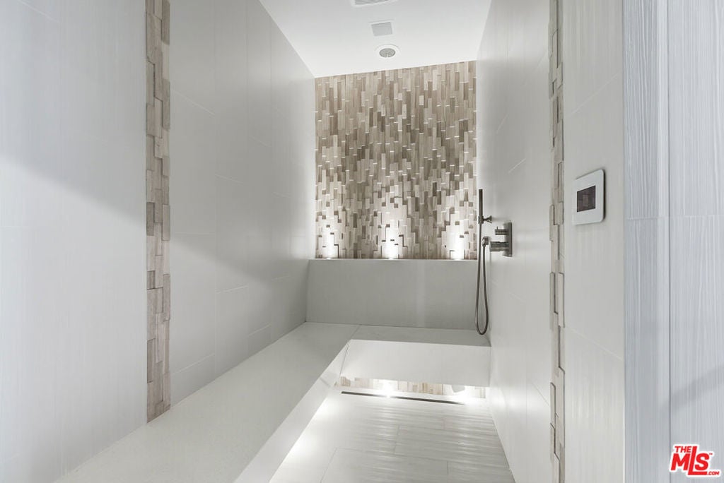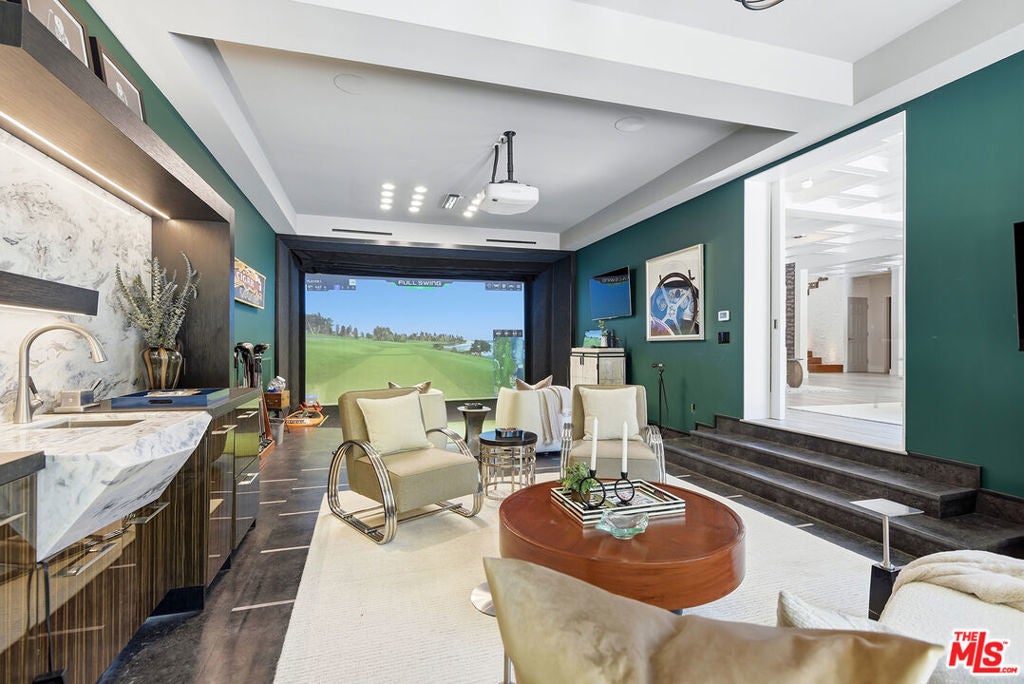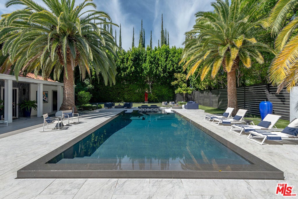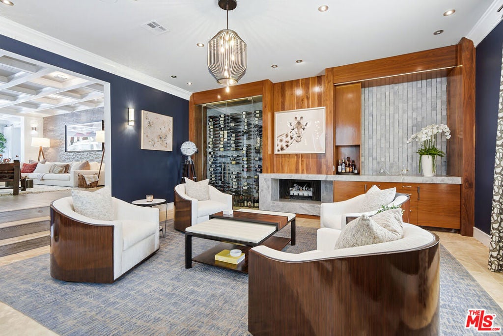 Supremely private Stately gates with imposing 25' high hedges hide a true miracle of a home that serves as the ideal host for fantastic entertainment. State of the art Movie theater. State of the art Golf Simulator with cigar lounge that has humidifier filtration for fresh clean air. Bold designer choices abound - gorgeous on-trend fixtures and dynamic wallpaper coverings. Two downstairs en suite bedrooms, two other upstairs en suite large bedrooms. Another bedroom converted into a complete spa with wet and dry sauna and massage table. The other bedroom adjacent to the Primary suite has been opened to serve as a huge killer office. Upstairs laundry has been added to complement the downstairs laundry off the secondary staircase. This is truly a luxurious floorplan. La Cantina folding doors open to reveal an immaculate backyard that blows you away. Placid infinity pool reflects the subtle exterior lighting with various daybeds and conversation lounges surrounding cozy fire pits. The outdoor kitchen offers a veritable restaurant experience with the pizza oven, fireplace, TV and bar.