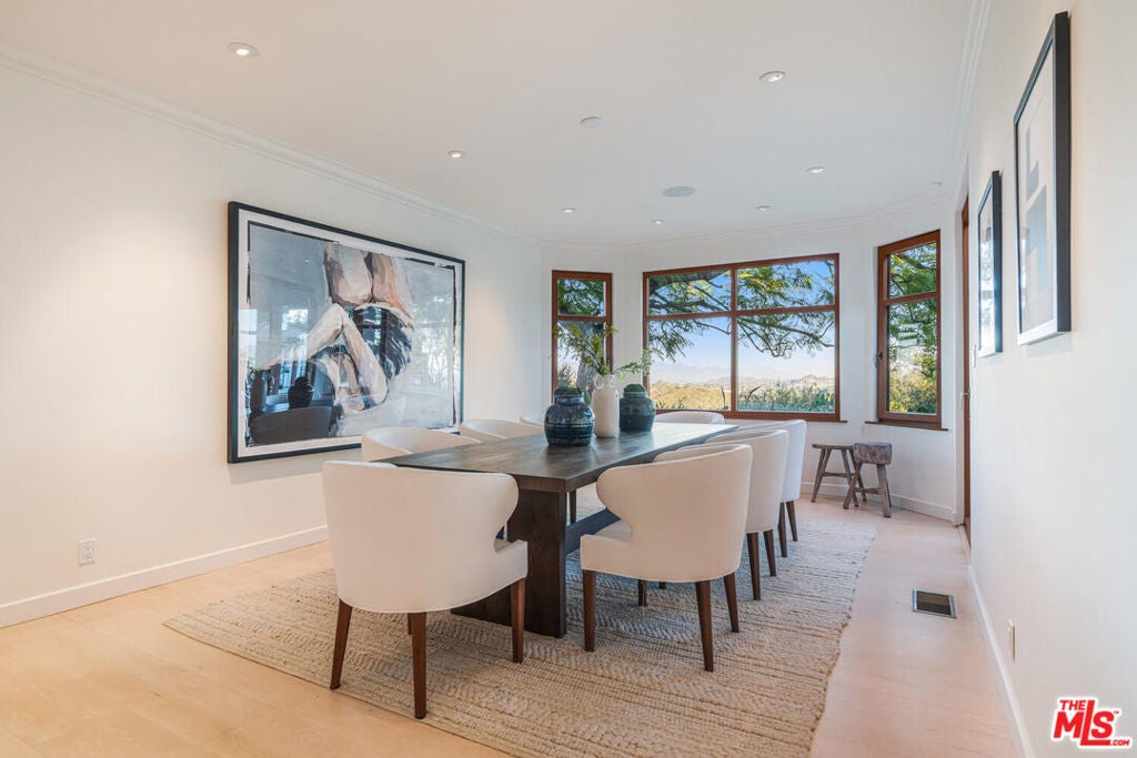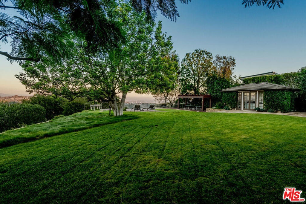 Gated Bel Air Estate perched high above the city, this extraordinary private estate commands sweeping panoramic views of the Stone Canyon Reservoir, downtown Los Angeles, Century City, the Santa Monica Mountains, and city lights. Situated on approximately 1.03 acres flat lot, the property offers a rare combination of complete privacy, expansive flat grounds, and breathtaking views that evolve throughout the day and night. A circular motor court welcomes you to the residence, accommodating 10+ vehicles and complemented by a three-car garage. The main residence features seven bedrooms and nine bathrooms, thoughtfully arranged within an exceptional floor plan designed for both elegant daily living and sophisticated entertaining. Refined finishes, custom doors and windows, built-in cabinetry, and timeless architectural details are showcased throughout. The entry has architectural details with high ceiling this leads to an expansive living room, floor-to-ceiling pocket doors that open directly to the trellis covered patio, lawn, pool, and reservoir beyond creating an effortless indoor-outdoor lifestyle. The adjacent formal dining room featuring a built-in floating buffet, large windows, and doors that invite natural light and seamless access to the outdoors. The Poggenpohl chef's kitchen features a large center island with seating, Sub-Zero refrigeration, Miele ovens, Wolf cooktop, and pantry with full size Miele wine refrigerator with custom cabinetry. The kitchen opens to a sunlit breakfast area, this flows seamlessly into the adjacent family room with lounge area, all framed by expansive windows overlooking the grounds and mountain views. The main living level offers four ensuite bedrooms, two powder rooms, and a laundry room. The second level features three very generously scaled bedroom all ensuite with sitting areas, large windows, custom built-in cabinetry, large closets thoughtfully designed to take in views of the property, trees and mountains. The estate includes a detached guest house with a full kitchen and bath can be used as a studio or office. Outdoors, the estate unfolds into a resort-style setting featuring a sprawling flat lawn, sparkling pool and spa, expansive lounge and entertaining areas, and a full-size basketball court that also functions as a pickleball court. Mature olive and oak trees, lush landscaping, and manicured grounds create a serene, park-like environment with multiple vantage points designed to capture the property's extraordinary views. This rare Bel Air offering seamlessly blends elevated privacy, refinement, comfort and sophistication, delivering an unparalleled lifestyle in one of Los Angeles' most coveted enclaves.