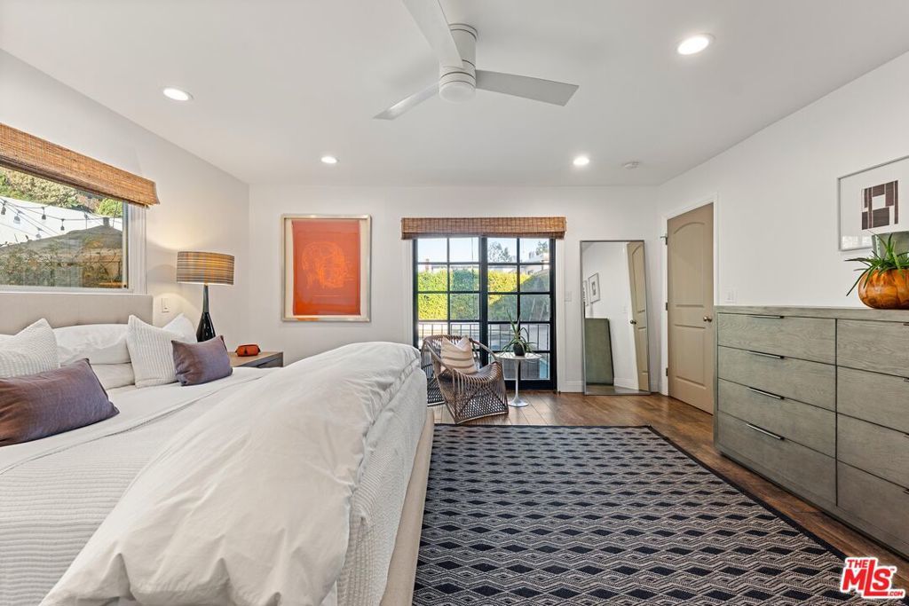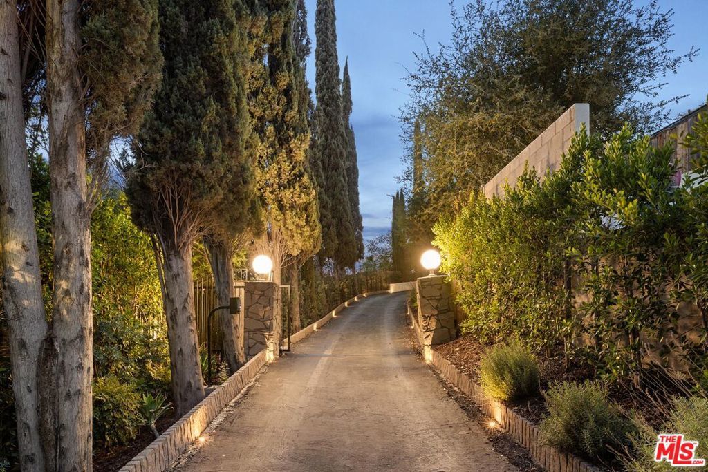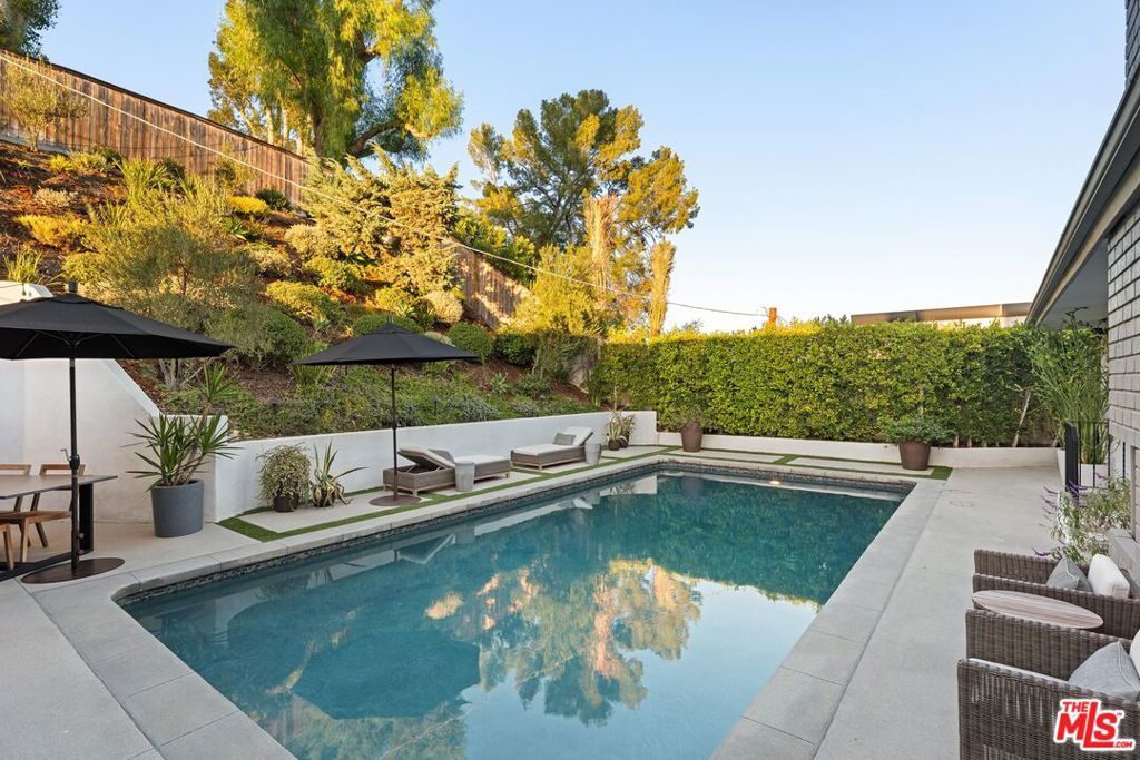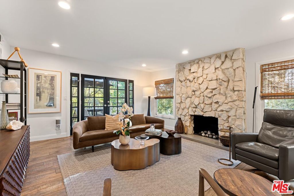 Step into this Woodland Hills sanctuary, a beautifully updated single-story home tucked away on a quiet street south of the boulevard. Set behind a private,180-foot gated driveway, this 3BD/2.5BA home blends comfort and style with treetop views, a resort-inspired pool, and effortless indoor-outdoor living. Inside, engineered hardwood floors and a stone-accented fireplace set a welcoming tone in the light-filled living room, where glass doors open to a view deck, perfect for morning coffee or sunset entertaining. A chic powder bath sits just off the entryway for guests. The open-concept kitchen features premium Thermador appliances, an island, and abundant cabinetry and counter space. The kitchen seamlessly connects to the family area, complete with its own gas fireplace, and to the formal dining room, where beamed ceilings and expansive windows frame the surrounding greenery. Offering a peaceful retreat, the spacious primary includes dual closets, a split A/C system, direct backyard access, and a luxurious ensuite bath with a dual vanity and step-in shower. Down the hall, two additional bedrooms share a beautifully appointed bath with generous counter space and shower-tub combo. Outdoor living shines here. Host unforgettable gatherings by the resort-style saltwater pool, equipped with brand new systems, or dining al fresco under the stars. Hillside vistas create a private oasis framed by lush landscaping. Ideally located near Wilbur Charter Elementary, scenic trails, and shops and restaurants along Ventura Boulevard, this home delivers the perfect blend of sophistication, seclusion, and everyday ease.