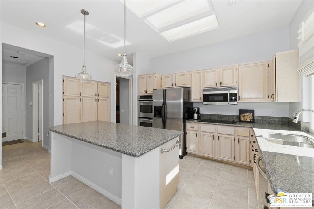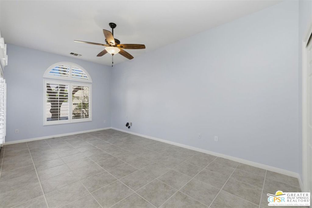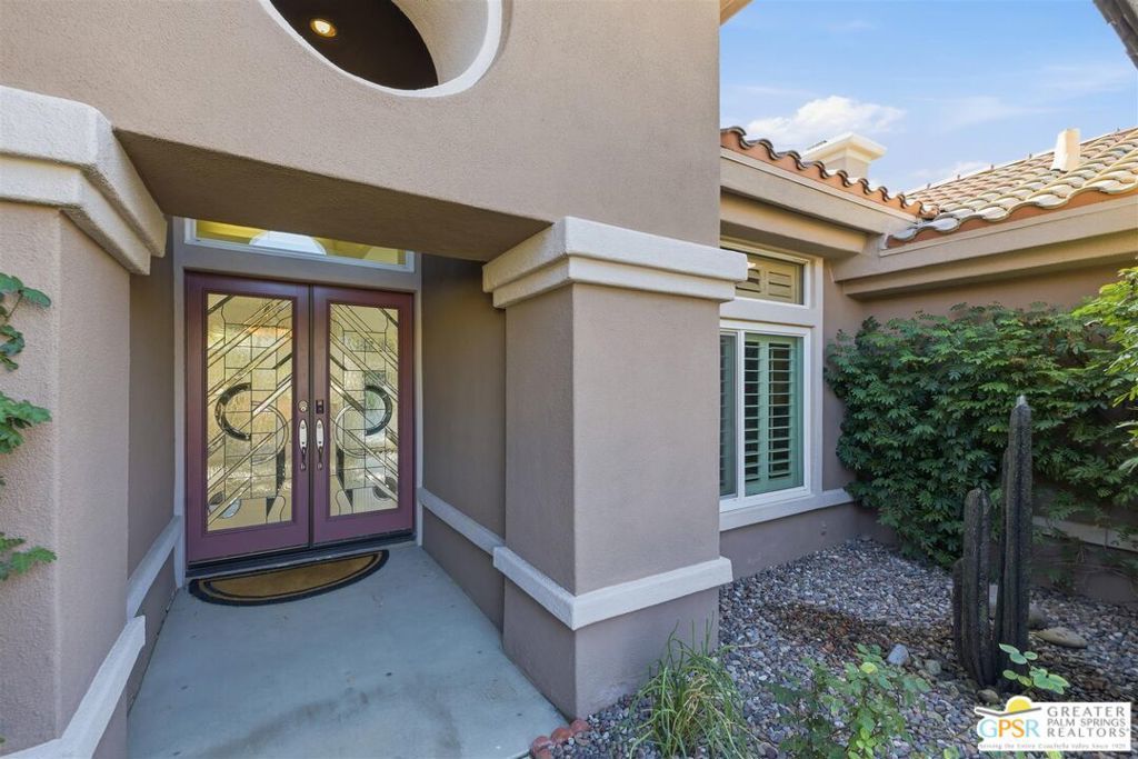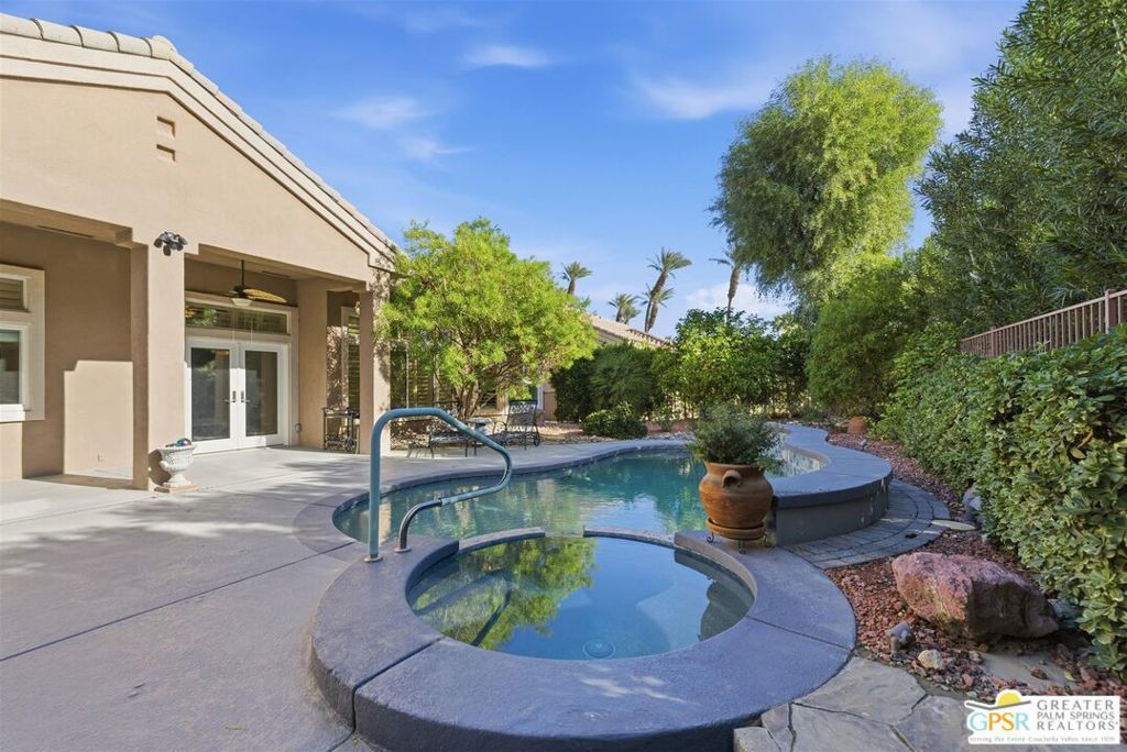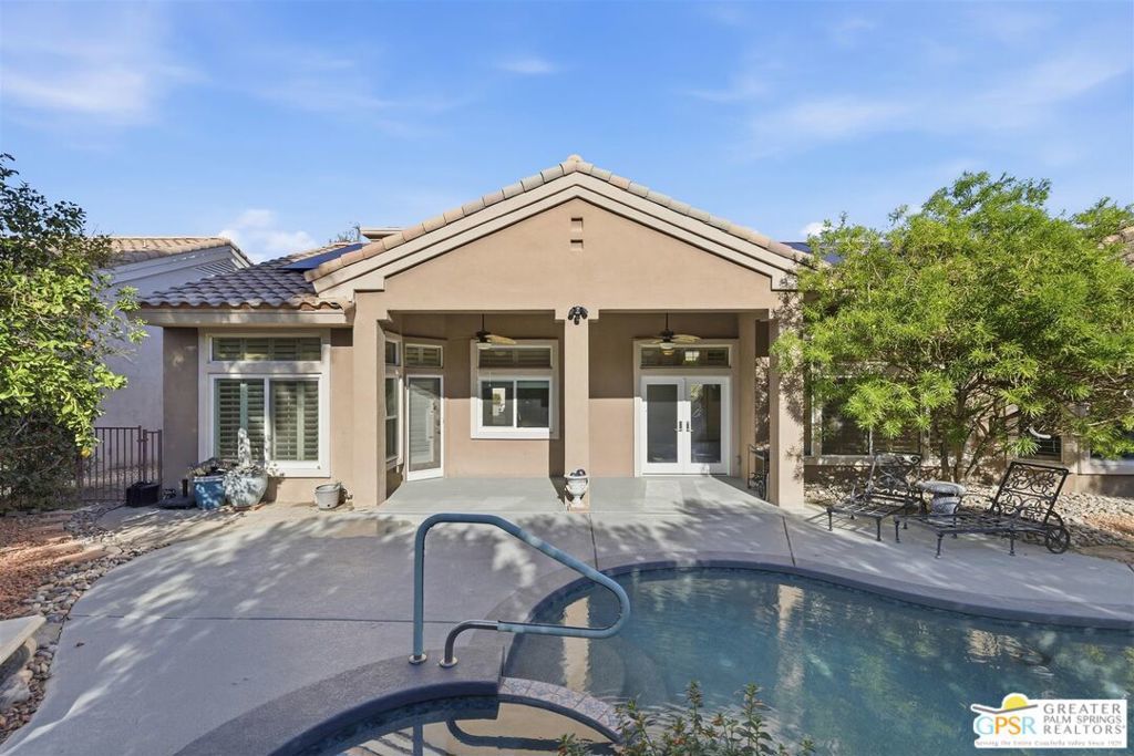 Welcome to desert living at its best in this beautifully upgraded home, tucked away on a quiet cul-de-sac in the heart of an active country club golf community. Enjoy stunning mountain views from the south-facing backyard, where relaxing by the Pebble Tec pool and spa becomes part of everyday life, ideal for afternoon sun and evening gatherings.This extended Emerald model offers a spacious great room with dining area and a thoughtfully updated kitchen featuring stainless steel appliances, quartzite countertops, and a casual eating area that flows seamlessly into the family room with fireplace, creating an inviting space for both entertaining and daily living.The home features three bedrooms, including a generous primary suite with ensuite bath and large walk-in closet. One secondary bedroom is well suited for use as a home office or den, while the third bedroom/casita is accessible from both the interior of the home and a separate exterior entrance, offering flexible use for guests or additional living space.Notable upgrades include a remodeled Pebble Tec pool, paid solar panels, tankless water heater, and newer air conditioning units replaced in 2018. Tile flooring and plantation shutters are featured throughout, along with mature desert landscaping. The two-car garage includes a dedicated golf cart bay, ideal for enjoying everything this sought-after community has to offer.A must-see opportunity for those seeking comfort, efficiency, and the Palm Desert lifestyle.