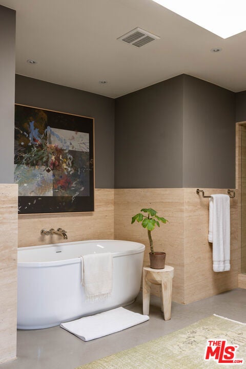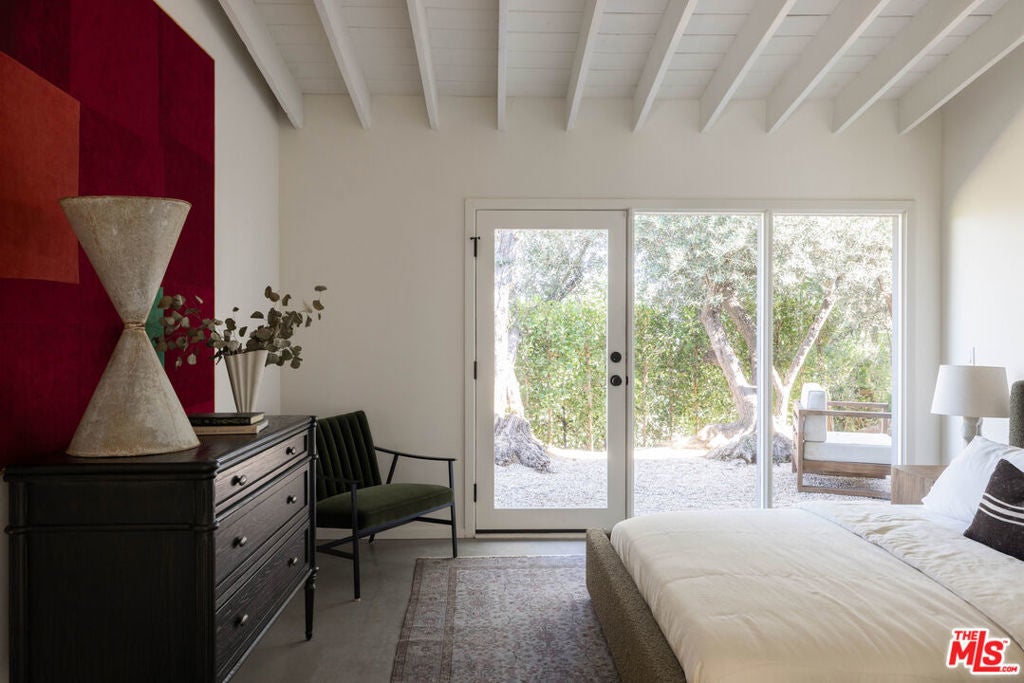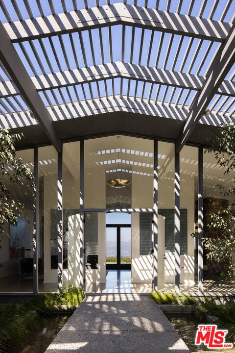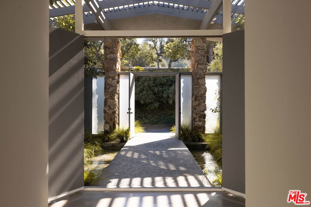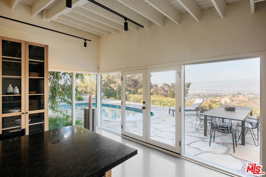 Tucked in an exclusive pocket of the Hollywood Hills, this dramatic mid-century has been completely transformed into a private, design-forward retreat with show-stopping panoramic views. Beyond the gated courtyard, where fountains and mature trees set a serene stage, you'll find interiors that strike the perfect balance of drama and warmth. Sky-high vaulted ceilings, a massive wood-burning fireplace, and walls of glass frame the pool and city views beyond, flooding the home with natural light. The chef's kitchen with custom oak cabinetry and oversized island blends seamlessly with the dining, living, and outdoor spaces, creating a natural flow for both intimate evenings and grand indoor/outdoor entertaining. The primary suite is a true escape with endless views, a boutique-style closet with island, an Italian travertine bath and sitting area overlooking the pool. Three additional oversized bedrooms each open to a private patio shaded by 100-year-old olive trees. The grounds are an oasis: pool, dining terrace, and reflecting pond designed for maximizing the outdoor living experience. Situated in the coveted Wonderland School District, this home pairs architectural pedigree with effortless California living. A must-see for those seeking privacy, design, and world-class views.