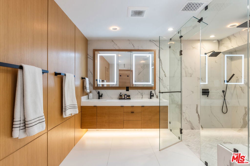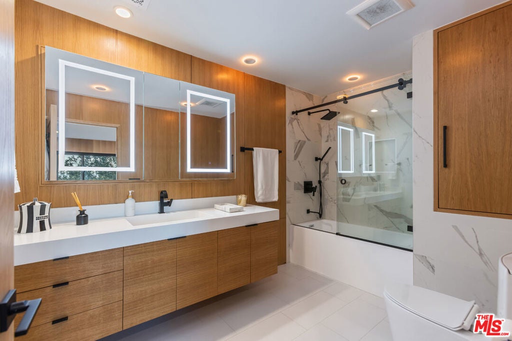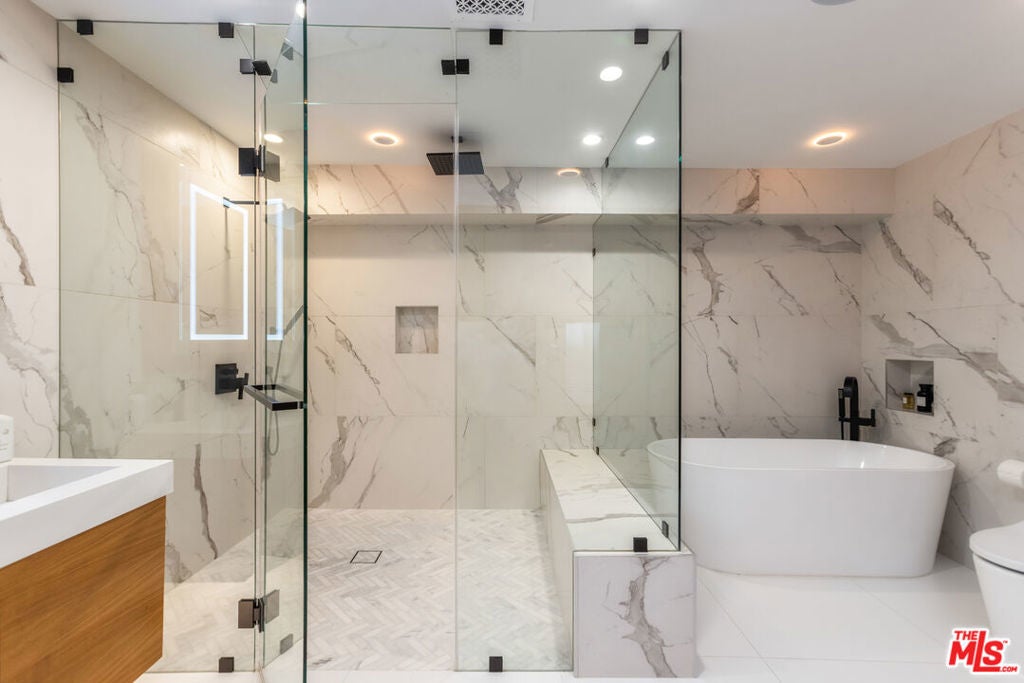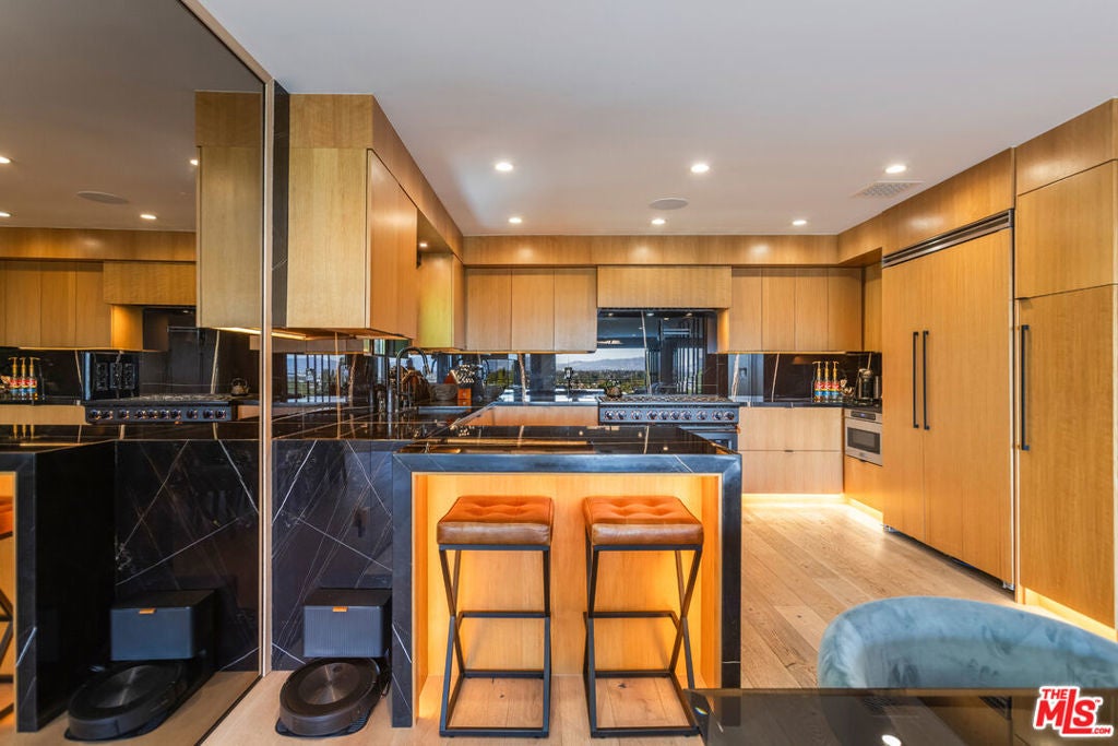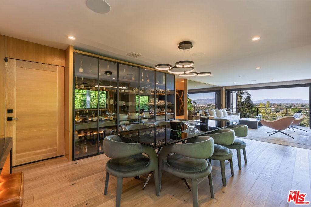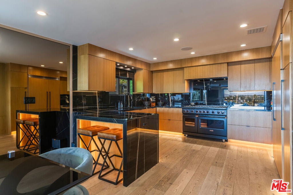 Privately perched just moments from the studios and the Sunset Strip, this fully reconstructed 2021 modern smart home is a true showpiece, delivering dramatic city views, exceptional privacy, and a level of design rarely found. Integrated with Control4, the home offers effortless customization of sound, lighting, and window shades, creating a seamless, elevated living experience.Designed to impress, the open main level unfolds with a fireplace anchored living room, a statement dining area with custom built ins, and walls of glass that open to an expansive view balcony made for sunset entertaining. The designer kitchen stuns with a rare matte black Viking range, marble countertops, and sleek bar seating.The primary suite is a private sanctuary featuring spa inspired finishes, soaking tub, dual vanity, walk in closet, and tranquil outlooks. The lower level reveals approximately 650 square feet of flexible bonus space with a separate entrance, full kitchen, and a private terrace with fire pit, set alongside a large flat grassy yard with room for a pool, perfect for an in law suite, creative studio, gym, or guest retreat.Smart home technology, multi zone HVAC, four guest bedrooms, and parking for three complete this exceptional offering. A rare opportunity to own a truly special architectural residence moments from Universal CityWalk, the Hollywood Bowl, and Ventura Boulevard.