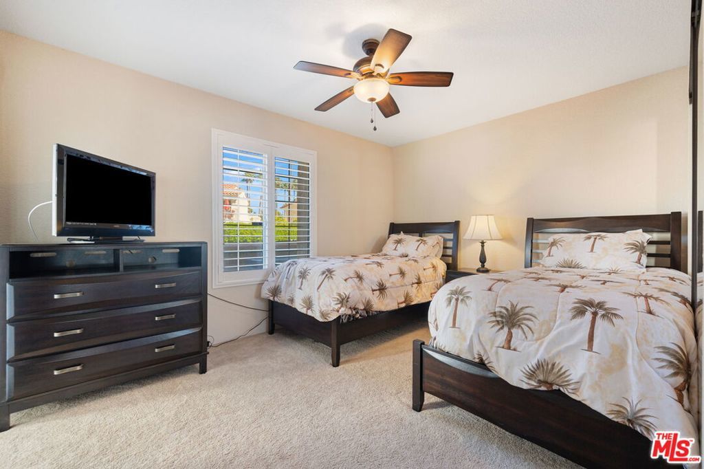 Ideally situated in the back of the complex, this private and serene ground-floor condominium offers true resort-style living! Perfect as a vacation retreat or a comfortable primary residence. The single-level layout opens to a lanai with breathtaking views of the majestic San Jacinto Mountains and close proximity to a lush greenbelt, creating a peaceful indoor-outdoor lifestyle. The spacious primary bedroom features direct access to the backyard, an en-suite bathroom with an upgraded shower, and generous closet space. The inviting living room is ideal for relaxing after a day by the pool or exploring Palm Springs. The kitchen is thoughtfully designed with ample counter space and all the essentials, including refrigerator, range, and oven. A well-appointed guest bedroom opens to a recently improved patio area, an ideal spot to enjoy morning coffee or unwind during warm summer evenings. Additional upgrades include tile flooring, plantation shutters, a new water heater, and updated finishes throughout. Located within the desirable Mesquite Country Club, residents enjoy access to two tennis courts, three pools, three spas, and the scenic Prescott Preserve. HOA dues include water, trash, internet, cable, landscaping, pool maintenance and one unassigned covered space and unlimited covered parking. Located Just minutes from downtown Palm Springs favorites such as Sherman's Deli and Shanghai Red's famous fish tacos, this home offers the perfect blend of privacy, convenience, and resort living.