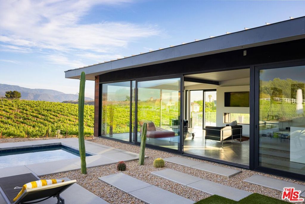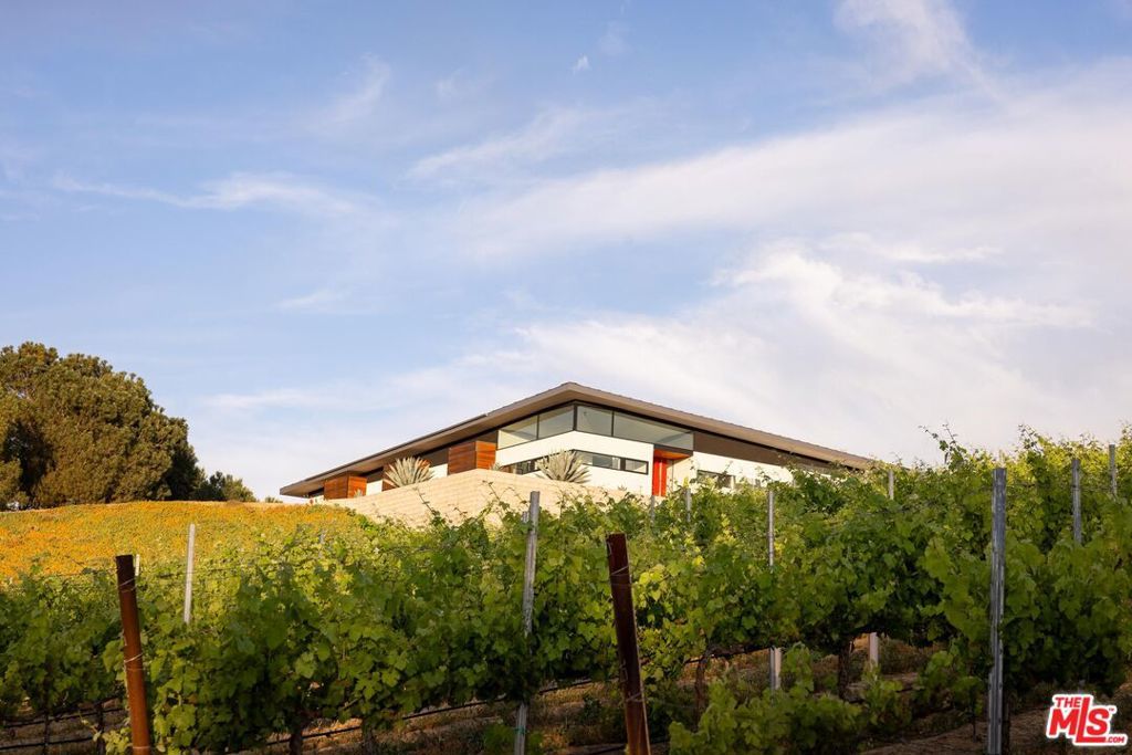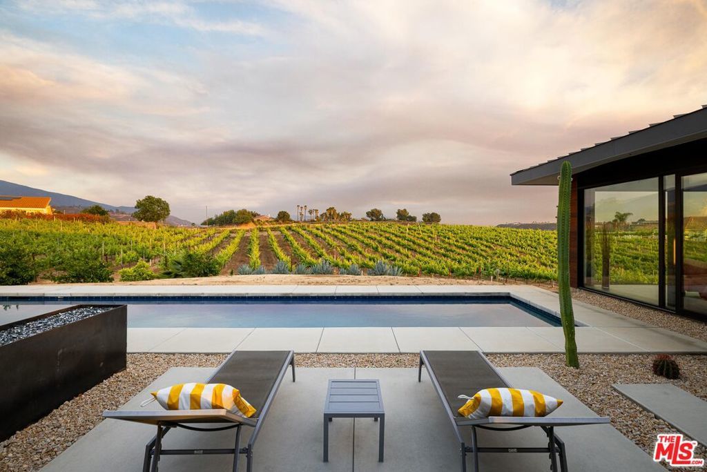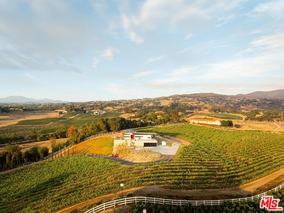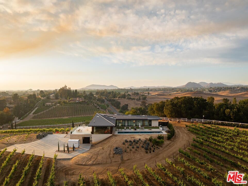 An incredible modern architectural home with income producing vineyard, in the heart of Temecula Wine Country. The Kite House, designed by Southern California-based architecture firm, Architects Magnus, was built using fire resistant hybrid construction methods with a high strength steel frame, and sustainability in mind with a standing seam metal roof under a 10kw solar system. All of the interior fixtures and appliances are premium quality and mostly imported; from the commercial grade aluminum door frames with solid core door panels, skylights, Duravit bathroom cabinets, and ORTAL tunnel fireplace (all imported from Germany), the faucet hardware is Hans Grohe, and the kitchen is all Miele (combo / steam oven, built-in coffee machine, fridge, dishwater and induction cooktop). The kitchen countertops are custom no-seam Silestone, made in Italy. The hydronic a/c system is custom made from the Italian company, Messana. Throughout the home you find Lutron lighting, and each bedroom has a commercial grade lift & slide door and window system from Reynaers, designed in Belgium. Head outside to the Pentair mineral pool and jacuzzi with propane and electric heater, and low voltage landscape lighting on photocell. Everything from the coffee machine, a/c system, lighting and pool systems can all be controlled via an app. And then of course you are surrounded by your own vineyard, 'Moto Vino' (valued as a $600k+ business, conveying with the sale of the home) that was developed by Drake Enterprises of Temecula, utilizing efficient machine harvesting and is fully OSHA compliant with service roads, filter station and drip irrigation (3.3 acres of Syrah, and 0.5 acres of Grenache Blanc vineyard that generates $40-$50k in revenue/year for another projected 20+ years). This is an incredibly unique offering of Southern California modern architecture meets vineyard that was planned and developed in-tandem to maximize the 4.88 acre properties view orientation, grape yields and functionality.