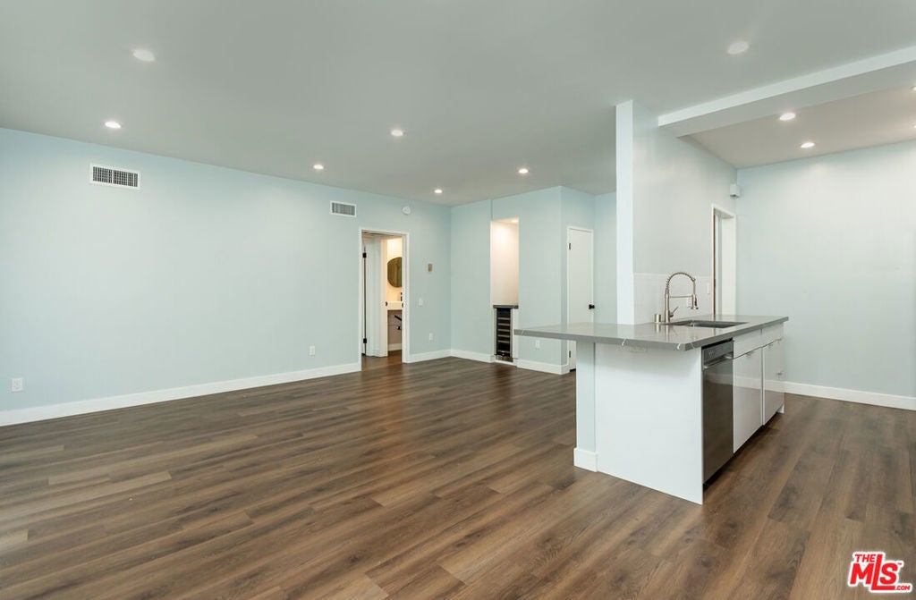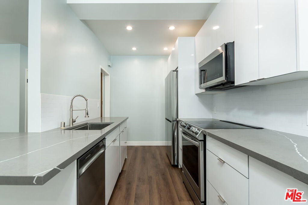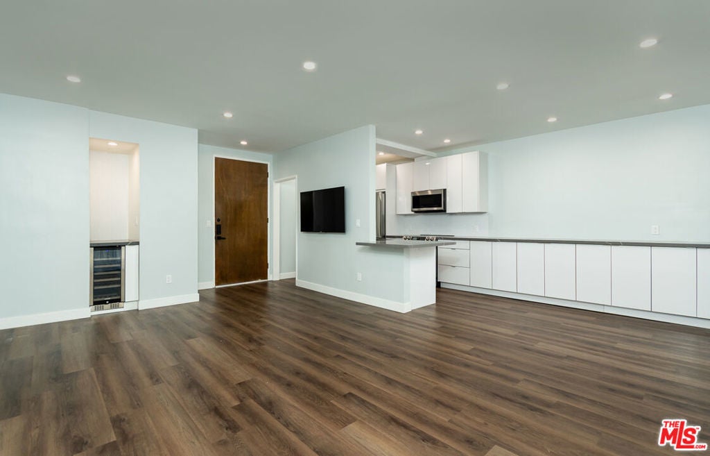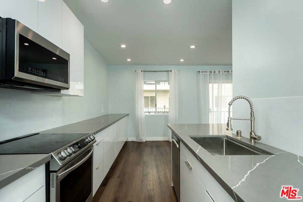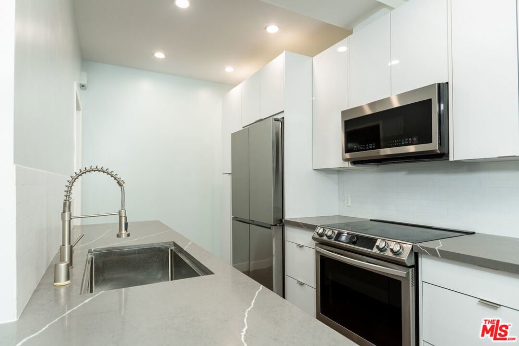 Prime Beverly Hills adjacent location in the desirable Beverly Towers. Wait until you see this beautifully reimagined modern one bedroom and one and three quarter baths unit completed in 2022. This corner unit (only shares 1 wall) has a flowing open floor plan with great natural light. The newly remodeled kitchen features abundant storage, new cabinets, quartz counters, smart stainless steel appliances and bar for seating. Separate dining area that opens to the spacious living room with a dry bar and wine fridge. Large bedroom with excellent closet space. Spacious balcony. Oversized windows and sliders. Double drywalled for additional sound proofing, Hardwood style floors (waterproof vinyl), recessed lighting, newer paint. Unit looks out over the spacious courtyard. 2 car parking, central heat and a/c. Solid HOA with monthly dues of only $480 which include water, earthquake insurance and great amenities including pool, spa, fitness suite, rec room, and bike storage room and additional storage. Walk to Houses of Worship, great shopping, dining, and other well known destination points. Priced aggressively!