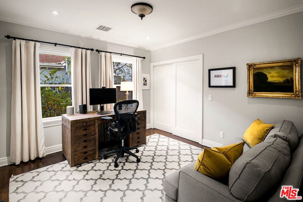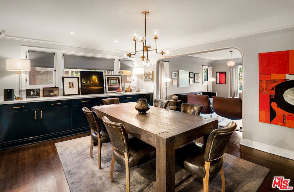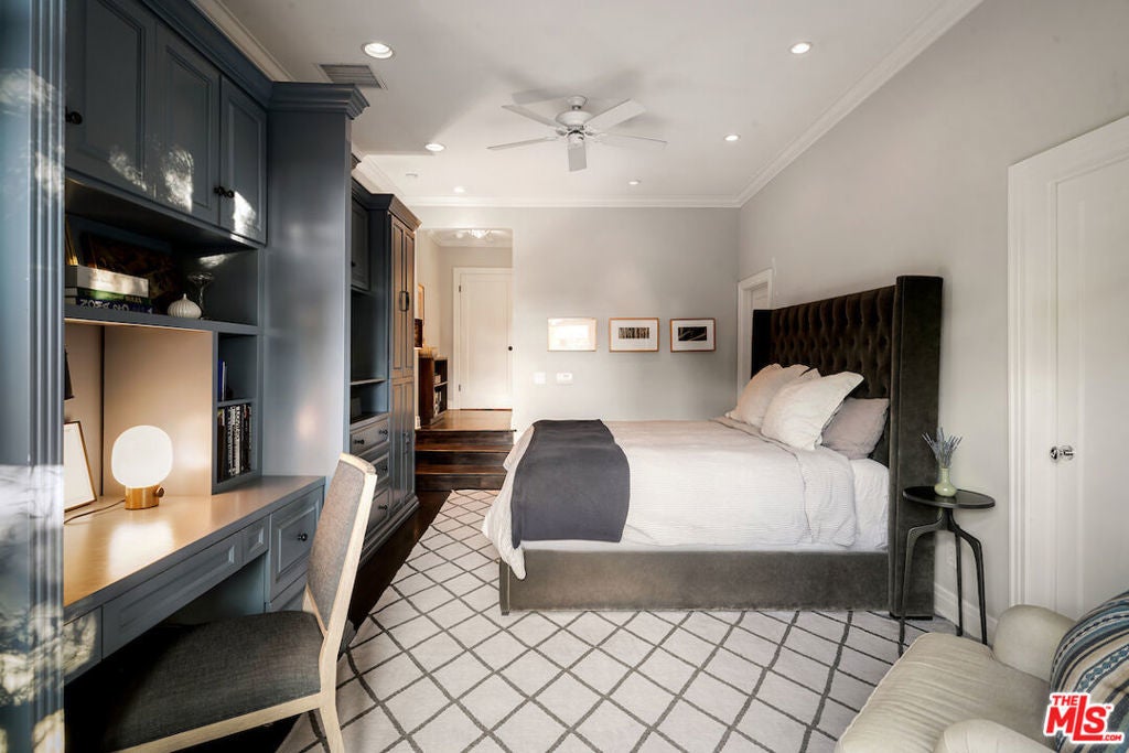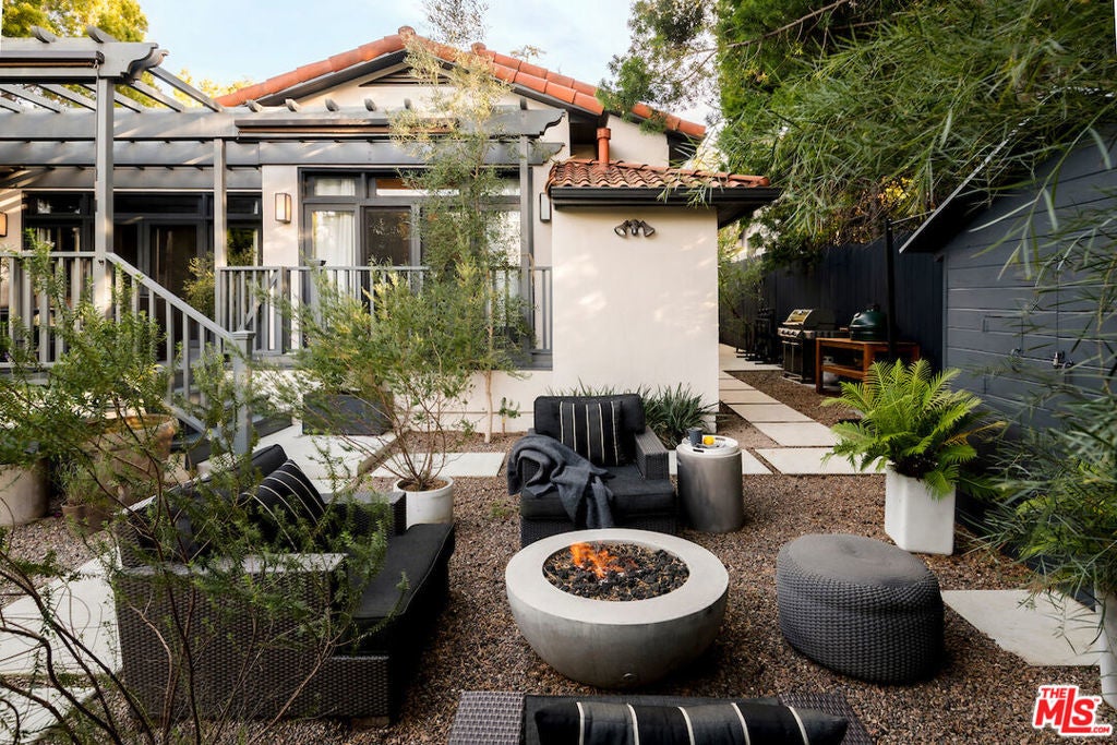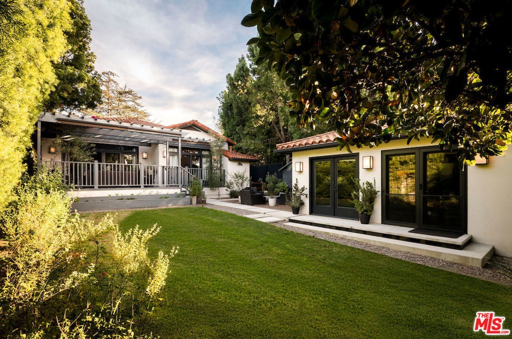 Situated in the highly sought-after Brookside/Hancock Park neighborhood, this distinguished residence embodies timeless elegance enhanced by thoughtful modern updates. The three-bedroom, two-and-a-half-bath main home, complemented by a beautifully appointed rear guest house, immediately impresses with its exceptional craftsmanship and architectural detail. Rich hardwood floors, crown molding, coved ceilings, graceful curved entryways, custom window treatments, and designer paint finishes by Farrow & Ball and Donald Kaufman create a refined and cohesive aesthetic throughout. The intelligently conceived floor plan offers a seamless balance of formal entertaining and comfortable daily living, with private bedroom quarters thoughtfully separated from the principal living areas. A welcoming foyer opens to an expansive living and dining room, anchored by a bespoke marble-topped buffet and alabaster wall sconces, an elegant setting for gatherings both casual and formal. Original double-glass swing doors lead to the heart of the home: a generous chef's kitchen featuring a substantial center island with seating, abundant counter and pantry space, a dedicated hutch, classic two-tone Shaker cabinetry crowned with marble countertops, and a suite of premium stainless-steel appliances, including a Viking range, Sub-Zero refrigerator, and Miele dishwasher. Adjacent, the light-filled family room boasts soaring 10-foot ceilings, custom built-in bookcases, and expansive rear windows, with French doors opening to multiple outdoor living and dining areas within the private garden. The serene primary suite is a true retreat, offering dual custom walk-in closets and a full wall of artisan cabinetry. The spa-inspired bath features a separate soaking tub, an oversized shower, and an expansive vanity with generous storage. Sliding glass doors connect the suite directly to the newly landscaped grounds, framed by mature hedges, curated garden beds, and a variety of fruit trees lemon, apple, orange, and lime creating an inviting environment for both relaxation and cultivation. Raised planters provide ideal space for vegetables, herbs, or flowers. Outdoor living is further enhanced by a wood deck with pergola off the family room and a firepit lounge near the guest house, providing multiple seating vignettes perfect for entertaining or quiet enjoyment. The detached, newly renovated guest house offers exceptional versatility, featuring new hardwood flooring, a refined three-quarter bath with an oversized Zellige tile shower, integrated Murphy bed within custom cabinetry, updated heating and air conditioning wall unit, refrigerator/freezer, dining area, and a dedicated office nook, ideal for guests, a creative studio, or private workspace. Centrally located between Larchmont Village and the La Brea corridor, with their acclaimed dining, shopping, weekly farmers markets, and just moments from the Los Angeles Memorial Park and Library, this exceptional property presents a rare opportunity to enjoy refined, friendly living in one of the city's most coveted enclaves.