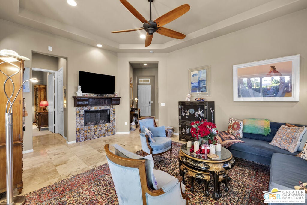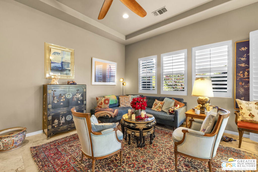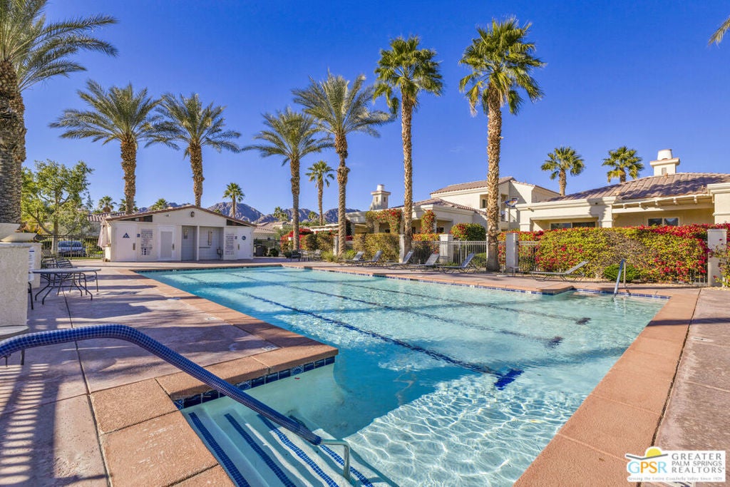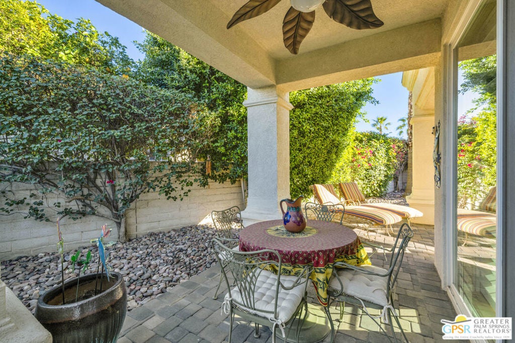 PRICE REDUCED! Bring your offers! Welcome to 80855 Calle Azul, a beautifully appointed single-story residence tucked inside the gated enclave of Puerta Azul in desirable South La Quinta. Set on one of the community's larger, premium lots along a low-traffic interior street, this home offers privacy, comfort, and flexibility ideal as a full-time residence, seasonal escape, or income-producing investment. This thoughtfully designed 2-bedroom, 2.5-bath floor plan features dual en-suite bedrooms positioned on opposite sides of the home, providing excellent privacy for guests or family. A stylish powder room near the front entry is perfectly placed for entertaining. High ceilings throughout create an open, airy feel, while travertine flooring anchors the main living areas and brand-new carpeting (installed December) adds warmth to both bedrooms. The inviting great room is centered around a decorative mosaic-tile gas fireplace, and opens seamlessly to the outdoors through sliding doors. The oversized backyard features two covered patiosone off the living/dining area and another off the primary suiteideal for morning coffee, evening cocktails, or relaxed desert living. With no lawn, the yard is intentionally low-maintenance. Recent updates include freshly painted kitchen and primary bathroom cabinetry in a light, bright white, a brand-new stainless steel refrigerator, HVAC replacement in 2020, and a new water heater in 2019. The primary bath is finished with a Jacuzzi soaking tub, creating a spa-like retreat. The home is also single-level with no interior stairs, making it especially convenient for those seeking ease of mobility. Puerta Azul is known for its lower HOA dues, which include access to two resort-style pools and spas, tennis courts, a fitness center, and a beautifully appointed clubhouse with kitchen, billiards, and gathering spaces. The community is STR-friendly, with a 3-day minimum rental rule, and is exempt from La Quinta's current short-term rental moratorium, allowing new owners to apply for a city STR permit - an increasingly rare advantage. Additional benefits include IID electric service for lower utility costs, a quiet South La Quinta location, and close proximity to PGA West, Old Town La Quinta, world-class golf, hiking, dining, and entertainment. A rare blend of privacy, practicality, and investment potential - 80855 Calle Azul delivers the desert lifestyle buyers are searching for.