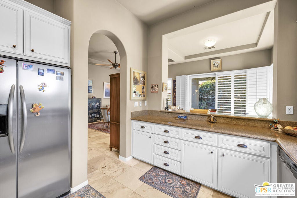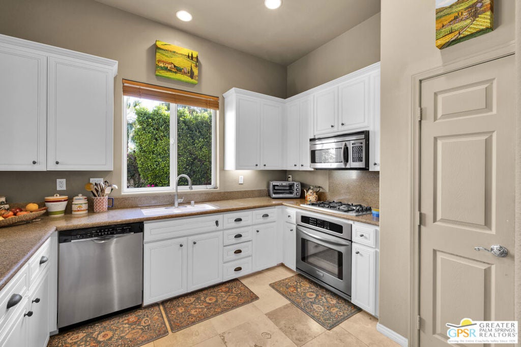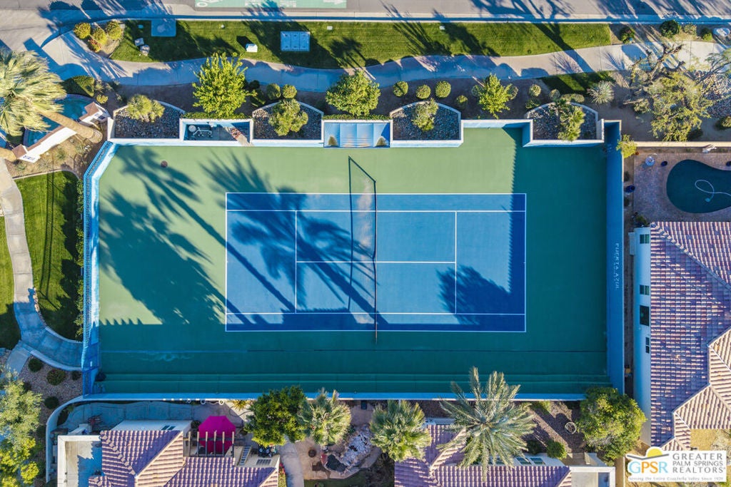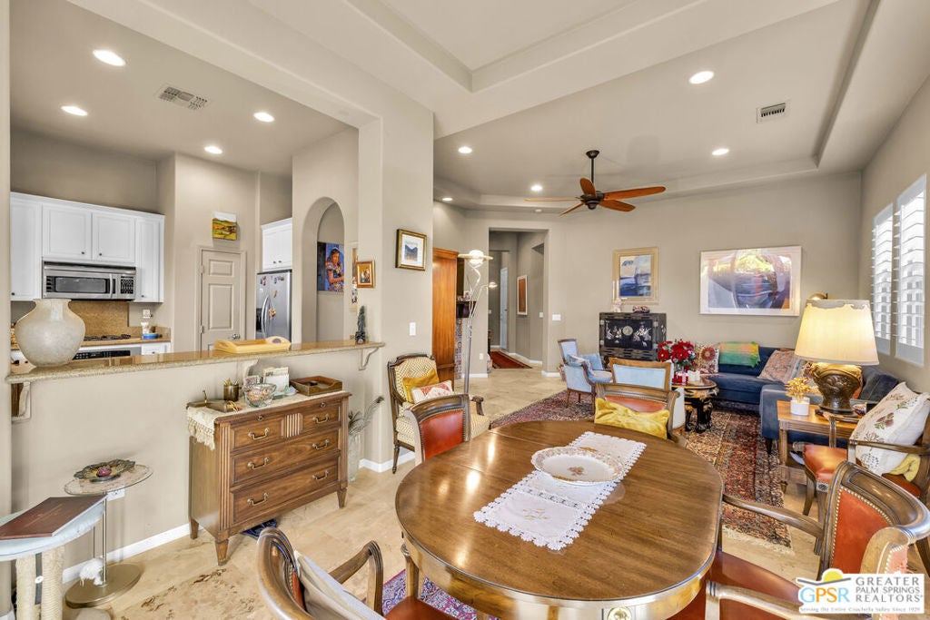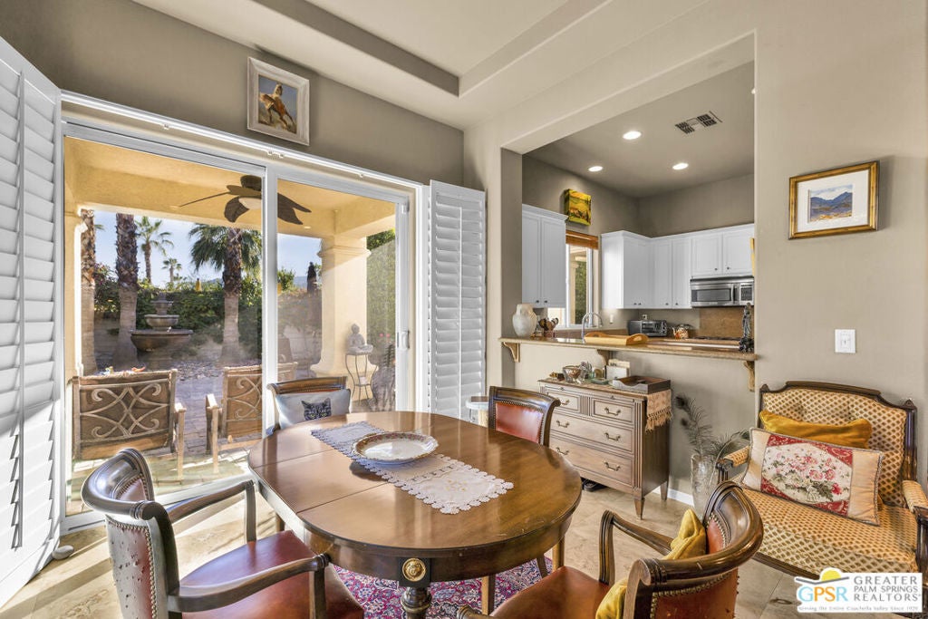 PRICE REDUCED! Bring your offers! Welcome to 80855 Calle Azul, a beautifully appointed single-story residence tucked inside the gated enclave of Puerta Azul in desirable South La Quinta. Set on one of the community's larger, premium lots along a low-traffic interior street, this home offers privacy, comfort, and flexibility ideal as a full-time residence, seasonal escape, or income-producing investment. This thoughtfully designed 2-bedroom, 2.5-bath floor plan features dual en-suite bedrooms positioned on opposite sides of the home, providing excellent privacy for guests or family. A stylish powder room near the front entry is perfectly placed for entertaining. High ceilings throughout create an open, airy feel, while travertine flooring anchors the main living areas and brand-new carpeting (installed December) adds warmth to both bedrooms. The inviting great room is centered around a decorative mosaic-tile gas fireplace, and opens seamlessly to the outdoors through sliding doors. The oversized backyard features two covered patiosone off the living/dining area and another off the primary suiteideal for morning coffee, evening cocktails, or relaxed desert living. With no lawn, the yard is intentionally low-maintenance. Recent updates include freshly painted kitchen and primary bathroom cabinetry in a light, bright white, a brand-new stainless steel refrigerator, HVAC replacement in 2020, and a new water heater in 2019. The primary bath is finished with a Jacuzzi soaking tub, creating a spa-like retreat. The home is also single-level with no interior stairs, making it especially convenient for those seeking ease of mobility. Puerta Azul is known for its lower HOA dues, which include access to two resort-style pools and spas, tennis courts, a fitness center, and a beautifully appointed clubhouse with kitchen, billiards, and gathering spaces. The community is STR-friendly, with a 3-day minimum rental rule, and is exempt from La Quinta's current short-term rental moratorium, allowing new owners to apply for a city STR permit - an increasingly rare advantage. Additional benefits include IID electric service for lower utility costs, a quiet South La Quinta location, and close proximity to PGA West, Old Town La Quinta, world-class golf, hiking, dining, and entertainment. A rare blend of privacy, practicality, and investment potential - 80855 Calle Azul delivers the desert lifestyle buyers are searching for.