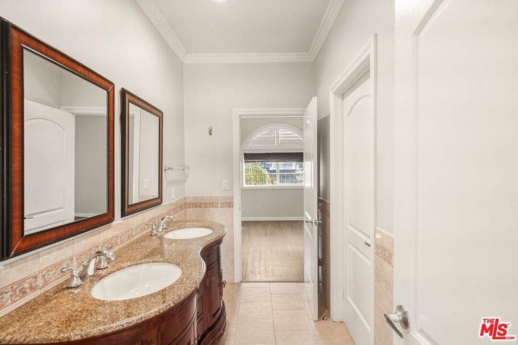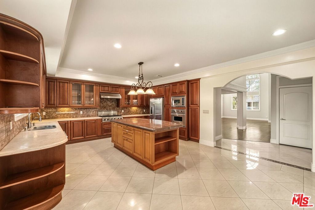 A grand two-story entry sets the tone for this exceptional Tarzana residence, where a crystal chandelier illuminates an elegant curved staircase adorned with ornate wrought-iron railings. Built in 2006, this 3,830-square-foot home delivers the rare combination of architectural distinction and everyday livability. The main level flows effortlessly from formal living and dining spaces to a chef's kitchen appointed with rich cherry cabinetry, Viking appliances, a granite island, and a mosaic tile backsplash. Hardwood floors and crown molding carry throughout, while the adjacent family room opens through large sliding glass doors to a landscaped backyard for California indoor-outdoor living. Five bedrooms, each with its own en-suite bathroom, provide uncommon privacy and flexibility. A main-floor suite accommodates guests or serves as a private home office. Upstairs, the expansive primary retreat features a walk-in closet, private balcony, and spa-inspired bath with dual vanities, soaking tub, and oversized walk-in shower with multiple shower heads. Additional bedrooms offer balcony access and generous proportions. Thoughtful details abound: designer powder room with vessel sink, recessed lighting throughout, gas fireplace, laundry area, and attached two-car garage. Located just south of Ventura Boulevard with easy access to dining, shopping, acclaimed schools, and the 101 freeway. A home of this caliber in prime Tarzana South is a rare find. Schedule your private showing today.