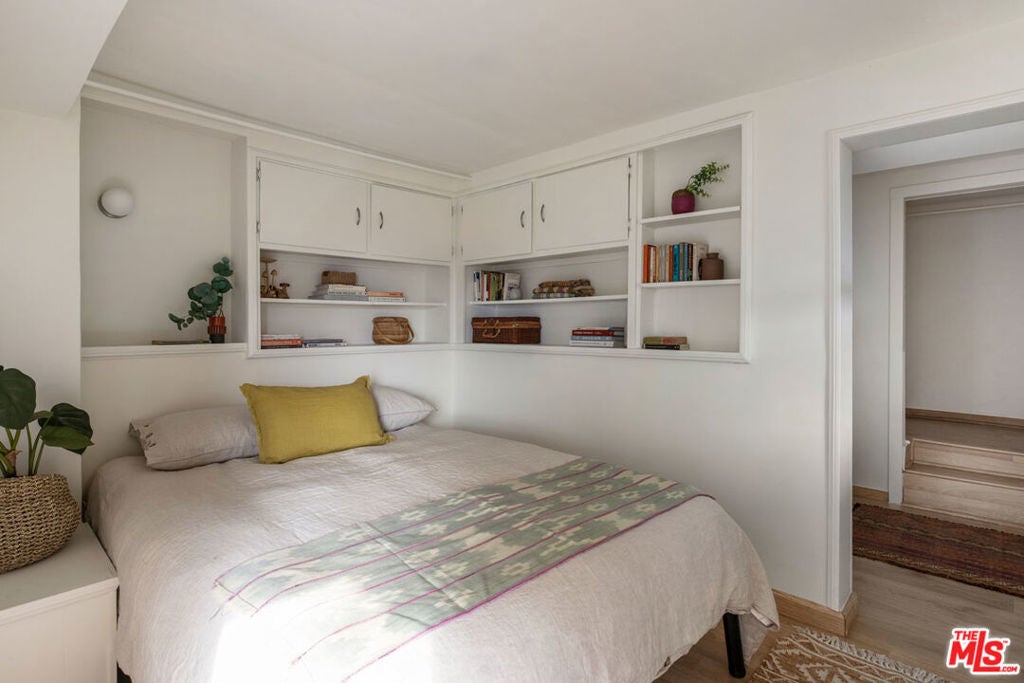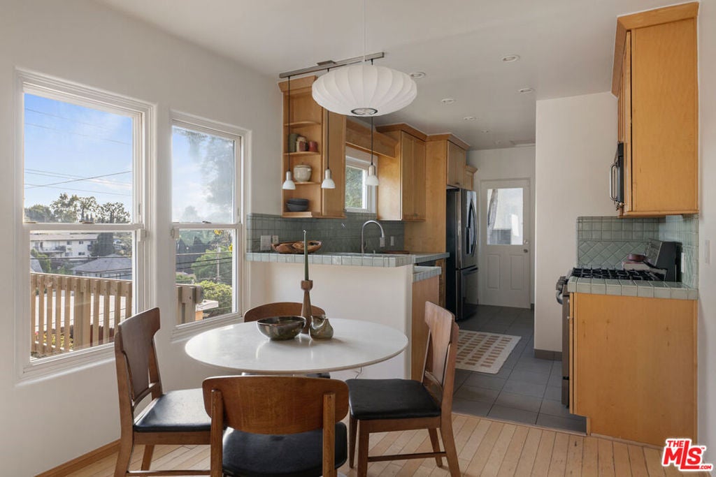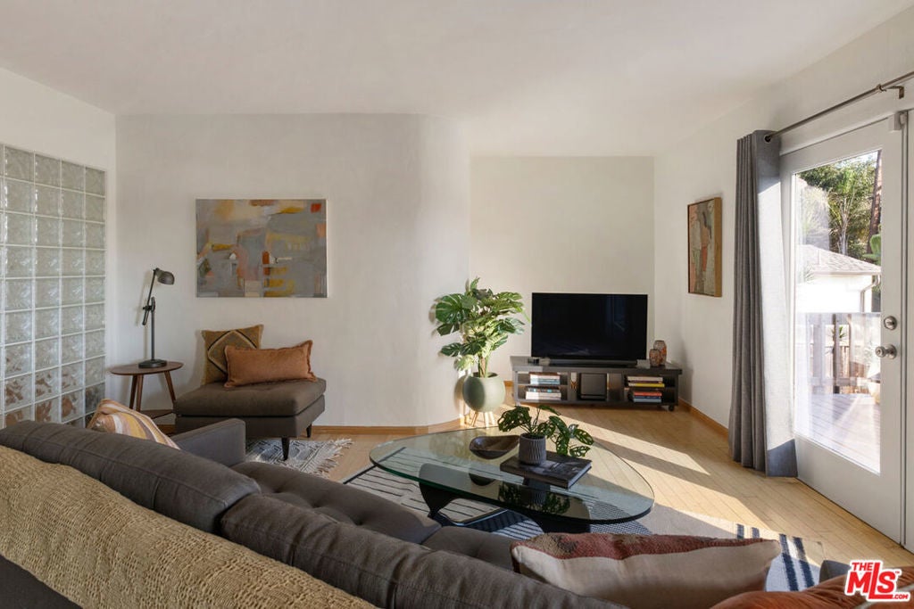 In Silver Lake, this hillside home is nestled in privacy on a quiet street, delivering a flat yard, canyon views, and additional unit with its own address. The main residence is awash in sunlight, an open-plan living space with curved walls and a glass block divider that evoke the Art Deco era. French doors open to a large deck, a breezy perch for dinner and cocktails against the backdrop of colorful sunsets and city lights. The kitchen is finished with sage green tile counters and wood cabinetry, and both bedrooms enjoy leafy views. The lower-level unit features a blue kitchen and a colorful bathroom, a versatile setup for rental income or creative use. The grassy backyard feels serene and private; the front yard is beautifully landscaped and hedged by mature trees. Amenities include AC, laundry, agarage with direct access, and driveway parking. R2 zoning holds future potential, in a great location moments from the Reservoir, Whole Foods, Constellation Coffee, and more.