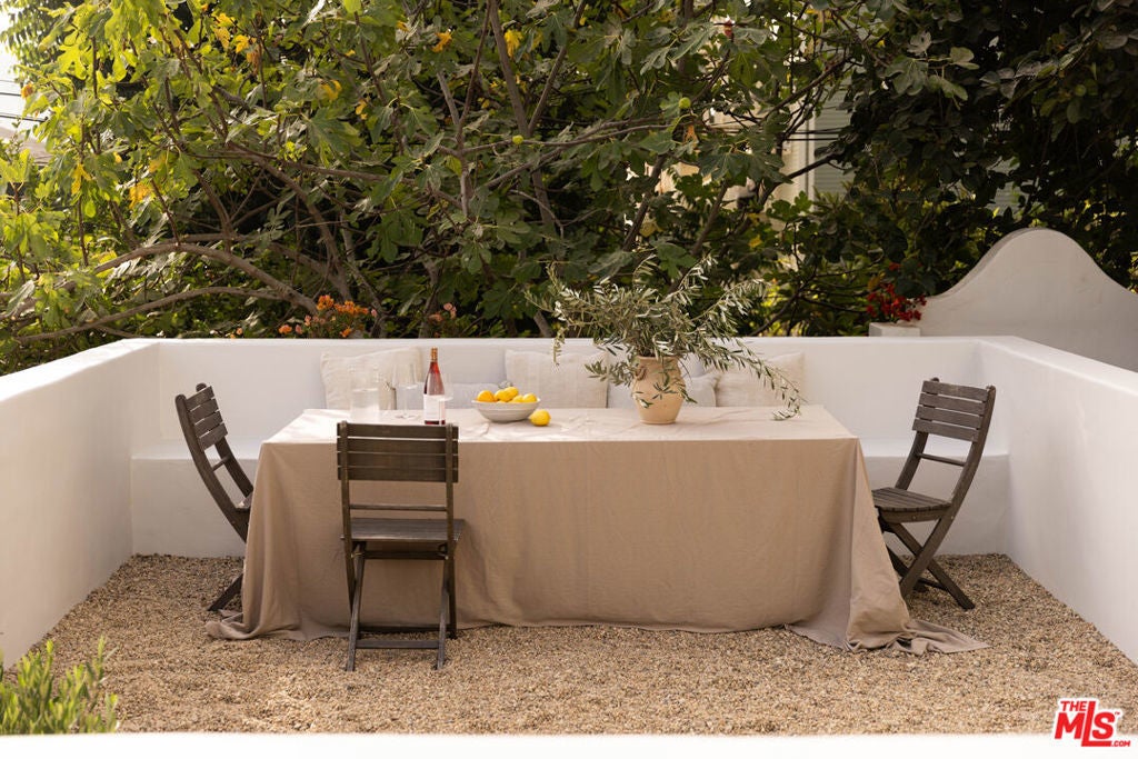 Positioned on the upper level, the space unfolds, revealing glimpses of a bygone era, giving way to modern living with timeless allure. Windows with machine-drawn glass render a spectacular light, casting wavy reflections throughout the day. The open living room and dining area look onto a striking focal point of honed marble that lines the kitchen counters alongside the commercial-grade Italian range. Cleverly arranged, the U-shaped kitchen has display shelves for your Hasami ceramics and a wall of floor-to-ceiling custom white oak cabinetry for your kitchenware. Wall-to-wall restored casement windows in the main bedroom frame neighborhood views with the backdrop of LA's pink skies. Rear gardens provide each owner with individual outdoor space surrounded by mature olive and fruit trees, star jasmine, lavender, rosemary, and some sage, creating a wonderful aromatic cluster of both fragrant and culinary herbs. Located just south of Sunset Boulevard, the residences are moments away from our favorite cafes, restaurants, and markets, including Honey Hi, Dada Market, Canyon Coffee, Little Fish, Bacetti, Donna, Cookbook Market, and Lassens Natural Foods.