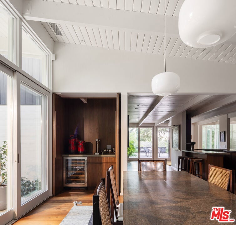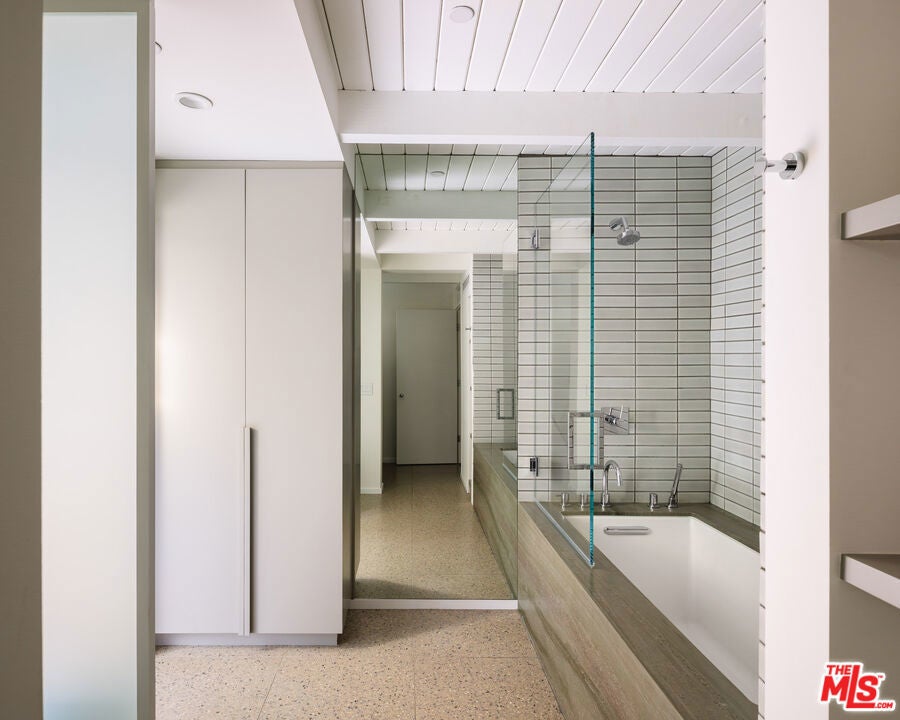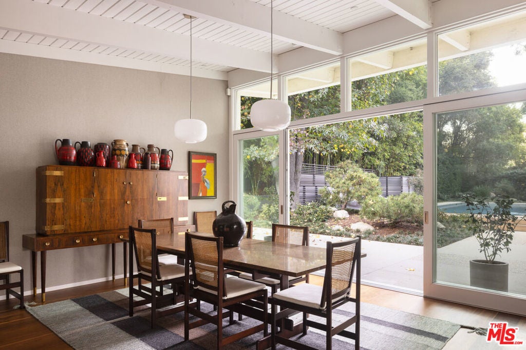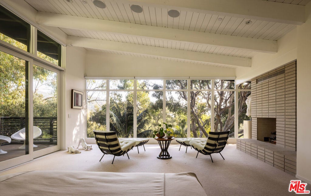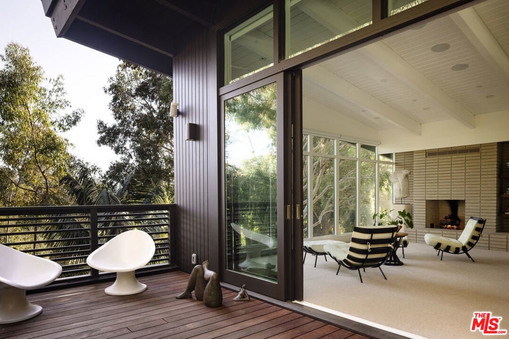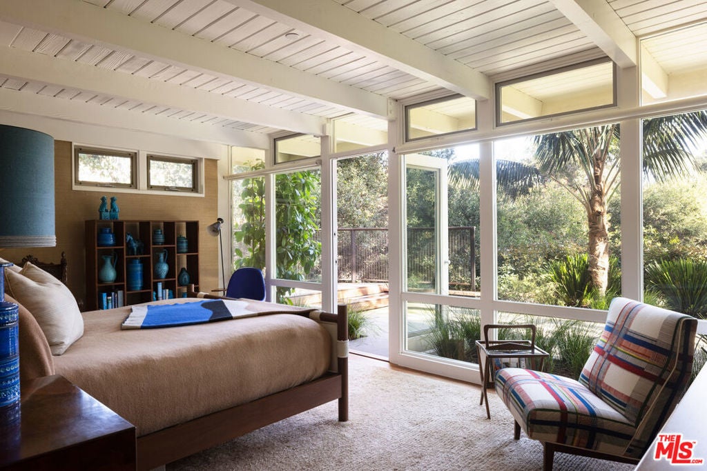 The Veneklasen House, originally completed in 1951, is a rare architectural offering in Mandeville Canyon. Designed by architect Kenneth Lind with significant influence from Modernist master Pierre Koenig, the home represents an important piece of Los Angeles design history. Koenig's impact is most evident in the dramatic living room, where an accordion-fold glass wall and sculptural brickwork create a seamless connection between architecture and landscape.The privately-gated residence spans approximately 3,904 square feet and includes three bedrooms, three bathrooms, and one powder room on a generous lot of approximately 28,314 square feet. A thoughtfully designed second-level addition introduced a light-filled primary suite positioned to take full advantage of the canyon setting, offering an elevated and private retreat immersed in nature.A classic post-and-beam structure with expansive glass walls defines the home's open yet intentional layout. Indoor and outdoor spaces flow effortlessly to landscaped gardens by Mark Tessier, courtyard areas, and canyon views. The V-shaped layout of the estate centers around a remarkable, sculptural mature eucalyptus tree supported by manicured, low-lying native plantings, reinforcing seclusion, artful balance, and a deep sense of place. Interiors are refined yet comfortable, featuring a cohesive palette of dark walnut, stone, layered textiles, and playful touches of celadon quartzite. Open, light-filled spaces are thoughtfully divided into distinct zones, each with its own atmosphere. Nearly all furnishings are vintage, lending warmth, authenticity, and a collected aesthetic that complements the architecture without distraction.Private, immersive, and architecturally significant, receiving the 2022 AIA LA Award for Historic Preservation, this is a rare Mandeville Canyon offering that balances pedigree, comfort, and legacy.