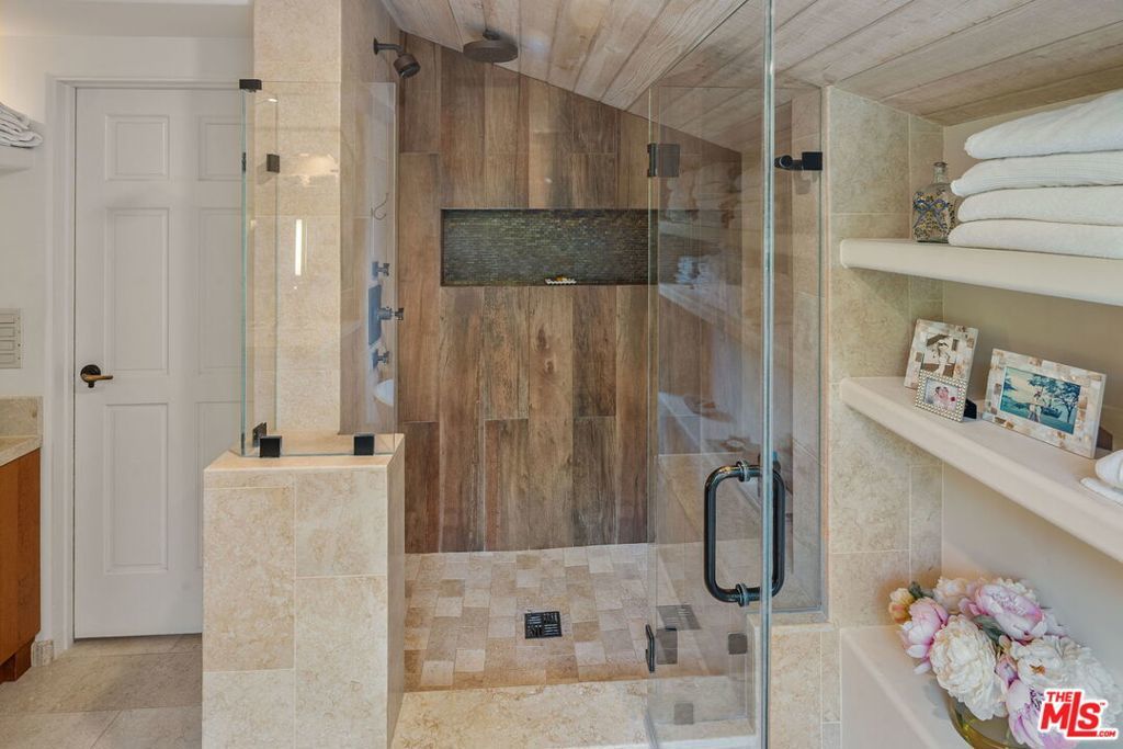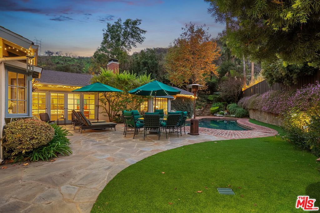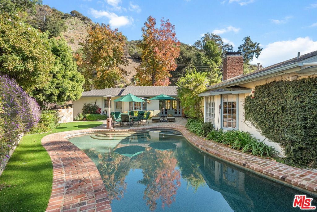 Tucked away in the coveted enclave of Upper Mandeville Canyon, 3859 Mandeville Canyon Road is a serene 1950s sprawling Ranch House nestled in the heart of one of Brentwood's most prestigious neighborhoods. Set against a lush canyon backdrop, this warm and inviting retreat offers 2,644 square feet of effortless living with 4 bedrooms, 3 bathrooms, a bonus room perfect for an office or library, a formal living room and a cozy family room, organically blending classic character with thoughtful modern upgrades. Sunlit interiors flow seamlessly along the new hardwood floors, from the updated kitchen to the beautifully remodeled Primary Suite into expansive living and family rooms, creating a home that feels both intimate and ideal for entertaining. Outdoors, the property truly shines. A resort-style pool and spa, custom outdoor kitchen, waterfall feature, and newly installed turf, landscaping and lighting set the stage for relaxed canyon living, whether hosting gatherings or enjoying quiet evenings under the stars. Meticulously maintained and thoughtfully improved, including upgraded plumbing throughout, tankless water heater, central A/C and heat, hardwood floors, remodeled bathrooms, a renovated family room with stone fireplace, Sonos sound system, ADT security, and extensive drainage and landscaping enhancements. This is a rare opportunity to own a timeless canyon home that has been lovingly cared for, offering privacy, comfort, and the unmistakable charm of Brentwood living.