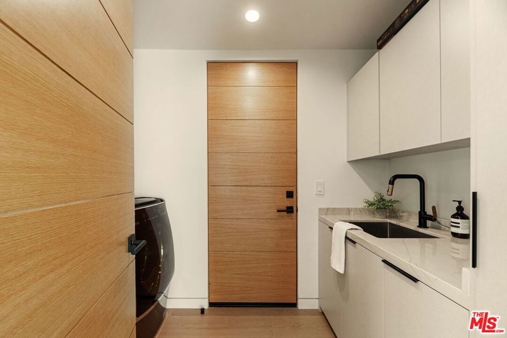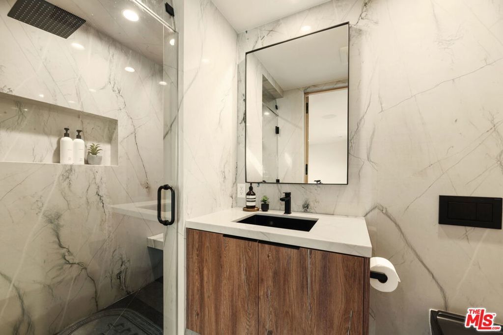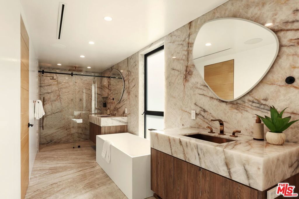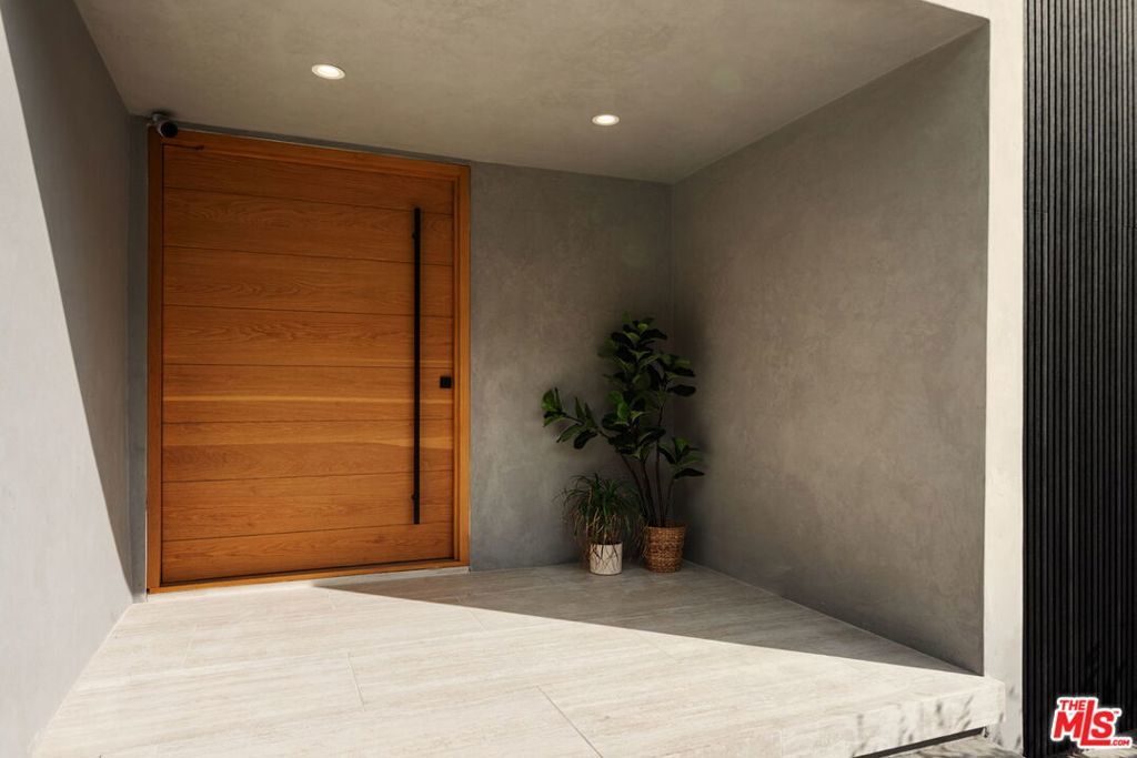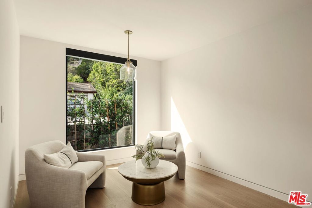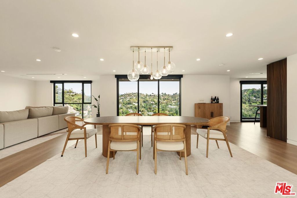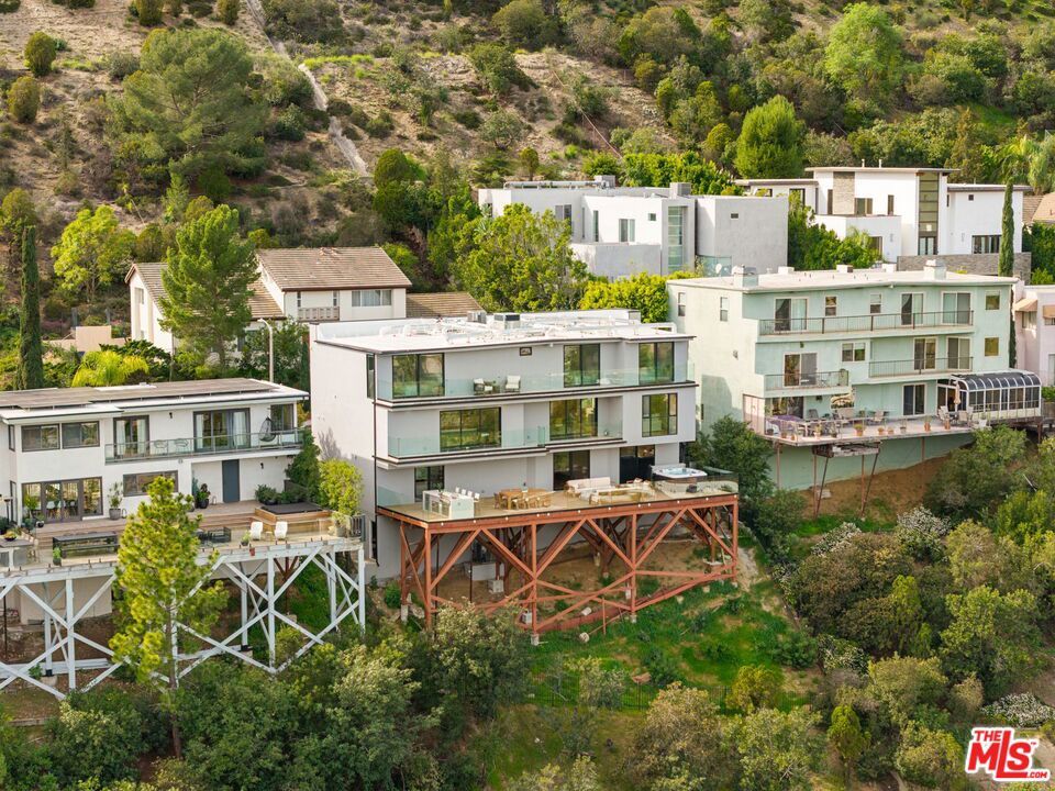 Located in the coveted Mount Olympus neighborhood of the Hollywood Hills, this completely remodeled 4-bedroom, 4.5-bath modern home offers spectacular city and canyon views in a serene setting. The open floor plan is designed for both everyday living and entertaining, featuring a gourmet kitchen with all Miele appliances, a built-in espresso machine, custom Italian cabinetry by Molteni & C, and Taj Mahal marble countertops and a breakfast bar for casual dining. The open floor plan includes a dining area and living room with a fireplace, opening to balconies offering views from every room. The downstairs level opens to a brand-new deck with a spa, fire pit, and outdoor kitchen complete with a built-in BBQ, cooktop, refrigerator, and new teak furnishings. There is a den/ office and a steam shower to use after a workout in your own personal gym. All main bedrooms are located on the top level - primary suite and secondary bedrooms feature custom walk-in closets, while spa-inspired baths include high-end stone finishes and heated floors. Additional highlights include real hardwood floors, built-in Sonos speakers, motorized Lutron shades, a workout room, movie theater/media room, security system, and two electric vehicle charging stations. Prime location in Los Angeles offering privacy and tranquility, yet just moments from the Sunset Strip and city conveniences.