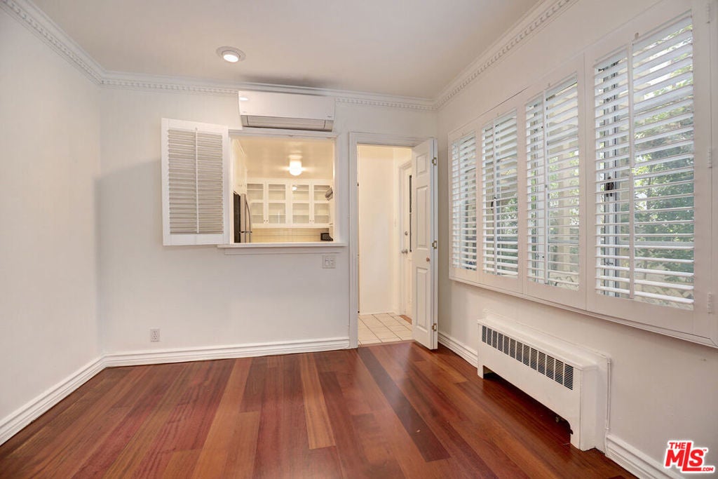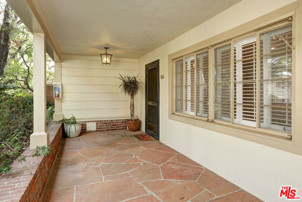 Set back from Sunset Boulevard amid lush, park-like grounds, this serene and private oversized studio offers a rare sense of tranquility with a separate en-suite room and two outdoor patios. The residence lives more like a small home, featuring an open and spacious living and dining area that flows seamlessly off the chef-style kitchen.The well-appointed kitchen offers generous cabinetry, a garden window, in-unit washer and dryer, built-in range, stainless steel oven, refrigerator, and dishwasher, along with a rear door opening to a private patio. Abundant windows throughout the unit frame peaceful views of mature trees, lawns, and greenery. The separate en-suite room, complete with a closet, is ideal as a sleeping area, home office, or media room and leads to a spacious bathroom featuring a separate soaking tub and walk-in shower. Additional features include crown moldings, hardwood floors, plantation shutters, recessed lighting, two wall-mounted AC units, a large closet, front and rear patios, and a dedicated parking space. The boutique complex evokes a European garden atmosphere, with winding pathways, manicured grounds, rose gardens, and lush landscaping throughout. Amenities include a pool, spa, gym, sauna, showers, bathrooms, and ample guest parking. Ideally located near Brentwood Village with convenient access to major freeways.