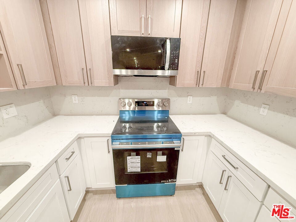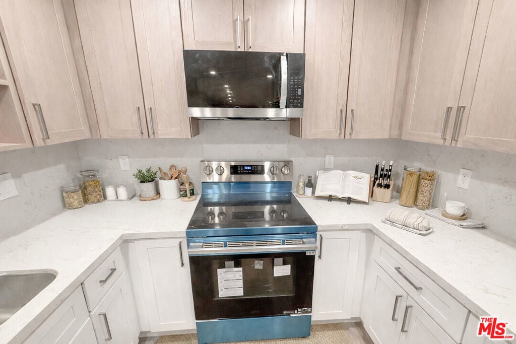 Spacious first-floor residence featuring two bedrooms and two bathrooms, built with top-of-the-line quality and thoughtful upgrades throughout. This beautifully updated unit showcases new hardwood flooring, modern doors, and a fully renovated kitchen with custom cabinetry, quartz countertops, and stainless steel appliances, including a French-door refrigerator and dishwasher. Enjoy year-round comfort with a new mini-split A/C system and the convenience of an in-unit washer and dryer. Generous closet space with built-in wired organizers, energy-efficient LED lighting throughout, and a private front patio complete this exceptional home.