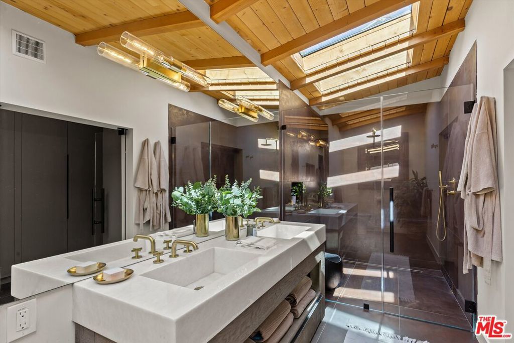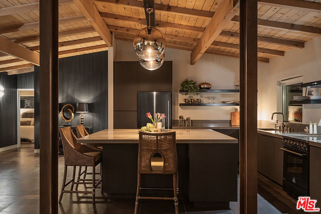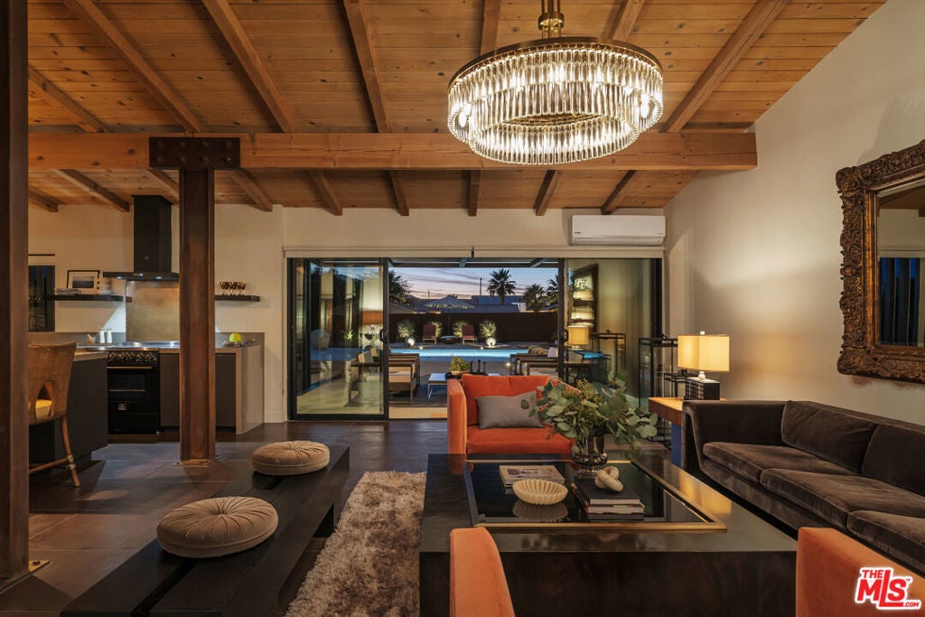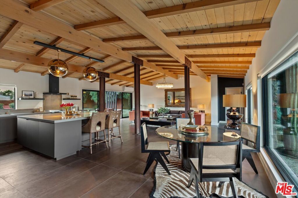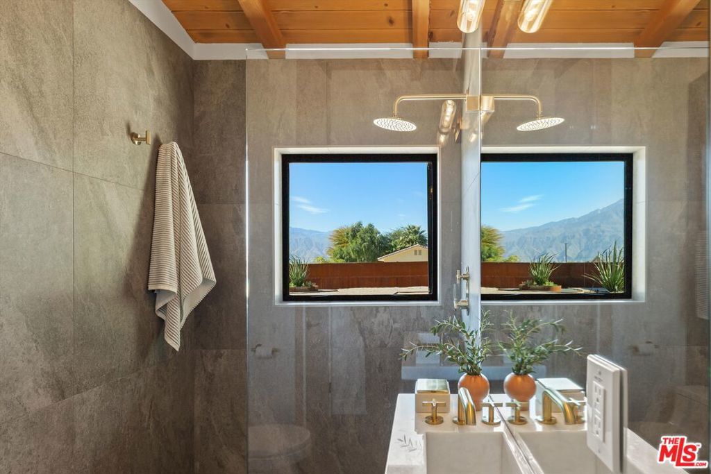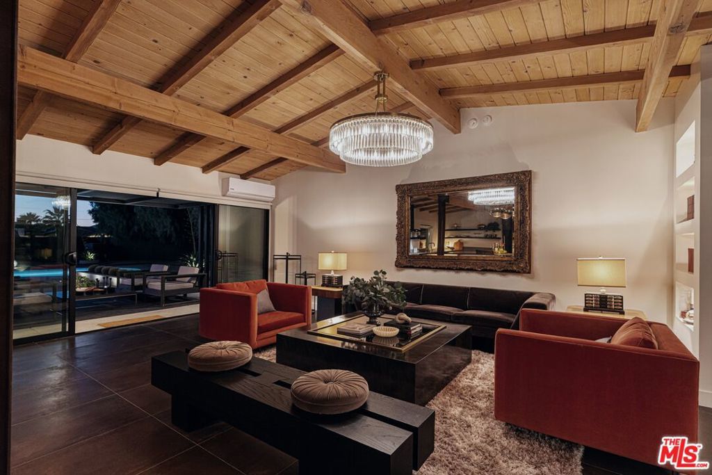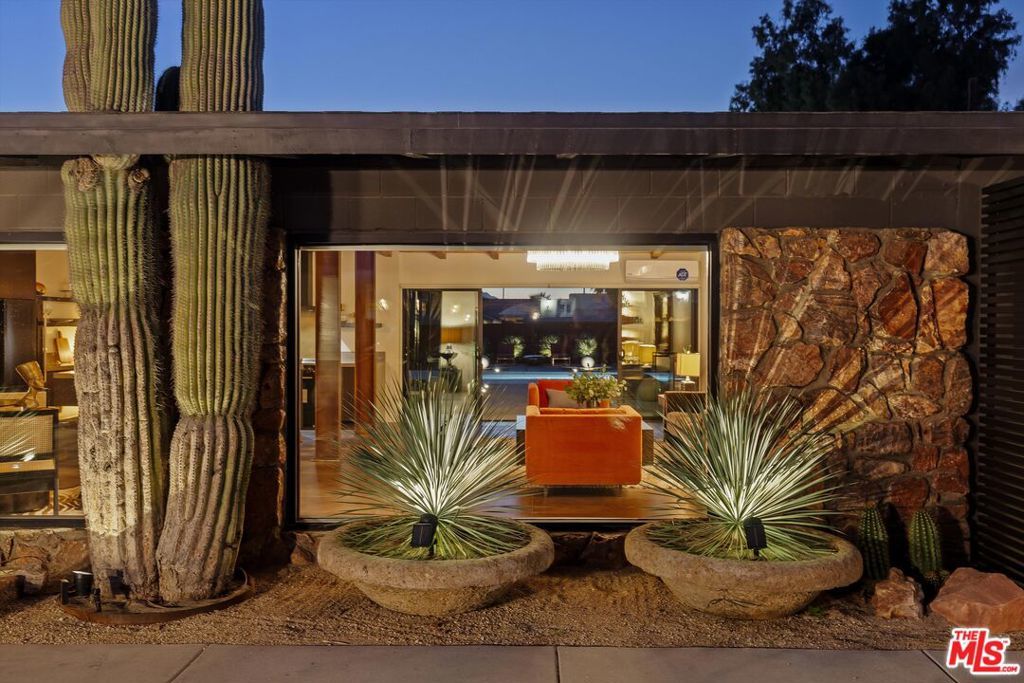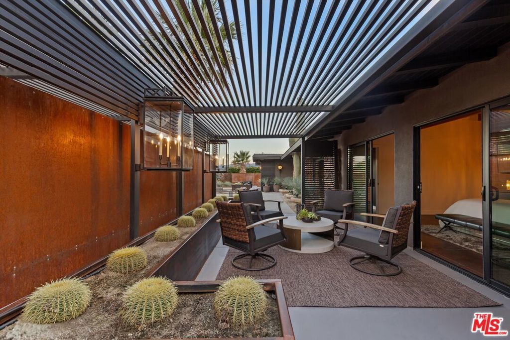 A secluded desert retreat where architecture, landscape and light move in quiet harmony. Set behind a private gate, this extensively remodeled mid-century residence offers a rare balance of refined design, intentional layout and effortless indoor-outdoor living, framed by open skies and mountain silhouettes. At the heart of the home is an expansive great room where the kitchen, living and dining areas unfold as one continuous, light-filled space. Clean modern lines, exposed original wood beam ceilings and curated textures create a sense of grounded luxury, while expansive glass sliders stretch along the perimeter, dissolving the boundary between inside and out. The kitchen anchors the space both visually and functionally, featuring sleek custom cabinetry, integrated appliances, open shelving and a dramatic central island designed for gathering, cooking and conversation. The primary suite occupies its own private wing, offering a serene retreat with generous proportions, direct outdoor access and a spa-like bath complete with dual vanities and a glass-enclosed shower. A spacious walk-through closet and private patio enhance the sense of retreat and separation from the rest of the home. On the opposite side, three additional bedrooms with private patios and two spa-like baths are thoughtfully arranged, creating a comfortable guest or family wing. Outside, the property truly comes alive with a resort-style pool surrounded by sculptural desert landscaping and multiple lounging zones designed for slow mornings and golden-hour evenings. The seamless connection between the interior and outdoor spaces allows the home to live as beautifully outside as it does within. Located just 10 minutes from Palm Springs, this stunning property was created for those who value intentional living, privacy and timeless desert style - a place where modern design meets the restorative rhythm of the desert.