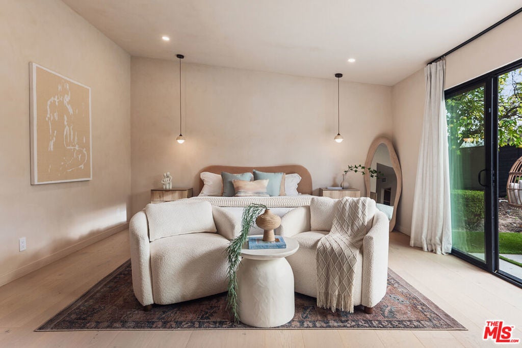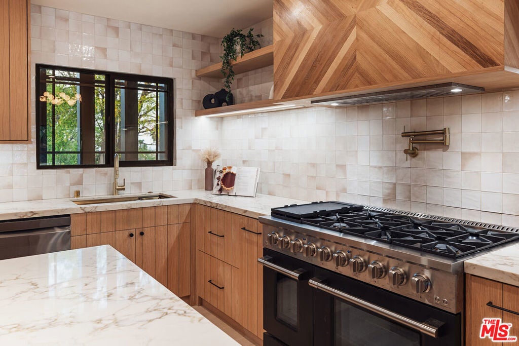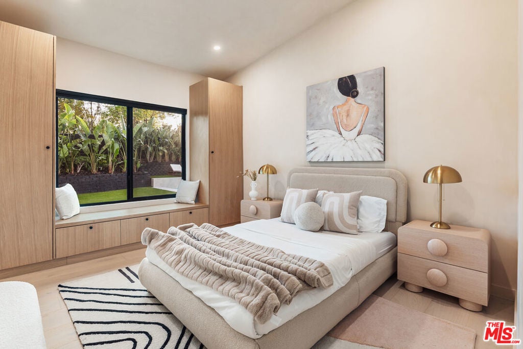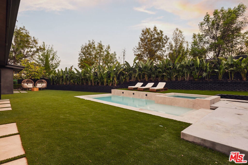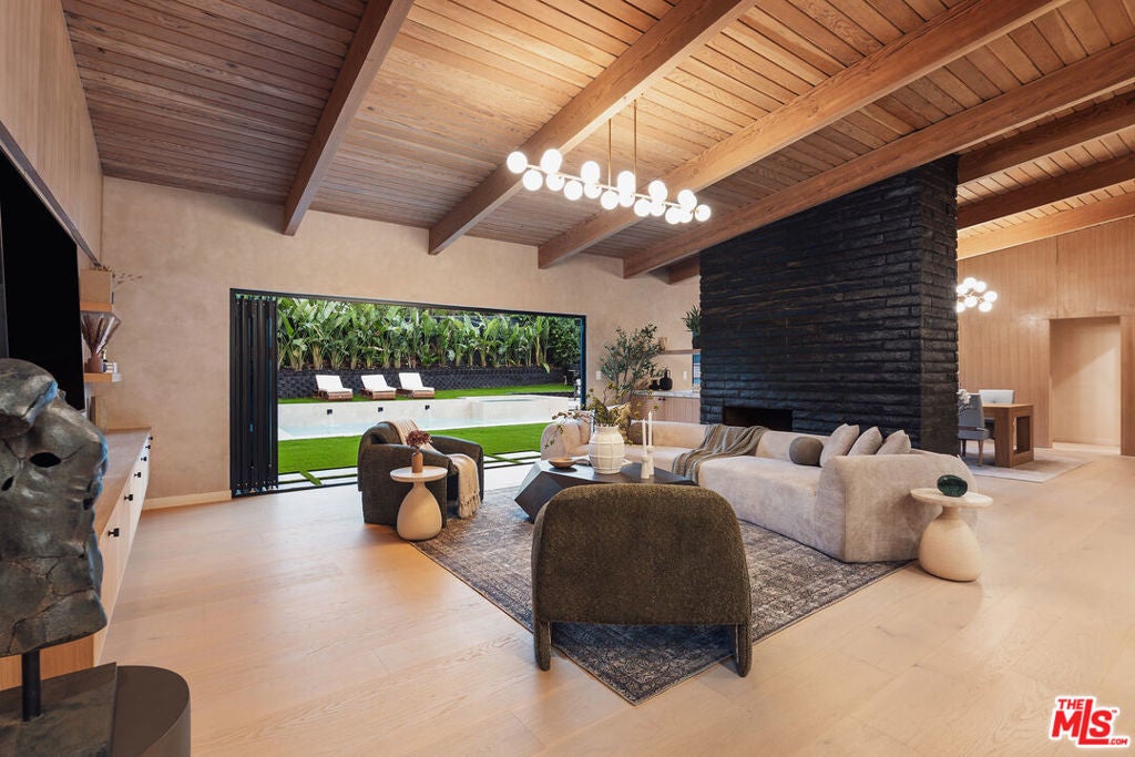 Welcome to this impeccably reimagined Mid-Century Modern residence by renowned architect Charles Du Bois, where organic modern design meets elevated contemporary living in the heart of Woodland Hills. Set on an expansive 12,000-square-foot lot, this 3,052-square-foot architectural showpiece offers five bedrooms, three bathrooms, and a seamless indoor-outdoor lifestyle curated for modern luxury. The interiors unfold through a light-filled, open-concept floor plan highlighted by soaring vaulted wood ceilings, exposed beams, curated lighting, and a striking double-sided fireplace that anchors the living spaces with warmth and sophistication. The chef's kitchen is both refined and functional, featuring stainless steel appliances, sleek marble countertops, and custom cabinetry ideal for intimate gatherings and elevated entertaining alike. The primary suite serves as a serene retreat, complete with a spa-inspired bath and two generous walk-in closets. Additional bedrooms are thoughtfully designed to offer flexibility, comfort, and style. This residence has been comprehensively updated with all major systems fully replaced, including new plumbing, electrical, roofing, and mechanical systems, offering modern efficiency and peace of mind alongside its timeless design. Outdoors, the property transforms into a private resort. Enjoy a newly constructed pool, a covered cabana with a fully equipped outdoor kitchen, and lush, manicured grounds that provide exceptional privacy and tranquilityperfect for entertaining, relaxing, or enjoying everyday California living. Ideally located moments from Calabasas' premier dining and shopping and within a highly regarded school district, this exceptional offering delivers a rare blend of architectural pedigree, modern luxury, and an enviable lifestyle.