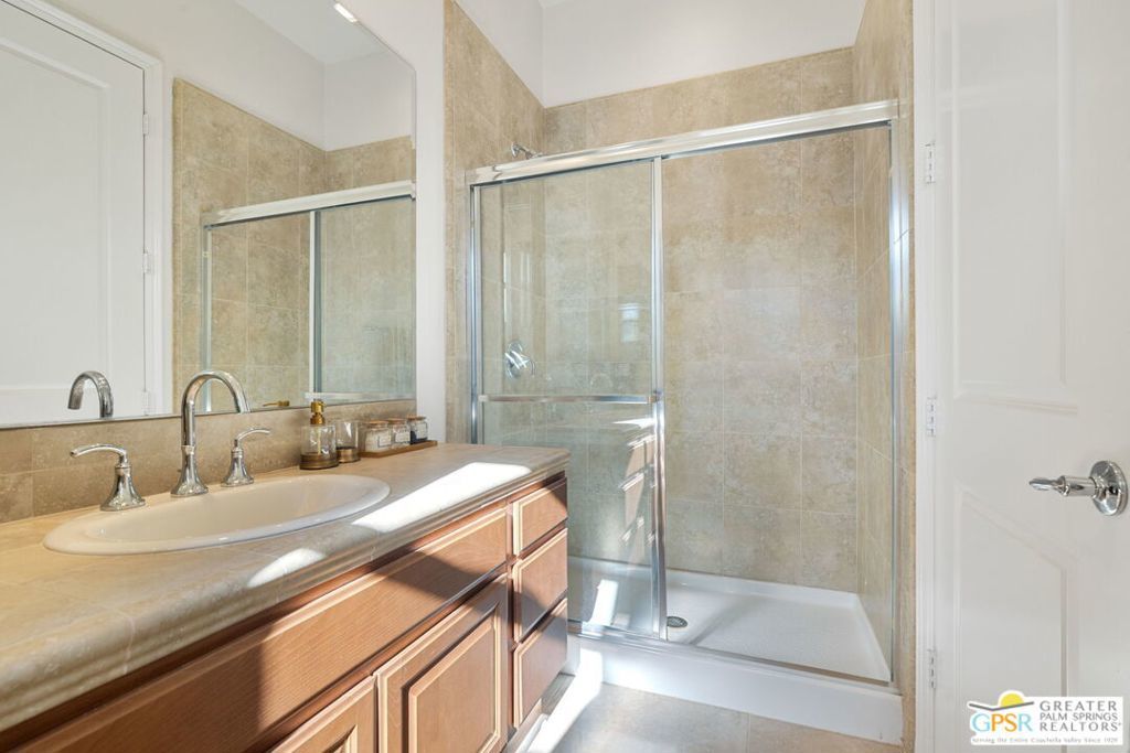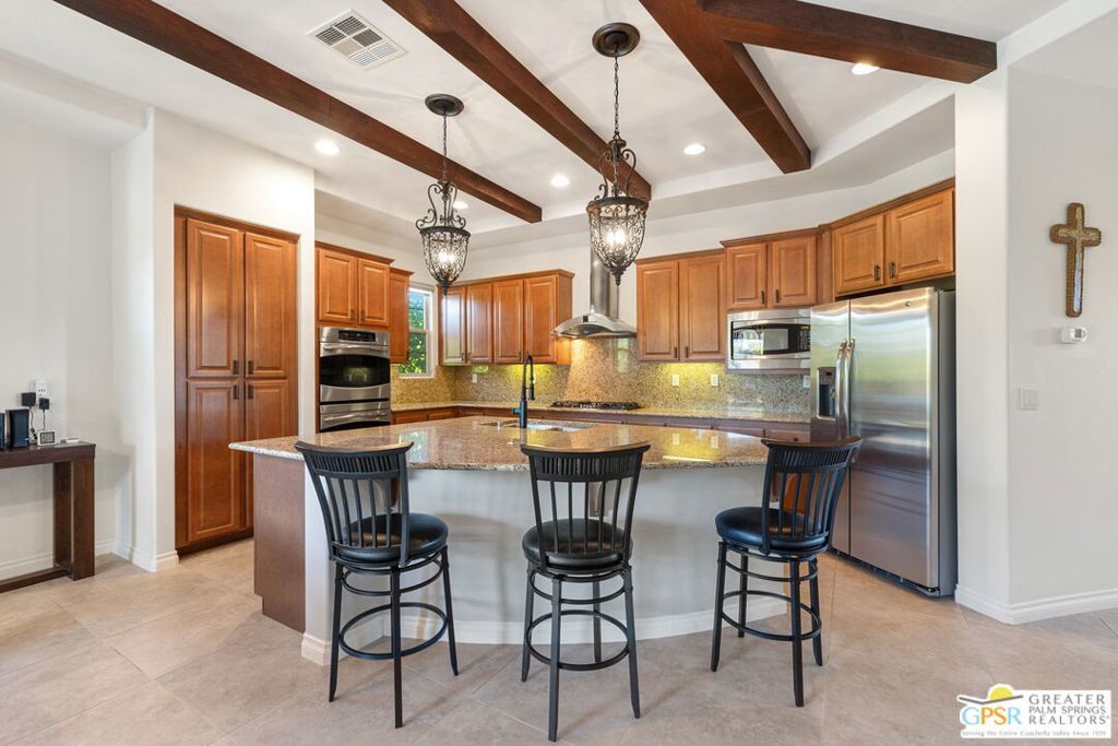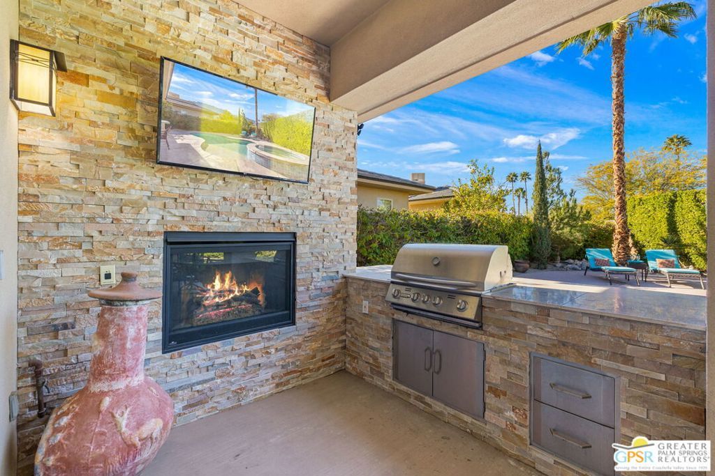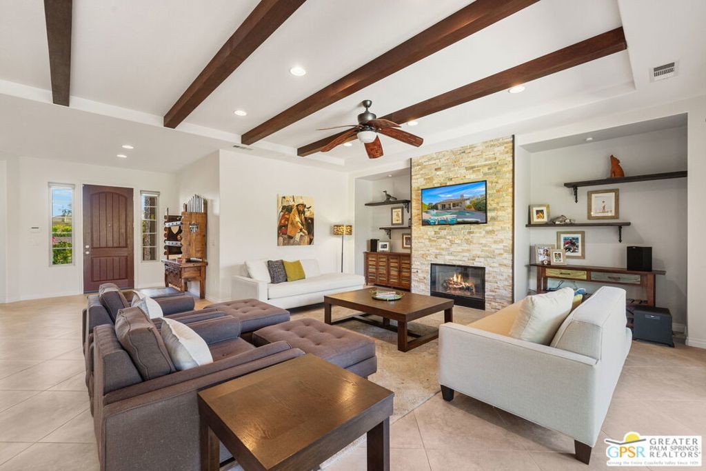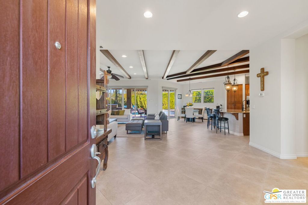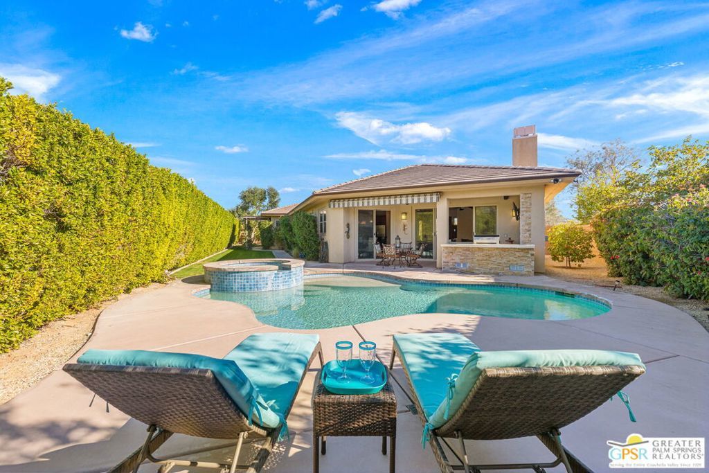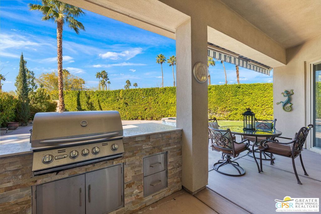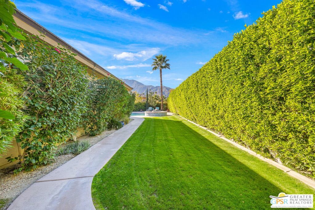 Enclave at Sunrise, an intimate private cul-de-sac of only 52 homes, this Residence Plan Two, completed in 2013 delivers refined Palm Springs living with privacy, scale, and Mountain views. The interior is bright and architectural with soaring beamed ceilings, designer lighting, tile floors throughout, and expansive glass sliders creating a seamless indoor-outdoor connection. A formal dining space anchors the layout and flows naturally into the main living areas. The kitchen is both functional and elegant, featuring rich wood cabinetry, granite countertops, stainless steel appliances, double ovens, and a large prep island. It opens to a dining area and a spacious great room centered around a fireplace. The primary suite is a private retreat with a sitting area, and a spa inspired bath offering marble countertops, dual sinks, soaking tub, separate shower, and a generous walk-in closet. A well-appointed en-suite guest bedroom provides comfort and privacy. An attached private casita with its own entrance offers flexible use for guests or a quiet home office. The backyard is designed for resort style living with a covered patio, gas fireplace, built in BBQ, retractable awning, and a pool with tanning shelf and spa. Mature landscaping, lawn areas, and tall ficus hedges create exceptional privacy, while a gated side yard with trellis detail adds both form and function. Elegant, understated, and thoughtfully designed, this home offers a Quiet Luxury Lifestyle in one of Palm Springs' most desirable enclaves.