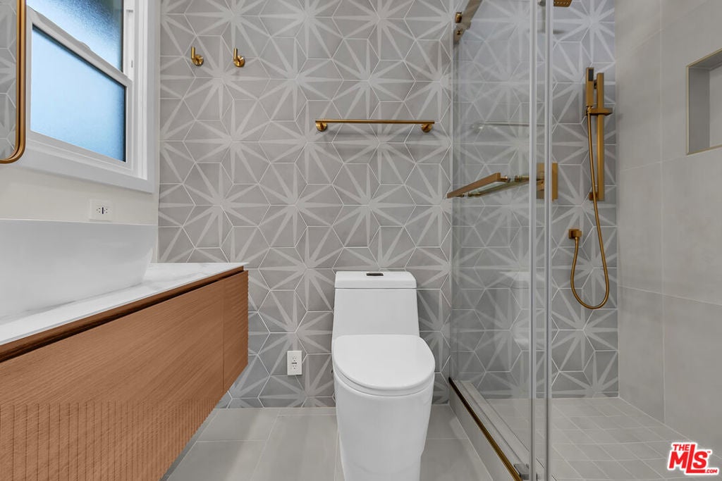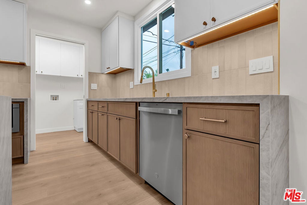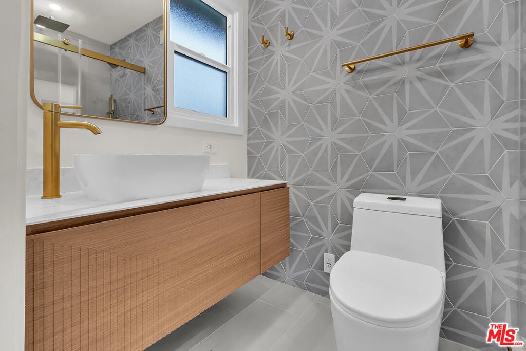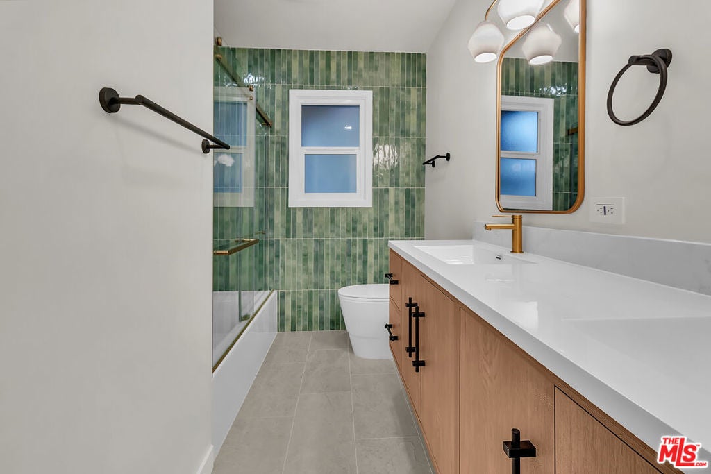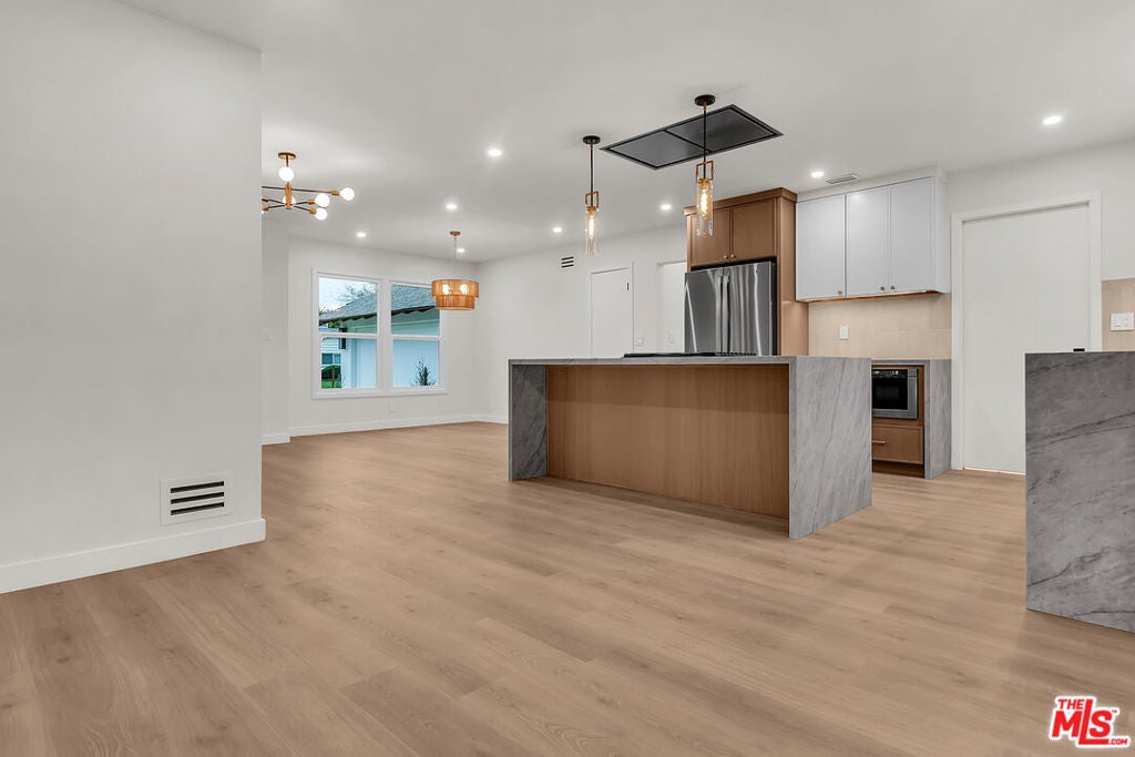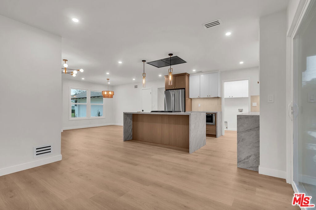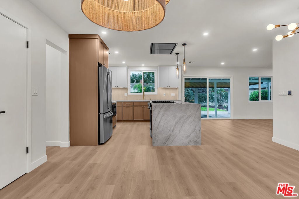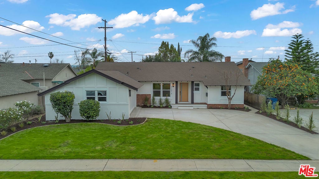 Step into this completely reimagined single-story Canoga Park home with show-stopping curb appeal, open-concept living, and designer finishes throughout. This 3-bedroom, 2-bath residence offers 1,386 SF of light-filled space, wide-plank flooring, recessed lighting, and curated fixtures at every turn. The chef's kitchen is the centerpiece, featuring a dramatic waterfall-edge stone island, two-tone cabinetry, under-cabinet lighting, high-end stainless appliances, and a built-in microwave drawer, opening seamlessly to the living and dining areas for effortless entertaining. Large sliders and a flowing layout create an effortless indoor-outdoor experience, ideal for hosting and everyday living. Stylish, spa inspired bathrooms showcase bold tile work, modern vanities, and elevated finishes. Outside you can enjoy a freshly landscaped front yard, oversized driveway, and a spacious backyard with a covered patio and lawn. Set on a generous 7,537 SF lot, the backyard offers room to relax, play, and entertain, plus excellent ADU potential, ideal for a guest house, multigenerational living, or a future income-producing unit (buyer to verify feasibility, zoning, permitting, and requirements). Convenient West Valley location near shopping, dining, parks, schools, and commuter routes.