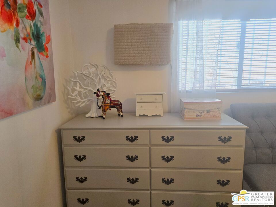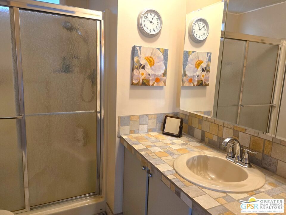 The word ALL-ENCOMPASSING cannot do this home justice! You have just the right sized cozy space inside and massive outdoor privatized areas outside, both front and rear. The location is ideal for those looking for a retreat that has amazing viewpoints. Enough cannot be said regarding the unique full frontage covered Patio with full length security screening that looks west to panoramic views of Mounts San Jacinto and San Gorgonio, and the Banning Pass. The quiet neighborhood is perfect for relaxation and unwinding. With easy access to nearby conveniences and attractions in the Coachella Valley, residents enjoy the accessibility of city living amenities while still being able to enjoy country tranquility. This 2 Bedroom, 2 Bath home that is just the right size at 960 SF is located in the Northwest section of Desert Crest Country Club, and has little traffic to bother your Desert evenings. Whether you are looking for a permanent residence or a vacation home, this property offers the perfect combination of comfort, convenience, and charm. Parking in the covered Carport is behind gates, giving you further privacy. Inside, the Living Room and Dining Area stretch across the entire front of the home, with large Windows and Slider Door access to the Deck that also covers the entire West end of the home, and gives you a tremendous outdoor space to enjoy. As mentioned, a full-length metal mechanized security screen helps with security and privacy. The Kitchen has great space to prepare to entertain you family and guests, with the Breakfast Bar area and countertops done right in custom laminate and updated granite. Full facilities are available from the natural gas Range to the beautiful Banquet style Refrigerator. Microwave and Dishwasher complete the full setup to make cooking a breeze. With great separation of public and personal spaces, the ensuite Master Bedroom and second Bedroom and Bath are luxuriously sized, with both Bedrooms having walk-in Closets, and the Baths nicely laid out for comfort and relaxation. But the best place of all are the titanically sized raised and private side Patio and the separate concreted rear Yard that complements the established mature plantings and trees. Umbrella Tables make it feel like a tropical resort, giving you relaxation and immense area to entertain the days away with loved ones. On the practical side, two separate Sheds create storage and utility capabilities. You will never want to leave home! Desert Crest Country Club is a wonderfully Active 55+ Community that provides all the activities you want. The Desert Crest Country Club community boasts a 9-hole par-3 golf course, inviting residents to enjoy free leisurely rounds amid the picturesque setting of pond and mature trees that boast views of Mounts San Jacinto and San Gorgonio and the iconic windmills of the Banning Pass. This oasis extends beyond the golf course. Residents here enjoy a multi-faceted Clubhouse featuring a healthy mineral water Pool and Spas, providing a serene escape and a hub for plenty of social connections. Indoor Shuffleboard and other activities are a welcome diversion here at the Clubhouse, with many interior facilities to keep you moving and fit. The onsite cafe caters to culinary cravings, the dog groomers attend to furry companions, and the real estate office ensures all needs are met with ease. These conveniences foster not just a residence but a sense of belonging within a home and community bound by shared experiences and vibrant camaraderie. This home represents a harmonious blend of comfort, style, and functionality, creating a delightfully private haven within the heart of Desert Crest Country Club. Whether indulging in a round of golf, luxuriating in the mineral water pool, playing shuffleboard, or simply savoring the serenity of the surroundings from your very private rear deck, this property offers a unique and fulfilling 55+ living experience, where every moment is the essence of a life well-lived!