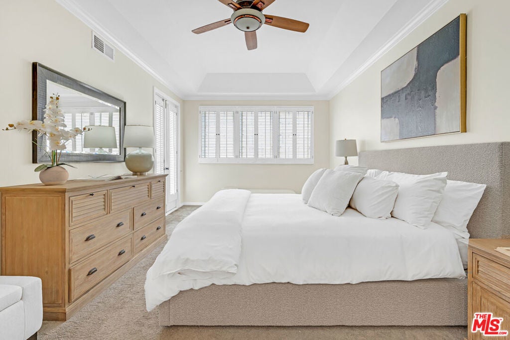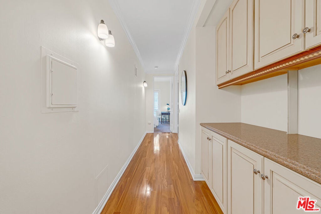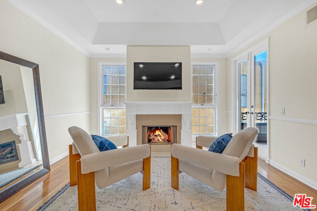 Welcome to this bright and spacious 2-bedroom, 2.5-bath condo in the heart of Westwood, just three blocks from Westwood Village and minutes from UCLA. Nestled on a picturesque tree-lined street, this elegant residence features soaring 10-foot ceilings, crown moldings, French doors, and rich hardwood floors throughout the living, dining, and hallway areas. The open living room boasts a wood-burning fireplace and opens to a covered balcony, perfect for morning coffee. The kitchen is equipped with a gas range, Silestone countertops, stainless steel appliances, and a built-in wine fridge. Additional highlights include a stunning floor-to-ceiling built-in bookcase, in-unit washer and dryer, central heat and A/C, and ample storage throughout, including a an additional storage room. The pet-friendly building offers outstanding amenities: 12 guest parking spaces, a spa, gym, sauna, and two secure tandem parking spots in a gated garage. Residents enjoy enhanced peace of mind with controlled building and elevator access, as well as earthquake and wildfire insurance.