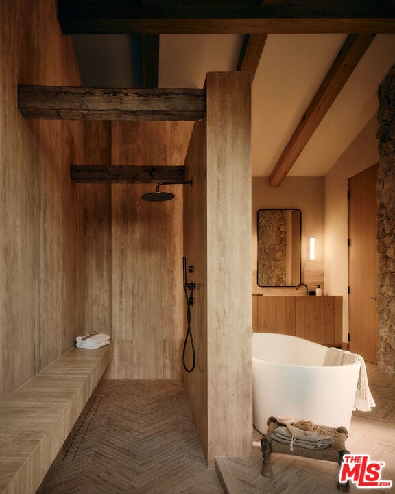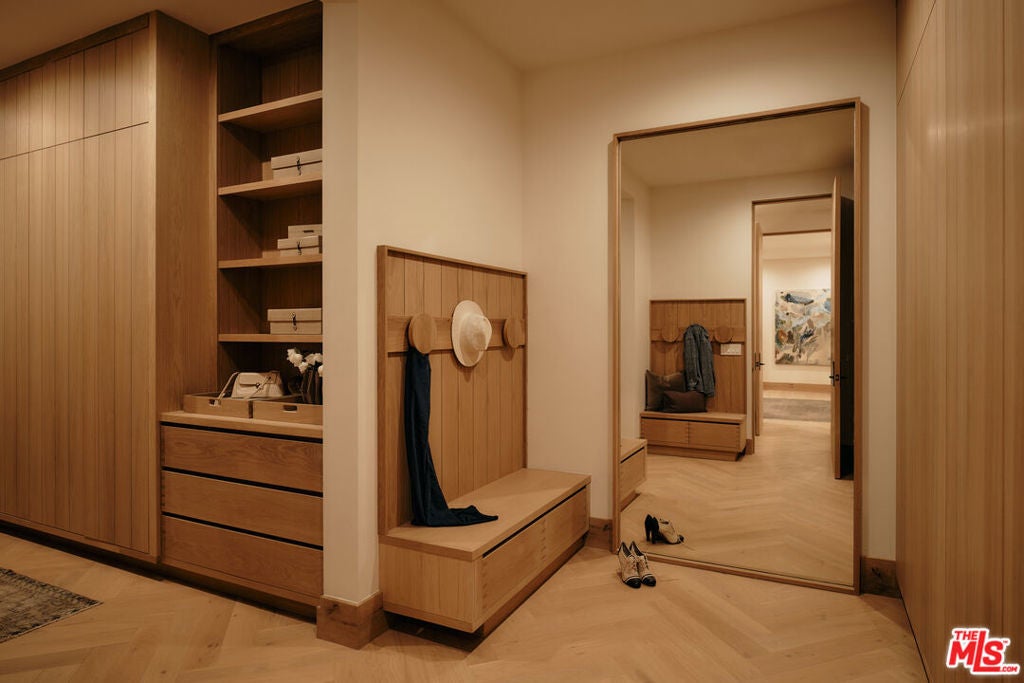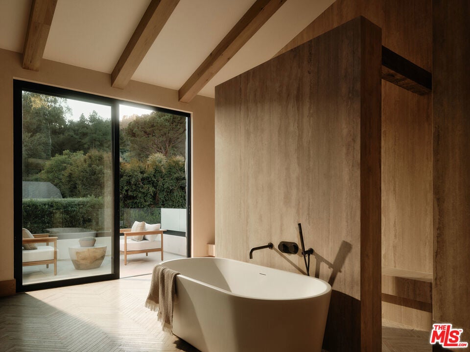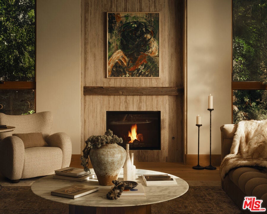 JVE Development Group and Jae Omar present Villa Antica, a newly built architectural residence in Brentwood, designed to evoke the feeling that it has stood gracefully in place for generations. Rooted in classical European influence and realized through a contemporary lens, the home is defined by natural materials, measured lines, and artisan craftsmanship. Offering an uncommon sense of privacy and scale, the residence spans five-bedrooms, six-bathrooms, and sits on a generous 9,618-square-foot parcel. A dramatic double-height entry sets the tone, unfolding into a series of thoughtfully composed living spaces crafted for both daily life and elevated entertaining. Interiors are filled with warm natural light and layered with textured woods, rough-hewn stone, and bespoke millwork. Reclaimed beams over 200 years old bring authenticity and depth, while leathered travertine and brass detailing reinforce a tactile richness. Sculptural lighting design creates a curated ambiance in the expansive great room, which flows effortlessly to the lush backyard through a wall of disappearing glass. At the heart of the home, the kitchen draws inspiration from the French countryside, blending beauty and utility with premium built-in appliances, a substantial center island, oak cabinetry, and a walk-in pantry. The kitchen opens to a sophisticated family room set around a floor-to-ceiling fireplace, while the adjacent dining room is complemented by a custom wet bar. Additional amenities include a glass-enclosed executive office, an immersive home theater, and a distinctive powder room featuring a 1920s French marble sink -- subtly reinforcing the home's collected, old-world narrative. Ascend the floating staircase to the primary suite with a private terrace overlooking the manicured grounds. Vaulted ceilings and a two-way stone fireplace frame this serene retreat that includes a wet bar, boutique dressing room, and luxurious bath. Four additional en-suite bedrooms, with one on the main level, complete the home. Fully integrated Control4 Home Automation System, surround sound, and security cameras facilitate contemporary connectivity and functionality while remaining discreetly in the background. Meticulous landscaping design by Double Green Landscapes extends the home's sense of permanence outdoors while providing privacy, ample space for gathering, and seamless incorporation of resort-like amenities. The tranquil backyard setting is secluded by mature hedging and features a pool and spa with automatic cover, a fully equipped outdoor kitchen, firepit, and multiple areas to lounge or dine alfresco. Ideally located in Brentwood, Villa Antica is a rare architectural offering where old-world influence and modern design converge in a home that feels both new and enduring.