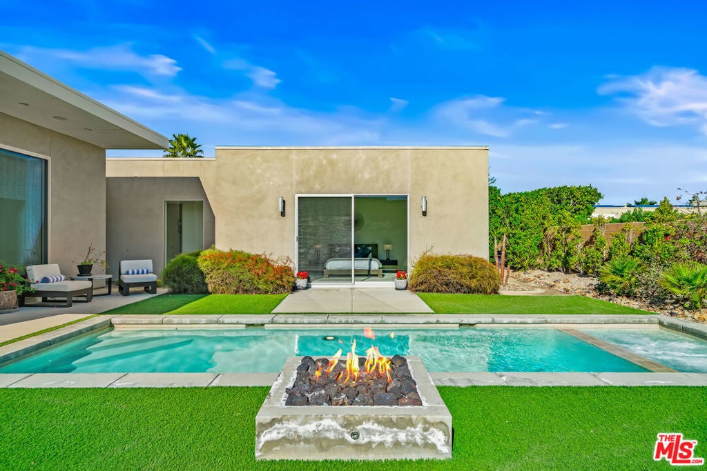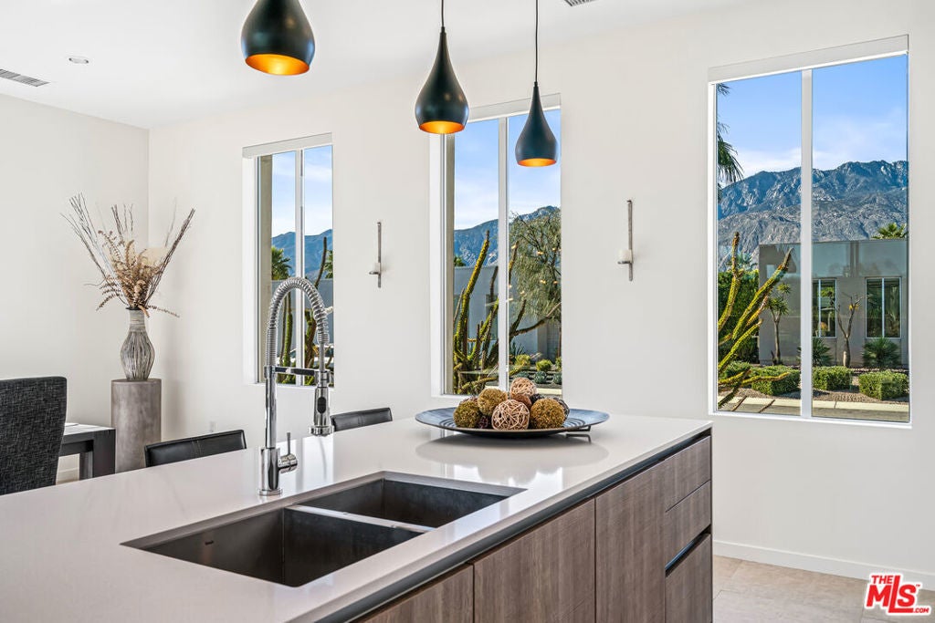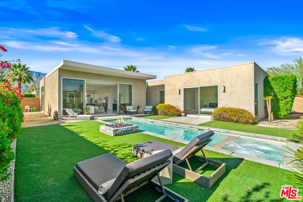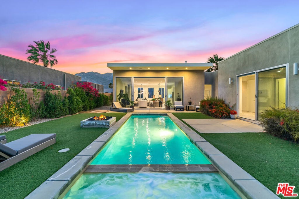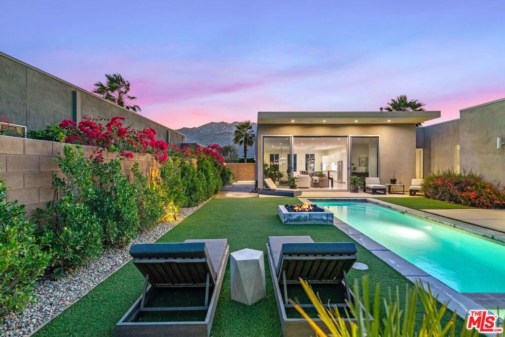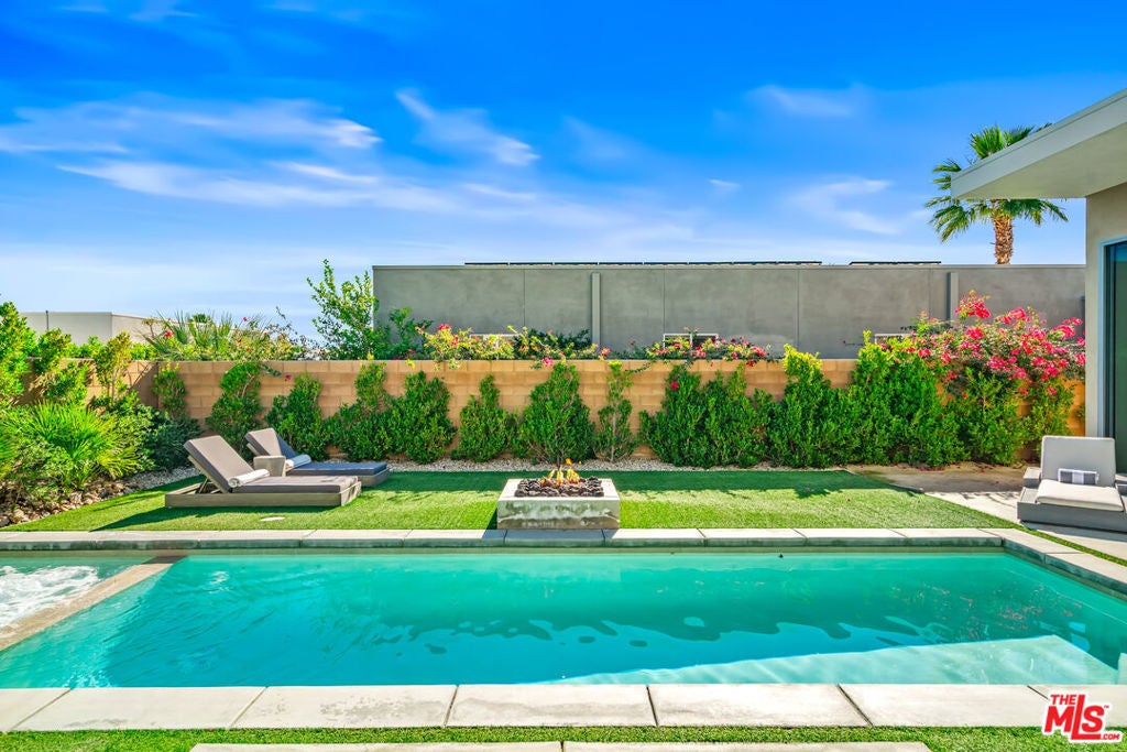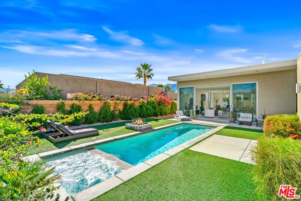 Experience elevated desert living at Escena in this luxury residence designed by renowned architect Anthony Poon and built by Alta Verde. The sought-after Garden floor plan is designed for seamless indoor/outdoor living, featuring a wall of floor-to-ceiling Fleetwood sliding doors that open from the living room to a private entertainer's backyard with pool, spa, fire-pit and breathtaking San Jacinto Mountain views. The expansive great room offers 10-foot ceilings, elegant tile flooring, and abundant natural light. The gourmet kitchen is a showpiece with an oversized island, designer pendant lighting, custom countertops and backsplash, Bosch appliances, and sleek Italian cabinetry perfect for both entertaining and everyday living. The sun-filled primary suite is a peaceful retreat with a spacious walk-in closet and spa-like bathroom featuring a floating dual-sink vanity, soaking tub, and walk-in shower. Two well-appointed guest bedrooms share a generous Jack-and-Jill bathroom, ideal for guests or family. Additional highlights include owned solar, Control4 Home system, dual-zone HVAC, home security system, and a two-car garage equipped with an upgraded electric vehicle charger. Escena is a beautifully landscaped guard-gated community offering access to a clubhouse, championship golf course, dog parks, and low HOA dues. Select furnishings available. (See photos, floor-plan & 3D Matterport)