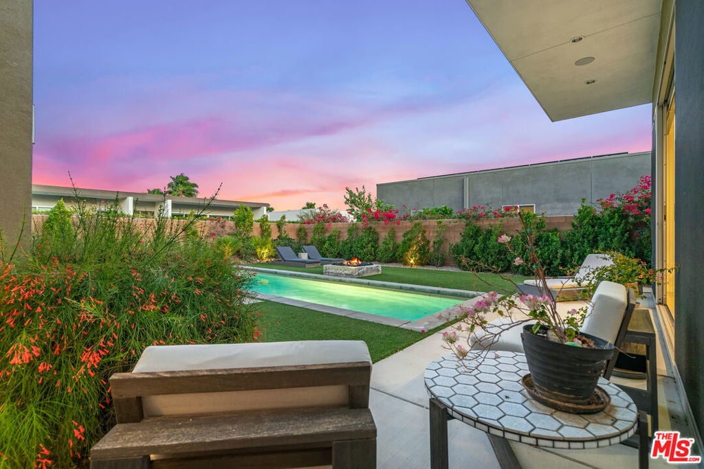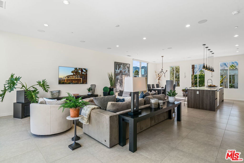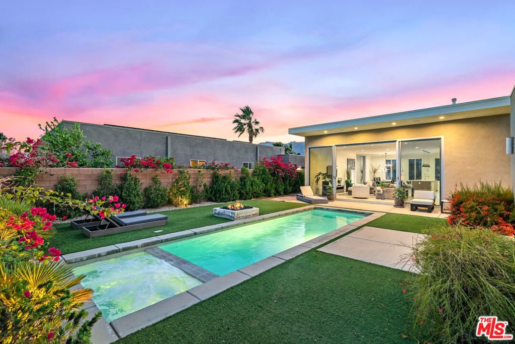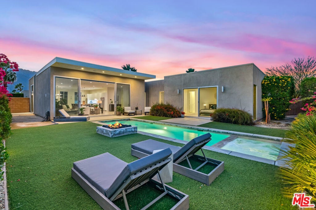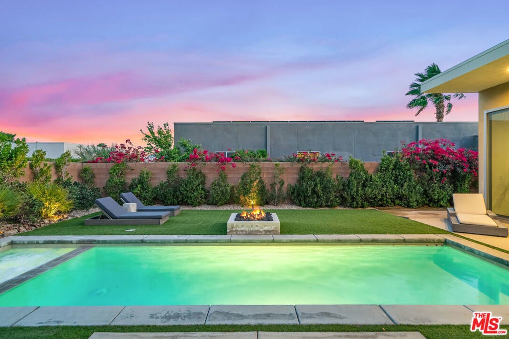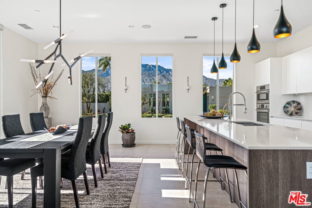 Experience elevated desert living at Escena in this luxury residence designed by renowned architect Anthony Poon and built by Alta Verde. The sought-after Garden floor plan is designed for seamless indoor/outdoor living, featuring a wall of floor-to-ceiling Fleetwood sliding doors that open from the living room to a private entertainer's backyard with pool, spa, fire-pit and breathtaking San Jacinto Mountain views. The expansive great room offers 10-foot ceilings, elegant tile flooring, and abundant natural light. The gourmet kitchen is a showpiece with an oversized island, designer pendant lighting, custom countertops and backsplash, Bosch appliances, and sleek Italian cabinetry perfect for both entertaining and everyday living. The sun-filled primary suite is a peaceful retreat with a spacious walk-in closet and spa-like bathroom featuring a floating dual-sink vanity, soaking tub, and walk-in shower. Two well-appointed guest bedrooms share a generous Jack-and-Jill bathroom, ideal for guests or family. Additional highlights include owned solar, Control4 Home system, dual-zone HVAC, home security system, and a two-car garage equipped with an upgraded electric vehicle charger. Escena is a beautifully landscaped guard-gated community offering access to a clubhouse, championship golf course, dog parks, and low HOA dues. Select furnishings available. (See photos, floor-plan & 3D Matterport)