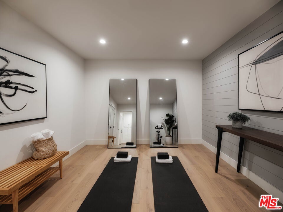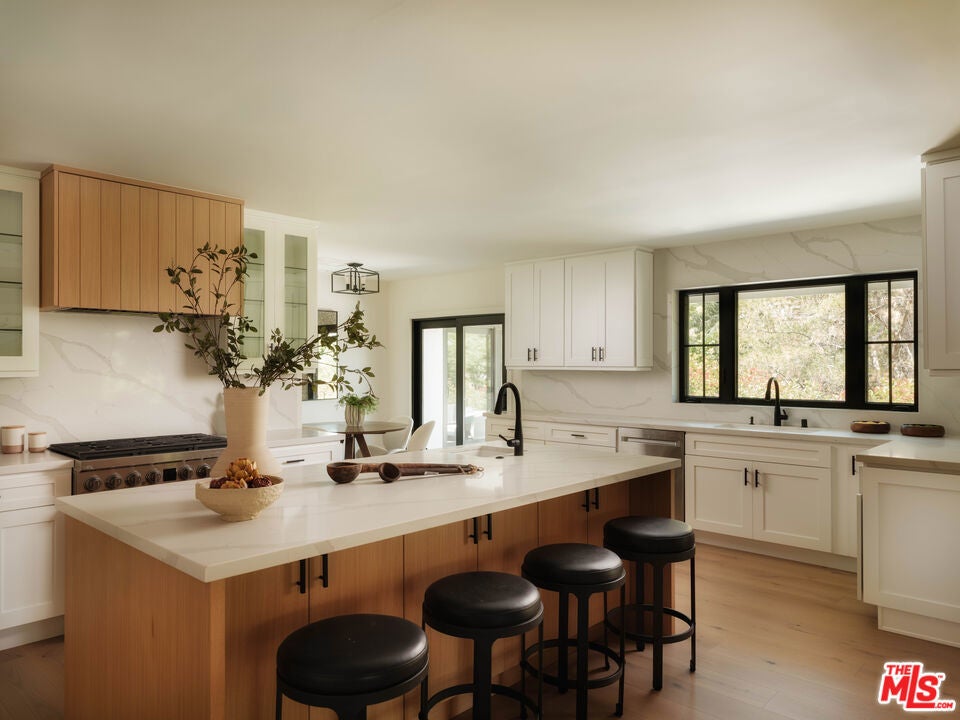 Welcome to this sophisticated transitional home, completely reimagined in 2023 with clean, modern finishes and a layout designed for effortless living. Nestled in one of Sherman Oaks' most desirable south-of-the-boulevard pockets, this home offers a perfect blend of comfort, style, and function, surrounded by lush, mature landscaping that creates a true sense of privacy and tranquility. Inside, you'll find an inviting open floor plan ideal for entertaining. Soaring vaulted wood-clad ceilings, wide-plank flooring, and expansive windows create a light-filled, welcoming atmosphere. The living spaces flow effortlessly from the elegant dining area to the spacious living room with a custom fireplace, and onward to the stunning chef's kitchen featuring custom cabinetry, stone counters, and a large center island with seating for four. Four generously sized bedrooms and beautifully updated bathrooms ensure ample space for family and guests. Just off the garage entry level, a versatile workout studio offers the perfect space for fitness, yoga, or a creative studio. Outdoors, enjoy the lush landscaping that wraps the property in natural beauty, with multiple spots to relax or entertain. The home also offers access to AT&T Fiber Internet for reliable high-speed connectivity, making it as practical as it is comfortable. *** Owner is open to discussing seller financing with qualified buyers ***