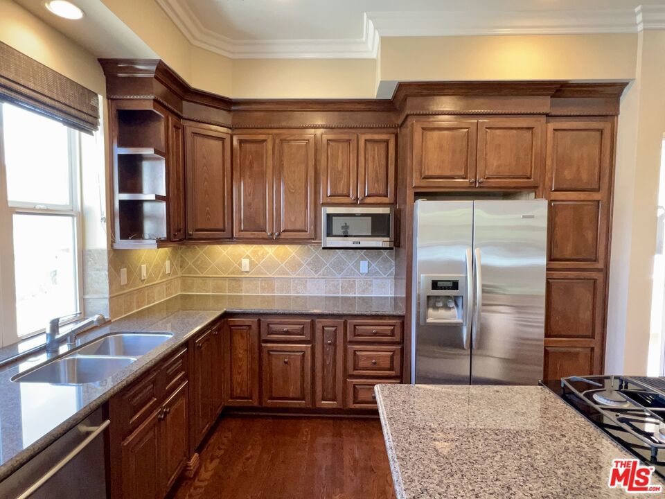 Available for lease, this luxury 3-story Mediterranean townhouse in Culver City offers 2 bedrooms, 2.5 bathrooms, and over 2,200 square feet of refined living space with premium finishes throughout. Ideally located near the heart of Culver City, this spacious townhouse provides convenient access to shopping, dining, parks, and major Westside destinations.The home features a formal entry with a dramatic curved staircase and rich dark hardwood floors that flow through the main living areas. The open-concept living and dining room includes a dual-sided fireplace, creating a warm and inviting atmosphere ideal for both everyday living and entertaining.The gourmet kitchen is equipped with granite countertops, stainless steel appliances, a center island with built-in cooktop, and ample cabinetry. Adjacent to the kitchen, the family room opens to a large covered patio, perfect for indoor-outdoor living.The primary suite occupies the entire top level, offering exceptional privacy and features a spa-style bathroom with soaking tub, fireplace, large walk-in closet, and a private open balcony. The second bedroom, located on the lower level, includes a full en-suite bathroom, walk-in closet, and direct access to the attached 2-car garage with additional storage.Additional highlights include central air conditioning and heating, central vacuum system, crown molding and detailed baseboards throughout, and in-unit washer and dryer. This well-maintained Culver City townhouse for lease combines luxury, space, and an unbeatable location close to everything the Westside has to offer.