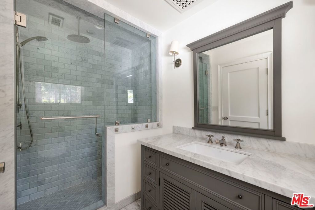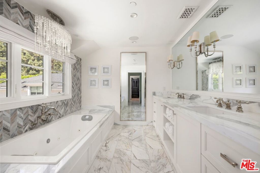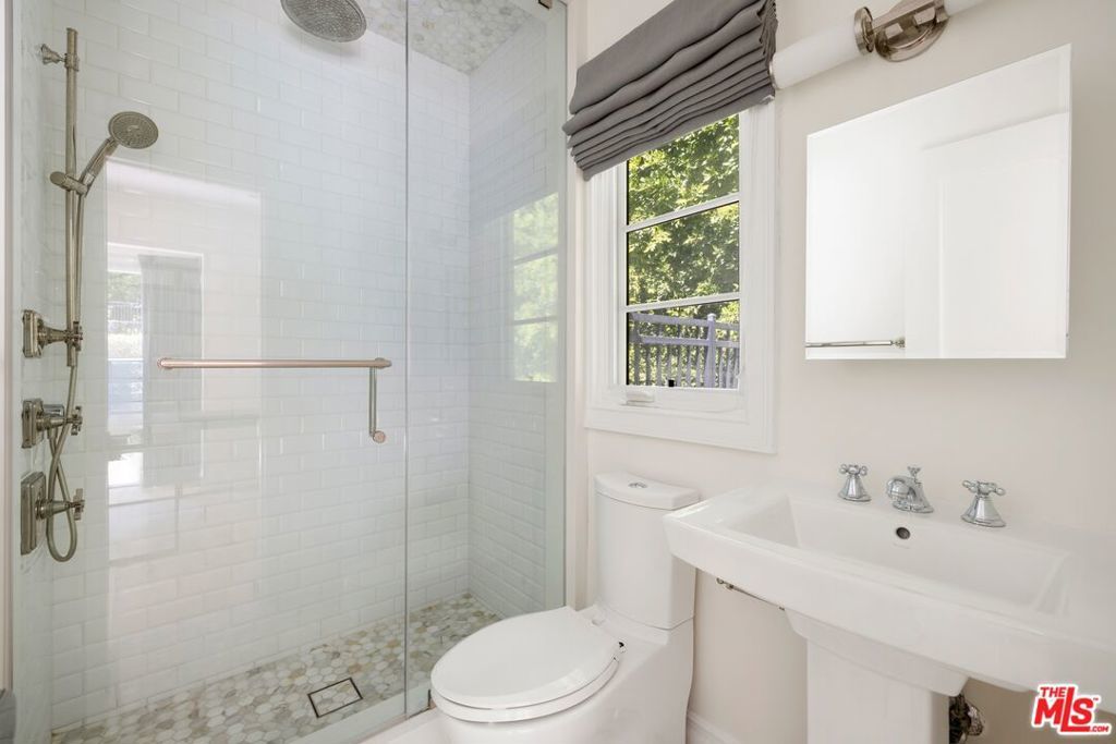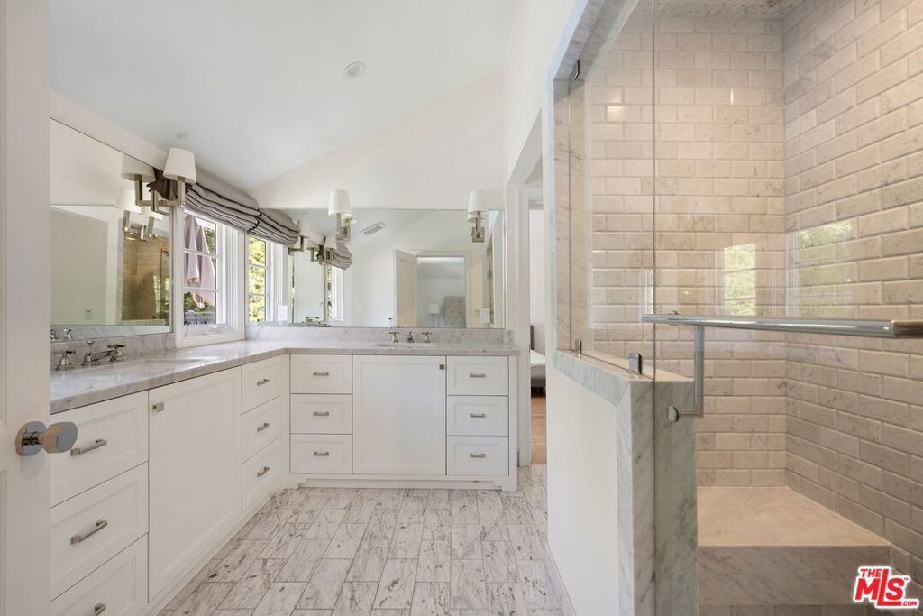Set behind a large motor court on an expansive private lot, this fully furnished Paul Williams-style residence is a rare Beverly Hills retreat designed for effortless entertaining. The gracious main level unfolds through a formal living room with a fireplace and light-filled bay window, a formal dining room, and a secondary living room featuring a fireplace, custom built-ins, and disappearing glass doors that open directly to the outdoor living areas - creating a coveted indoor-outdoor flow. The marble-clad kitchen is outfitted with stainless steel appliances, including a Wolf range, and opens to a breakfast area, while a spiral staircase leads to the second level. Upstairs, the luxurious primary suite offers vaulted ceilings, a private balcony, and a spa-like en suite bath, complemented by well-appointed guest rooms throughout the home. Thoughtfully designer-decorated, the property includes five bedrooms and four-and-a-half baths, plus a fully detached one-bedroom guest house of approximately 700 square feet with its own kitchen. The resort-style grounds feature a full-size basketball court, pickleball court, pool, and direct private access to nearby hiking trails, all just moments from the best of Beverly Hills shopping, dining, and entertainment.