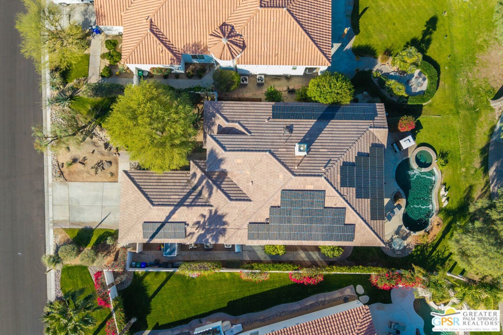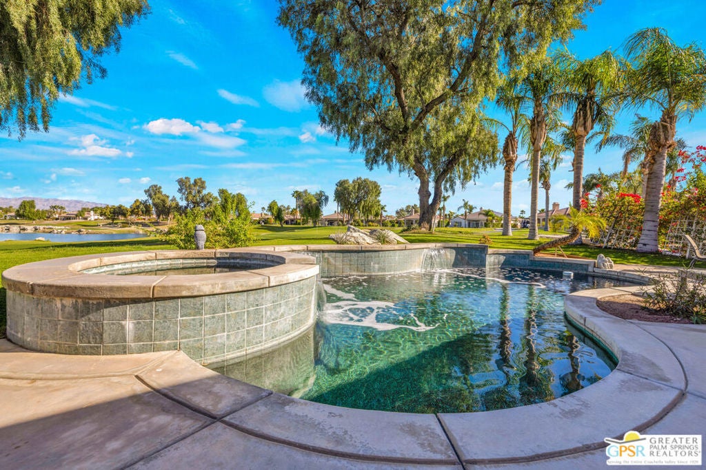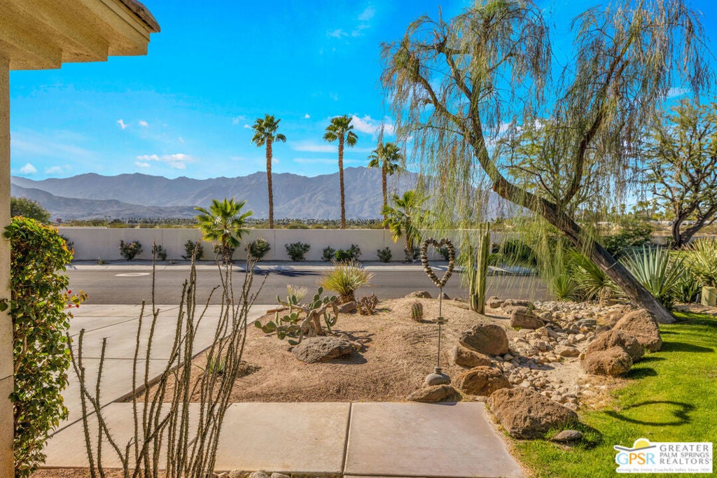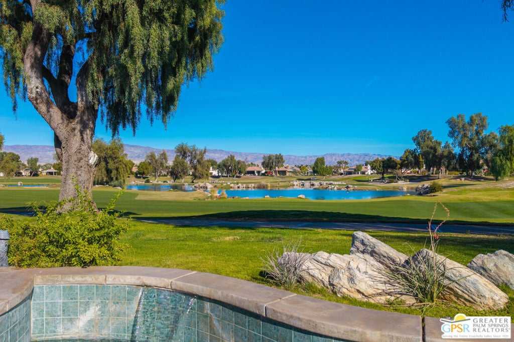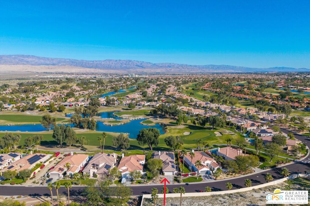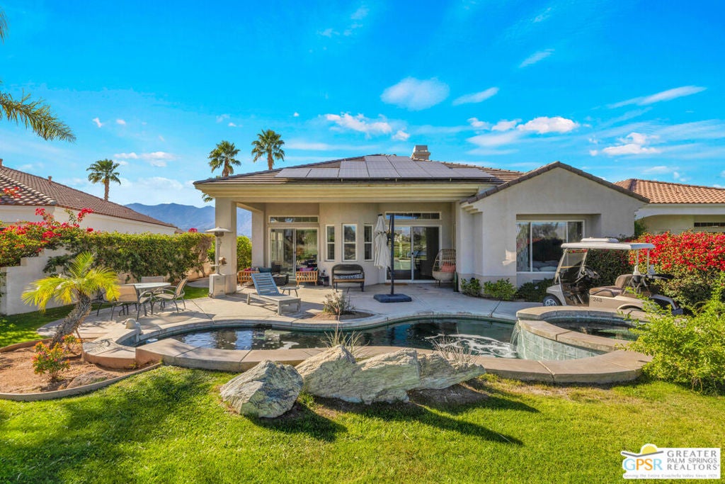 A true backyard oasis situated directly on the golf course, with expansive fairway and mountain views. Enjoy relaxed desert living with a private pool and spa, creating the perfect outdoor retreat. Inside, high ceilings enhance the open floor plan, offering a light and airy feel throughout. The dining area flows seamlessly into a chef's kitchen featuring granite countertops, black stainless steel appliances, a center island, breakfast bar, dinning area, and ample cabinetry. Additional features include a water softener system, instant hot water throughout, newer dual-zone HVAC units, and a leased 48-panel solar system (Power Purchase Agreement) that produces power well beyond the current homeowner's usage. The primary suite offers direct patio access and a spa-like bath with walk-in glass-enclosed shower, soaking tub, dual vanities, and two walk-in closets. Guest bedrooms are thoughtfully separated from the primary suite. This home is part of a beautifully maintained, guard-gated community with additional roving security and low HOA dues. HOA benefits include cable TV, lighted tennis and pickleball courts, a community pool/spa, and concierge trash service. Whether full-time or seasonal, this home offers the best of desert living in the heart of Rancho Mirage.