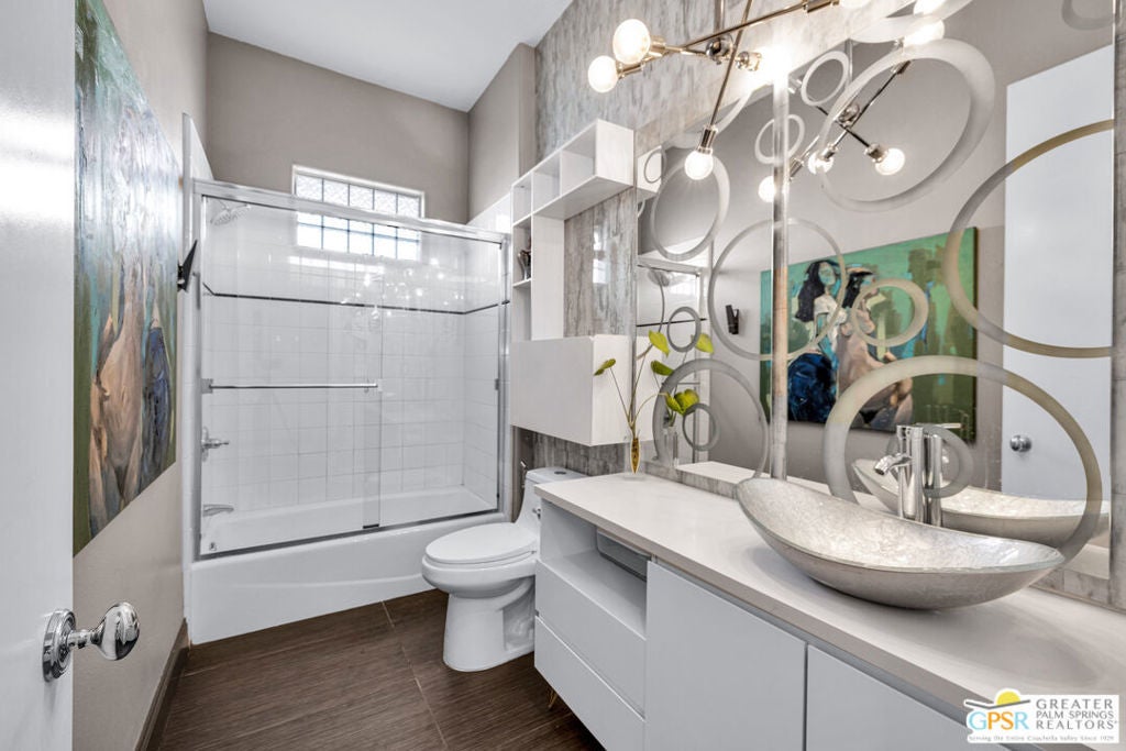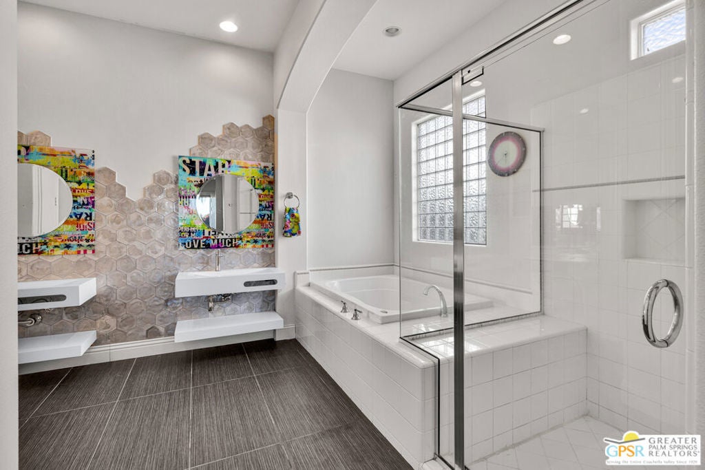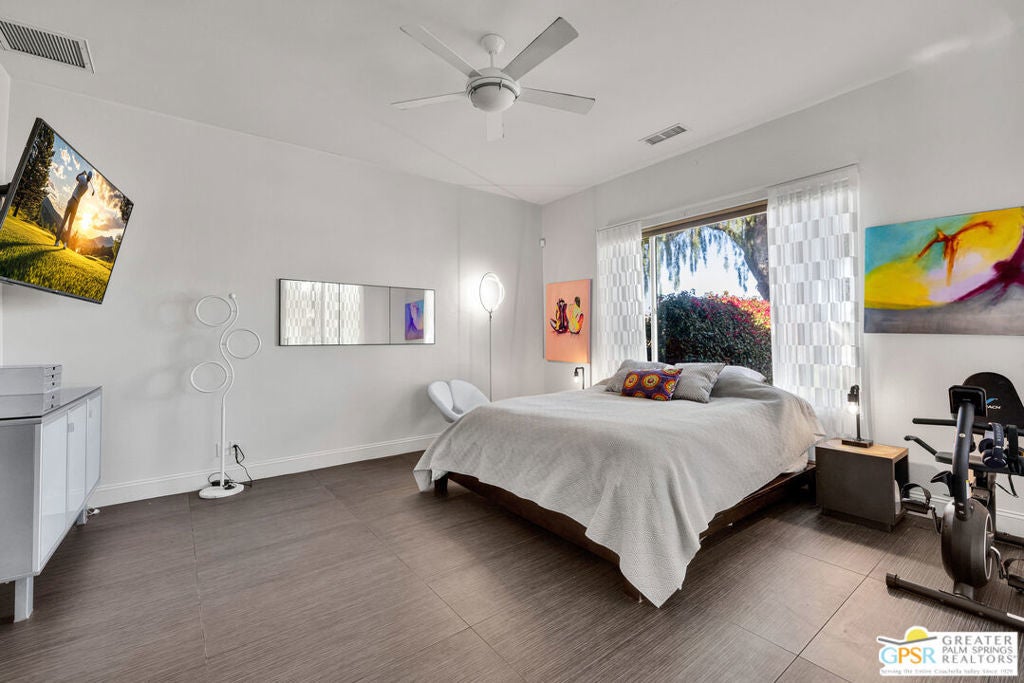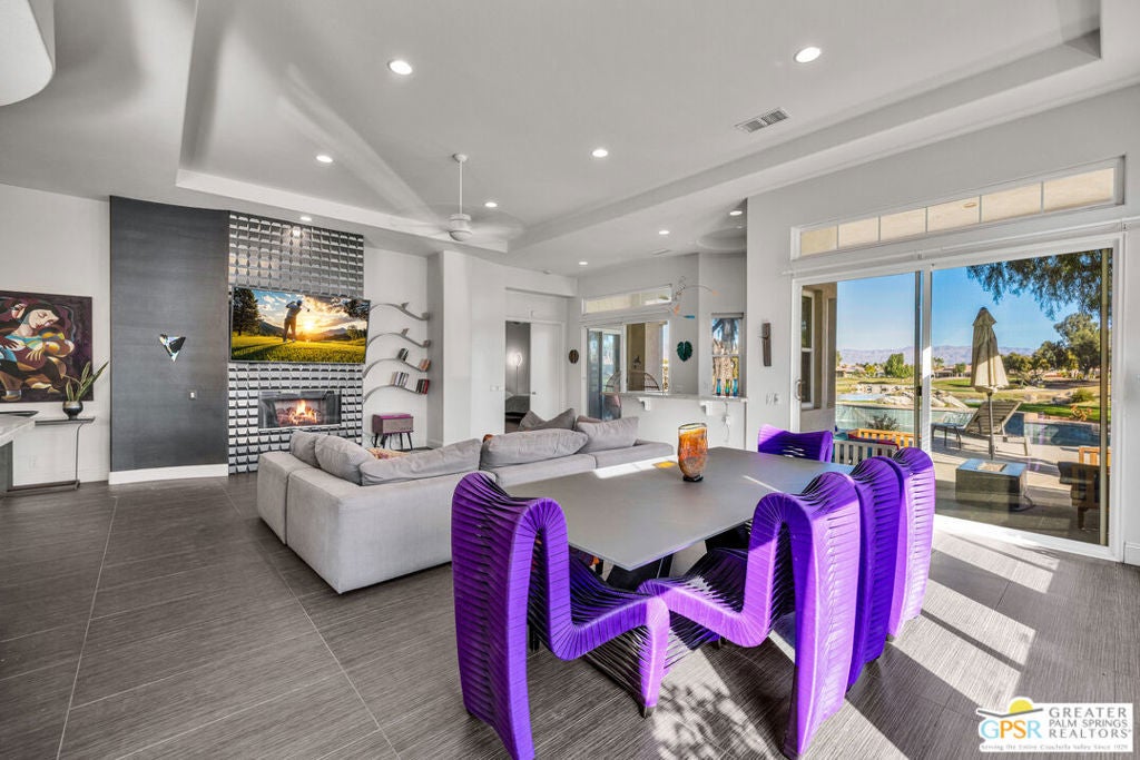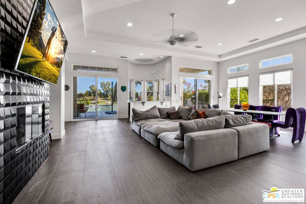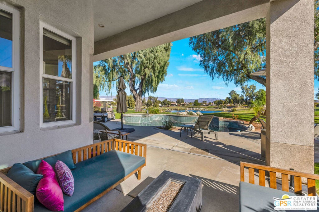 A true backyard oasis situated directly on the golf course, with expansive fairway and mountain views. Enjoy relaxed desert living with a private pool and spa, creating the perfect outdoor retreat. Inside, high ceilings enhance the open floor plan, offering a light and airy feel throughout. The dining area flows seamlessly into a chef's kitchen featuring granite countertops, black stainless steel appliances, a center island, breakfast bar, dinning area, and ample cabinetry. Additional features include a water softener system, instant hot water throughout, newer dual-zone HVAC units, and a leased 48-panel solar system (Power Purchase Agreement) that produces power well beyond the current homeowner's usage. The primary suite offers direct patio access and a spa-like bath with walk-in glass-enclosed shower, soaking tub, dual vanities, and two walk-in closets. Guest bedrooms are thoughtfully separated from the primary suite. This home is part of a beautifully maintained, guard-gated community with additional roving security and low HOA dues. HOA benefits include cable TV, lighted tennis and pickleball courts, a community pool/spa, and concierge trash service. Whether full-time or seasonal, this home offers the best of desert living in the heart of Rancho Mirage.