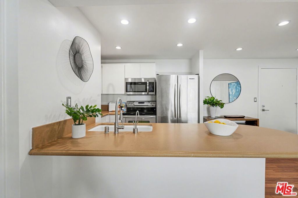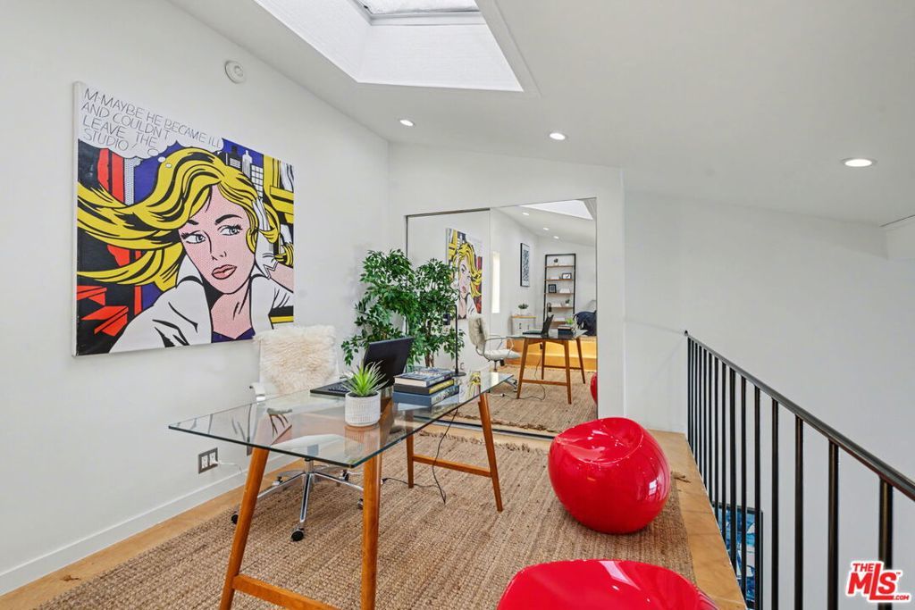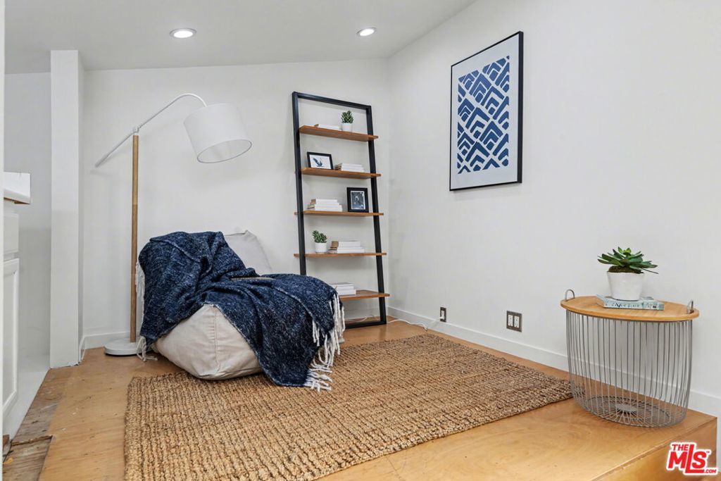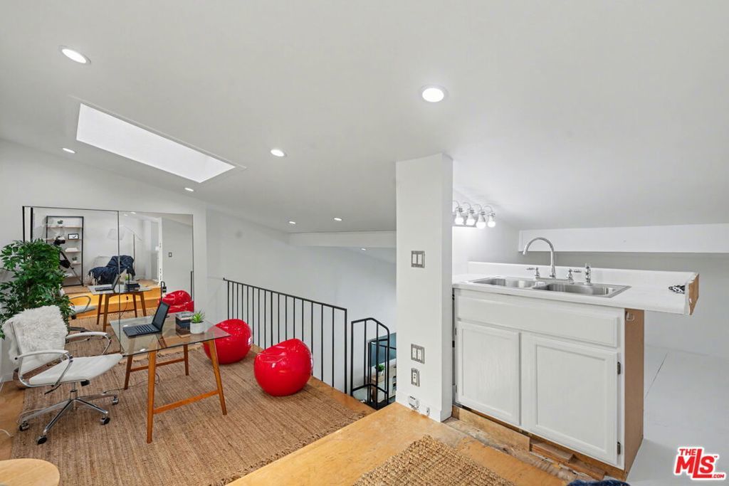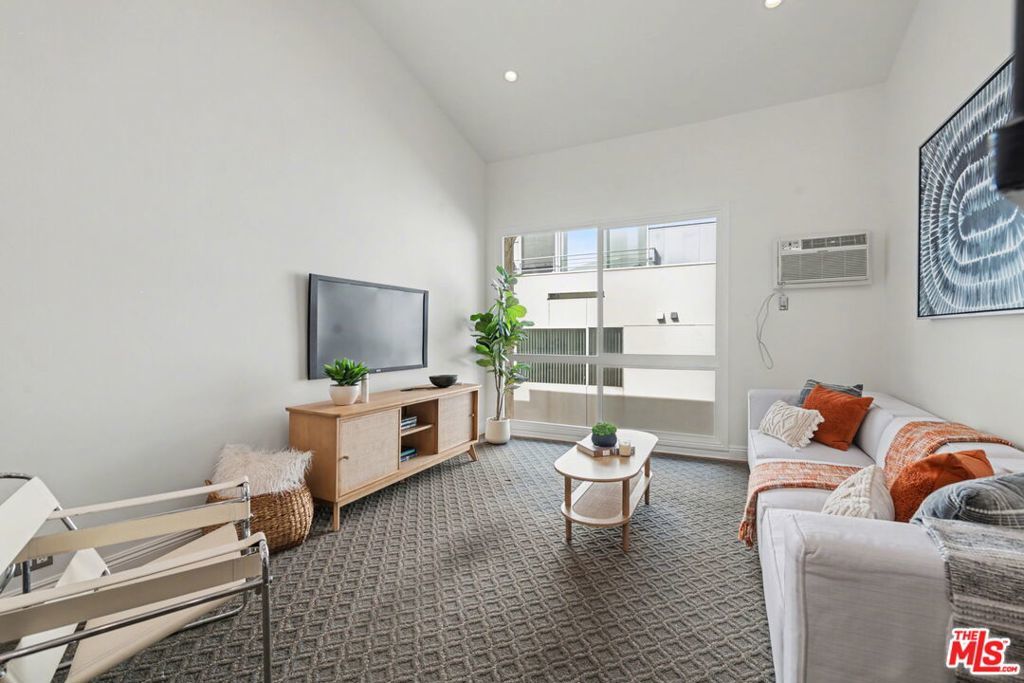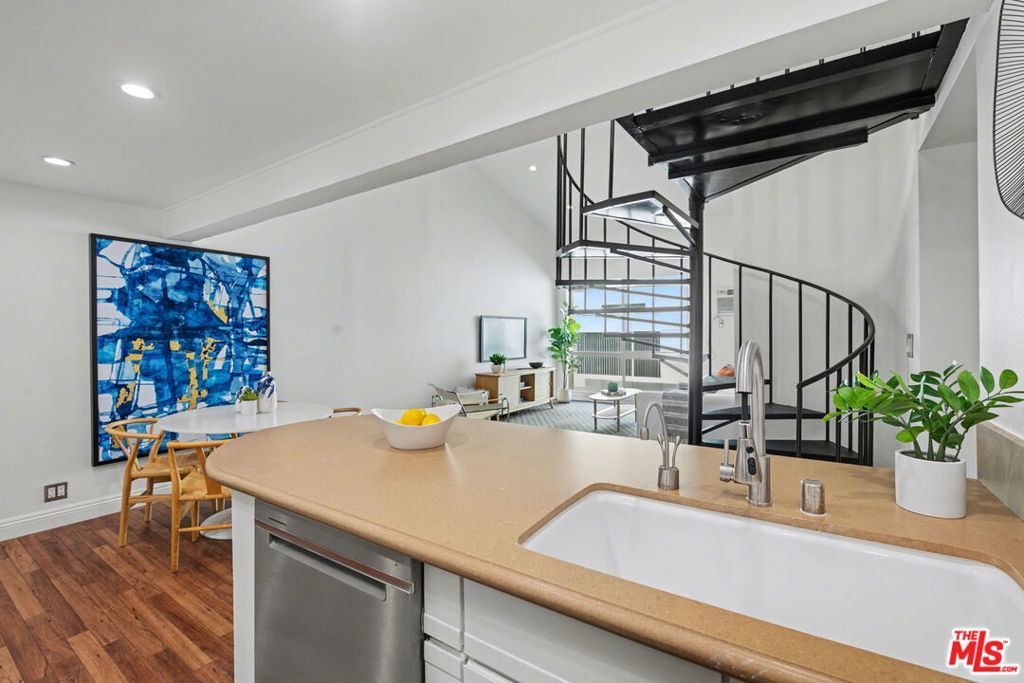 Desired Top floor 2 bed/1 bath corner-unit on quiet backside of The Colony at Westwood, with secured entry, updated pool/spa/gym/laundry, lounge and recreation room. 2 level unit with open floor plan that includes high ceilings, recessed lighting in living room, kitchen with quartz countertops, stainless steel appliance and breakfast bar. 1 bedroom on main level with 2 closets and updated full bath with floating sink and tile finishes. Spiral staircase leads to 2nd bedroom/open loft area with skylight and hardwood floors. Extra bonus space upstairs ideal for office/storage. Pets ok, secured 1 parking space in front garage, common area EV charging, common area laundry. Ideal proximity to UCLA and Westwood Village retail and restaurants, Westwood Recreation Center, Tennis and Park, Westfield Century City and Beverly Hills. Move-in ready!