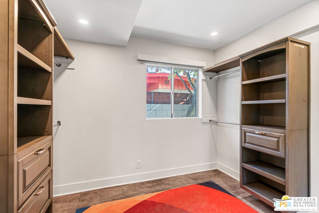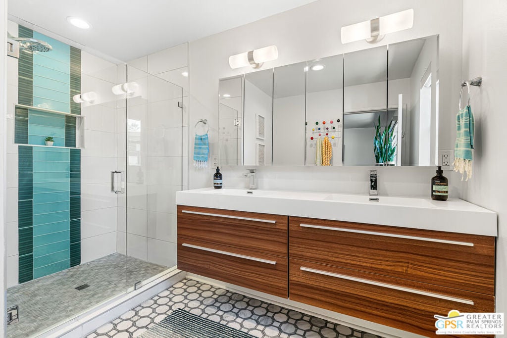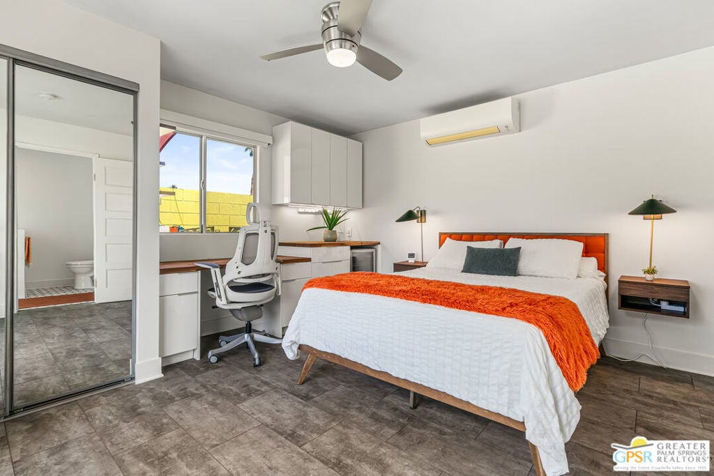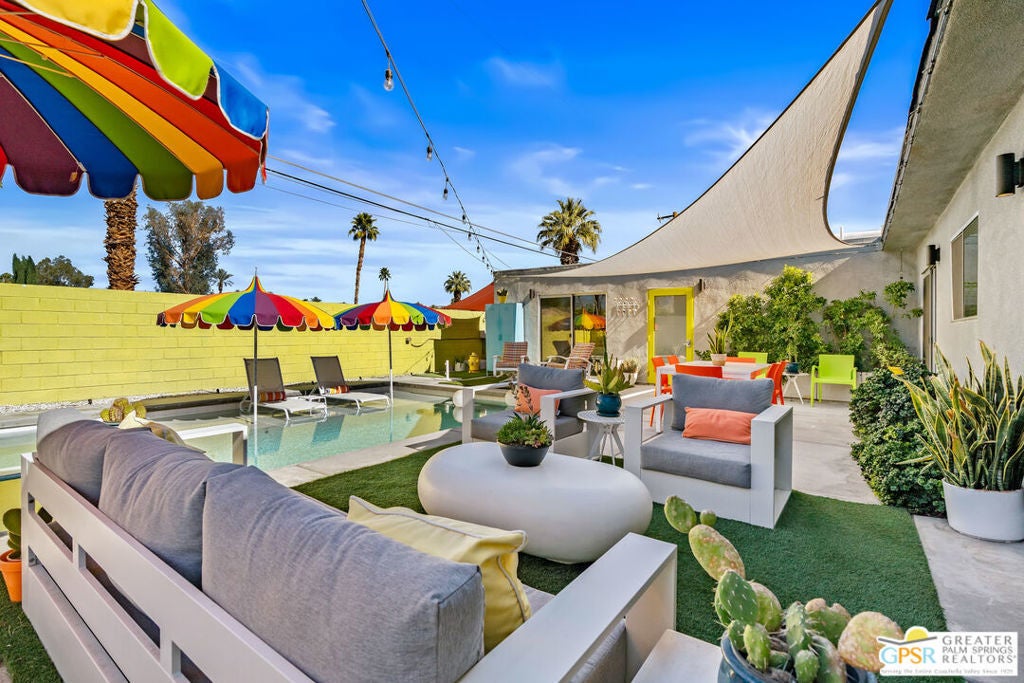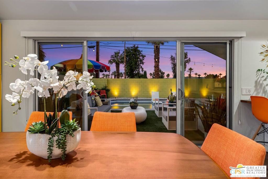 Meticulously maintained and beautifully remodeled, this mid-century smart home blends timeless architectural character with thoughtful modern updates. Convenient to shopping, dining, and entertainment, the flexible floor plan offers six bedrooms and five baths, thoughtfully arranged to support today's evolving lifestyle. Select bedrooms are currently utilized as a home office and exercise room, providing versatility without compromising comfort. The detached casita serves as one of the home's six bedrooms and bathrooms, offering a spacious retreat with built-in cabinets, a desk, and room for a bed. The updated bath and additional laundry hookup enhance both comfort and convenience, making it ideal for guests or extended stays. Clean mid-century lines pair beautifully with contemporary finishes, vibrant pops of color, and curated design details that create a stylish, design-forward atmosphere throughout the home. The dining area is highlighted by a coffee bar featuring two wine refrigerators seamlessly integrated into the space, along with abundant cabinetry that offers generous storage for both daily living and entertaining. Just beyond, the kitchen showcases newer appliances, a walk-in pantry, and extensive cabinetry, delivering both functionality and visual appeal. Open living spaces flow effortlessly, creating an inviting environment for everyday living and hosting gatherings alike. Designed as a private retreat, the expansive primary suite features a spacious walk-in closet and sliding glass doors that open directly to the backyard, fostering a seamless indoor-outdoor connection. The en-suite bath complements the space with sleek floating dual vanities and refined finishes that elevate the overall aesthetic. Outdoor living captures the essence of the desert lifestyle, complete with a sparkling pool and spa, multiple areas for gathering, and beautiful mountain views that provide a stunning backdrop for relaxation or entertaining. Owned solar adds energy efficiency and long-term value, making this Palm Desert home a rare offering that celebrates mid-century charm, modern comfort, and effortless indoor-outdoor living.