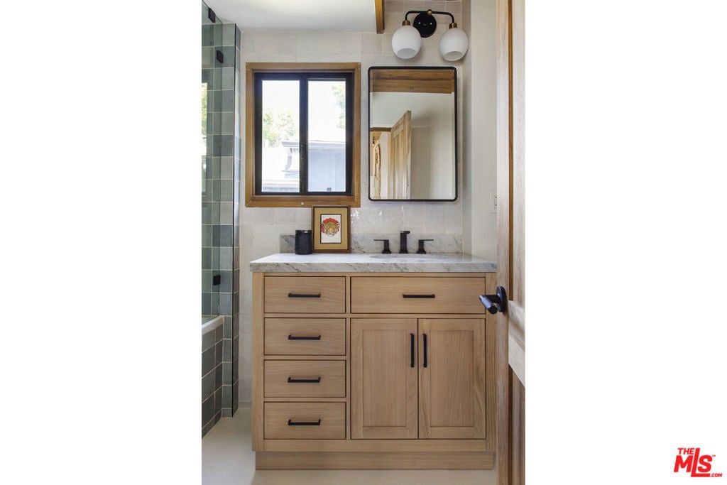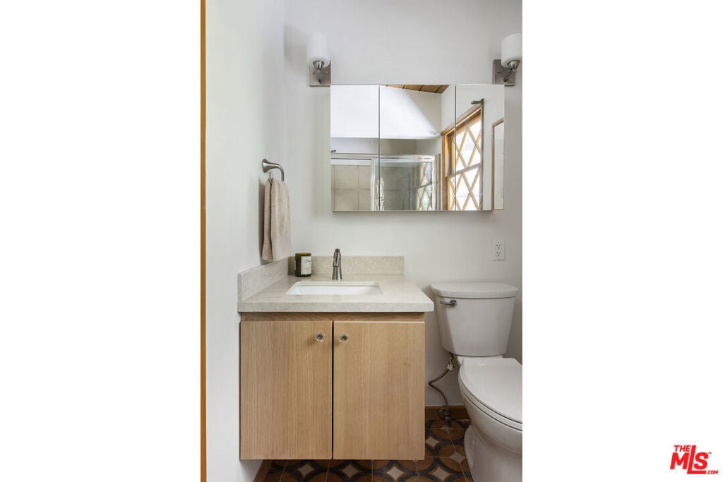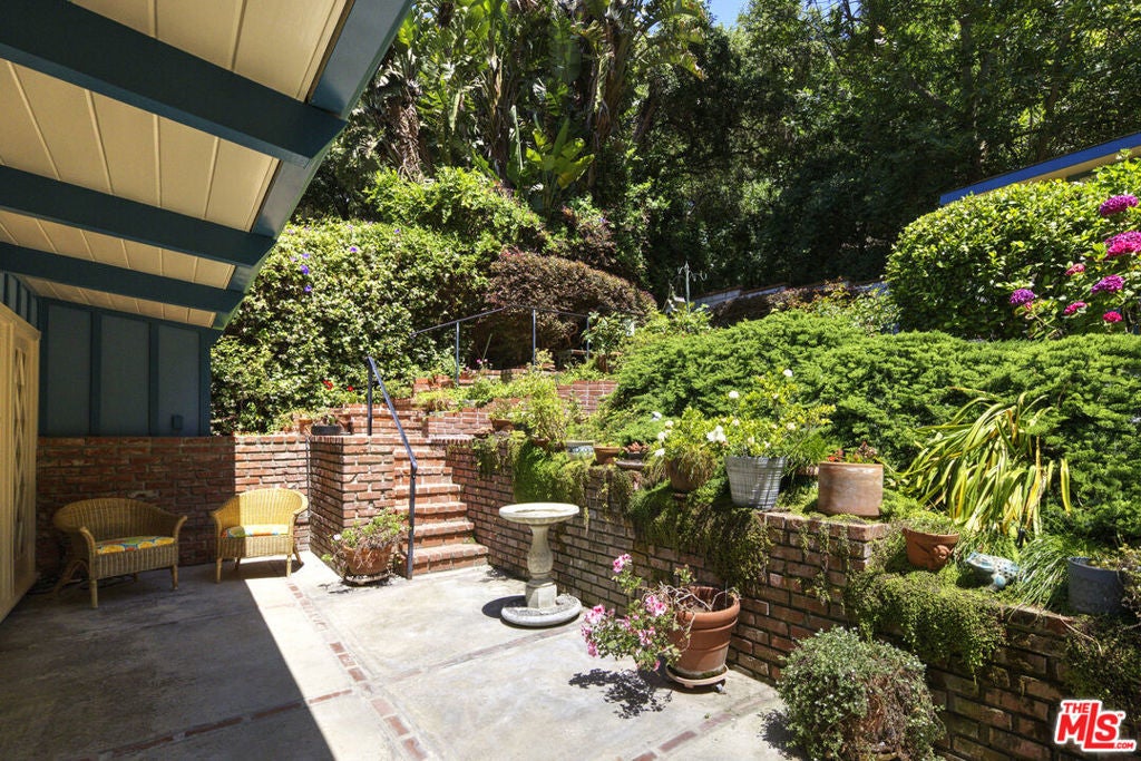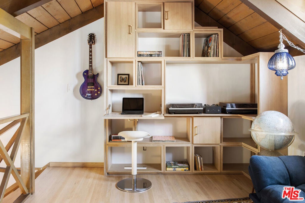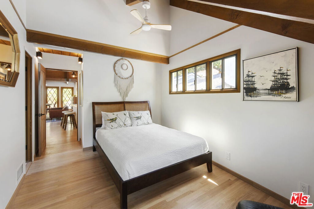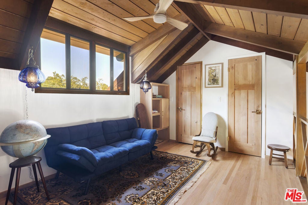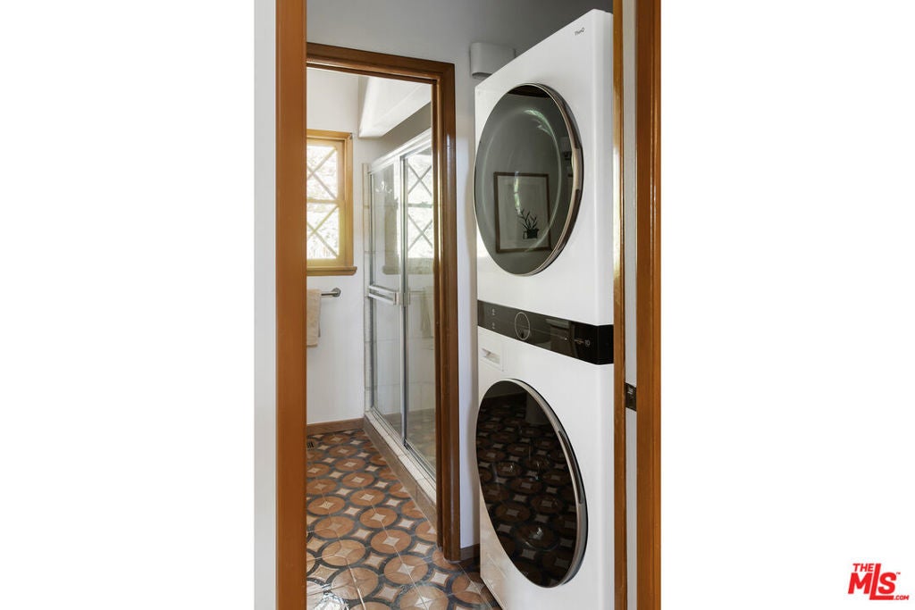 La Maison Bleue is a Mid-Century 1956 Storybook Cottage, perfectly sited in the Hollywood Hills. This Single Family Home has 3+ parking spaces, including a garage! Thoughtfully and completely remodeled to suit contemporary living while honoring its original charm. One bedroom plus a large **loft or second bedroom**. Warm, soft, and grounded in neutral tones, this home radiates tranquility. One must see in person to truly feel the magic. The brand-new kitchen is a chef's dream, featuring brand new high-end appliances, handmade custom White Oak cabinetry, and stunning Taj Mahal quartz countertops. Solid Oak floors flow seamlessly throughout the home. The primary bedroom includes a brand-new en-suite bathroom and a generous walk-in closet. A second full bathroom is conveniently located just off the living room. The laundry area, outfitted with a new LG Wash-tower system, is thoughtfully placed inside the home for ease and comfort. The second bedroom is a versatile loft space complete with a new closet and custom White Oak shelving units. It can easily be enclosed or enjoyed in its current open format, ideal as a guest room, office, or creative studio. Anchoring the living space is a striking brick fireplace wall, adding warmth and character. Step outside into a private Zen retreat: a blooming, auto-irrigated garden that's both enchanting and easy to maintain. At the top of the garden, a whimsical He-She Shed invites imagination and inspiration. Additional features include copper plumbing throughout, a brand-new 200-amp electrical panel, plus another 100-amp panel setup for a hot tub and sauna. This single-family residence offers the rare charm of a canyon cottage with the price tag of a WEHO condo but without the high monthly fee! Completely turn-key and ready to move in. This home is gorgeous!
